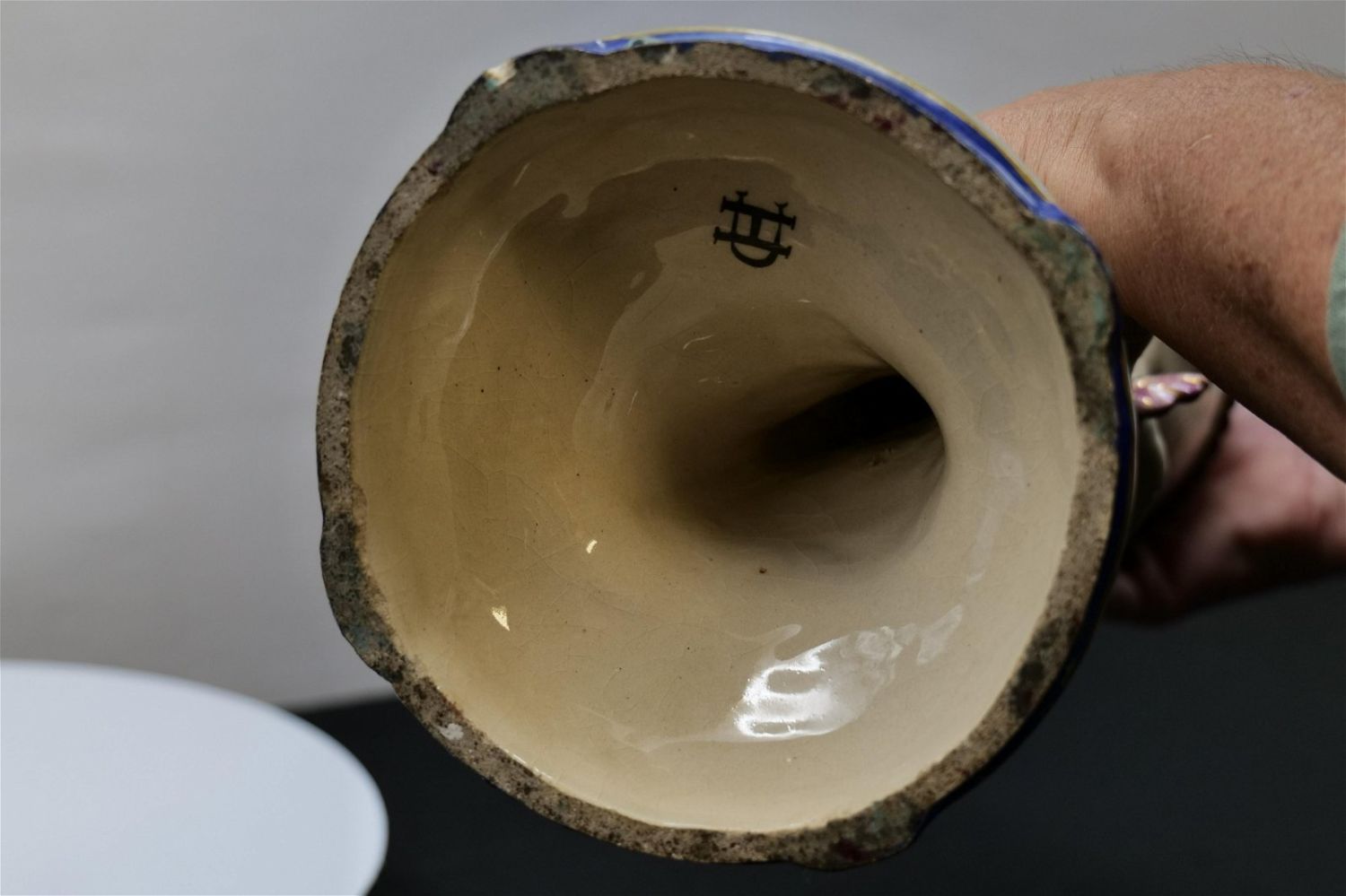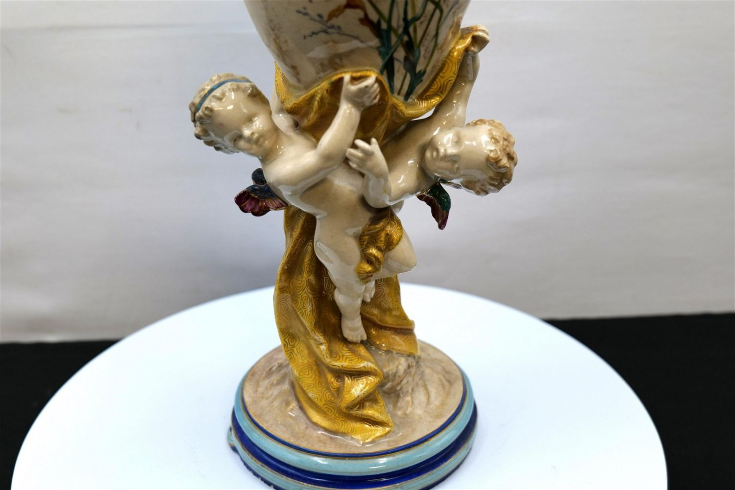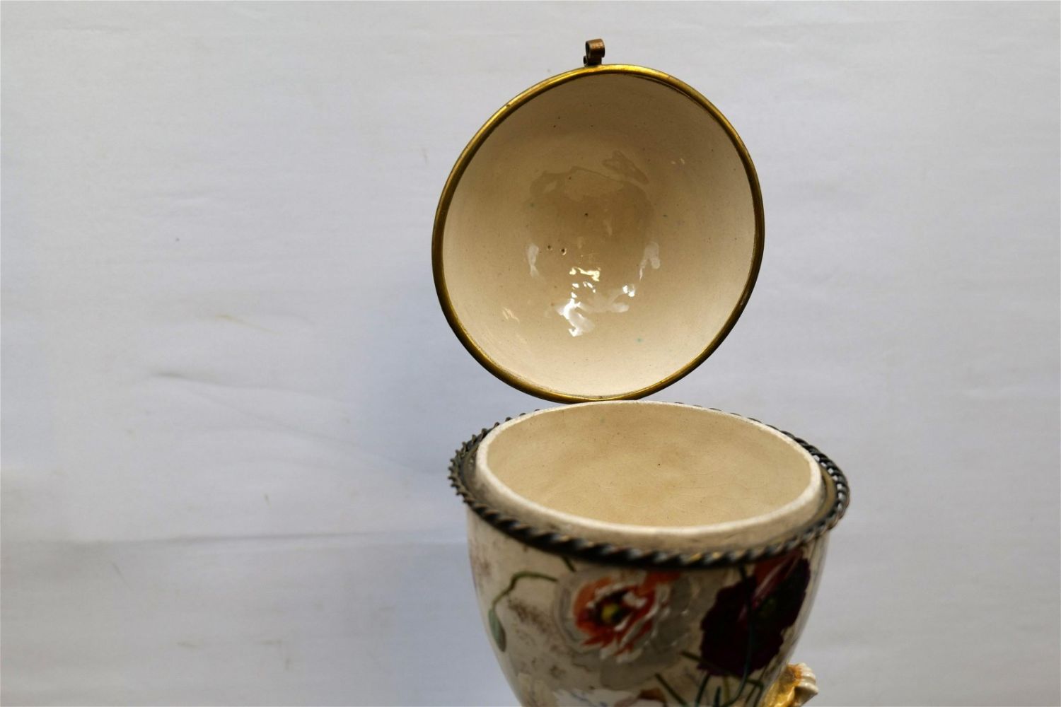 Majolica/Art Pottery Covered Egg Box on Pedestal. Has 2 Cherubs and Hinged Top. , Makers mark on bottom. Not sure of age. Believed to be mid to late 20th century. Measures 18" tall x 7" wide. All invoices must be paid within 24 hours of the sale. We offer multiple shipping options, please read the terms as they have changed. We also offer Pick-Ups Thursday, Friday, Saturday, and Monday immediately following the sale. BY APPOINTMENT ONLY. PLEASE READ THE NEW TERMS!!!