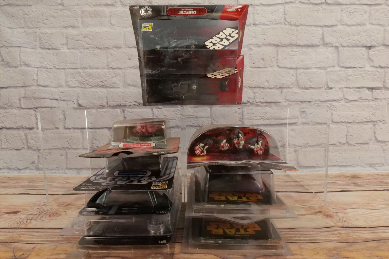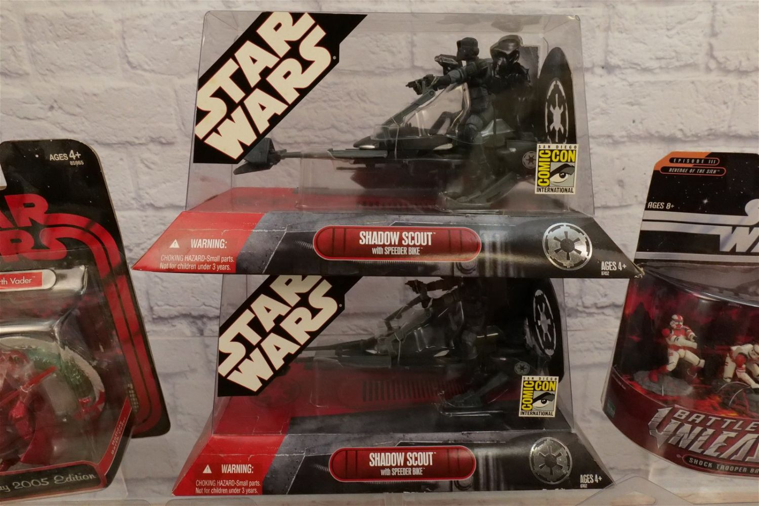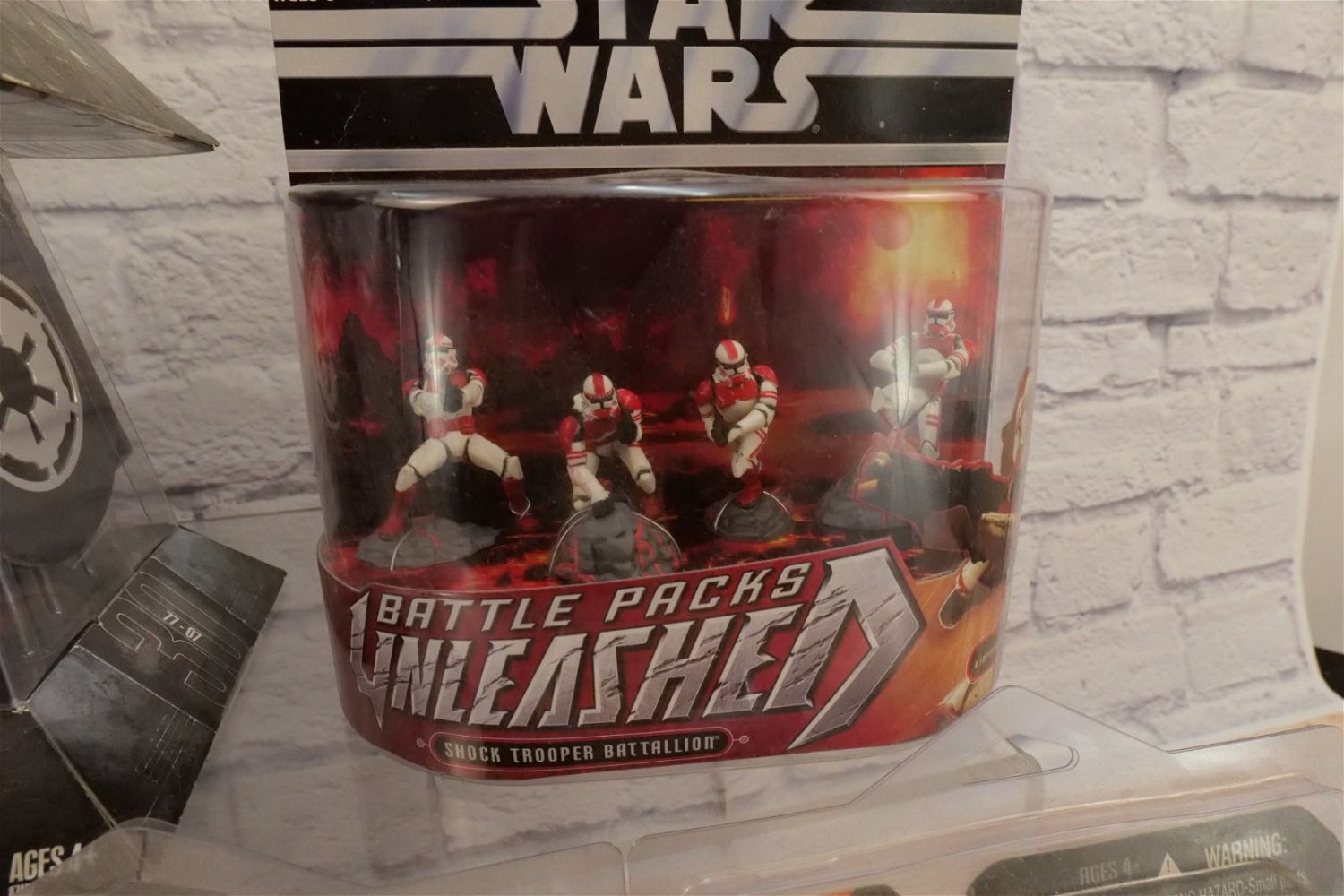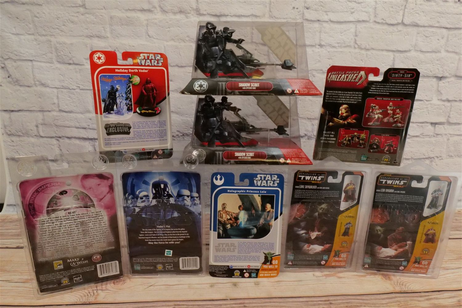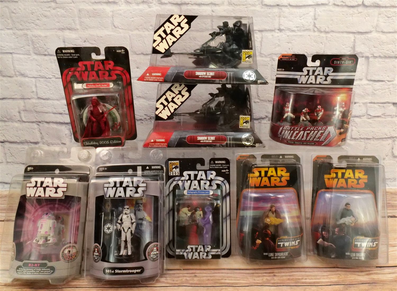 Lot of Star Wars Mixed Action Figures including (2) Shadow Scout with Speeder Bikes – SDCC Exclusive, (2) Separation of Twins – Infant Princess Leia and Infant Luke Skywalker, R2-KT, 501st Stormtrooper, Holiday Darth Vader – Damaged Package, Holographic Princess Leia – SDCC, and Battle Packs Unleashed Shock Trooper Battallion. All new in package. All invoices must be paid for within 24 hours. We offer multiple shipping options, please read the terms as they have changed. We also offer pick ups on Friday, Saturday and Monday immediately following the sale BY APPOINTMENT ONLY. PLEASE READ THE TERMS!!!
