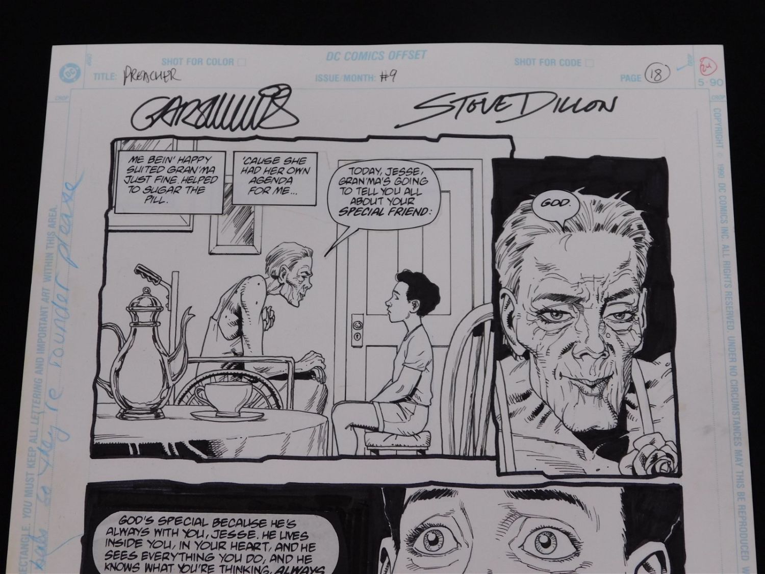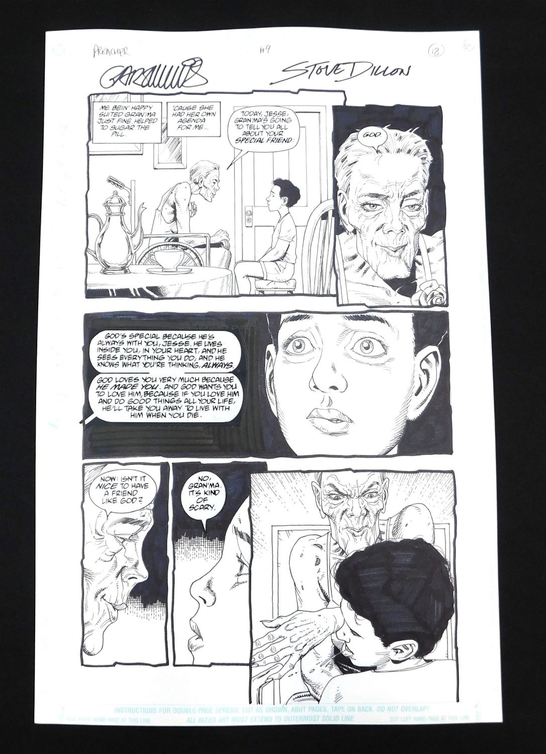 Original Comic Book Art DC/Vertigo Preacher Issue #9 Page 18. Art is by Steve Dillon. Signed by Garth Ennis and Steve Dillon. Includes multiple images of Marie L’Angelle and Jesse as Child. Statted on dialog. All lots in this sale are from the personal collection of Kevin Smith. All items come with a Bodnar’s Auction COA autographed by Kevin Smith. Join Us Live on Sale Day as Kevin Smith will be our guest caller and will talk about each piece. All invoices must be paid within 24 hours of the sale. We offer multiple shipping options, please read the terms as they have changed. We also offer Pick-Ups Thursday, Friday, Saturday, and Monday immediately following the sale. BY APPOINTMENT ONLY. PLEASE READ THE NEW TERMS!!!