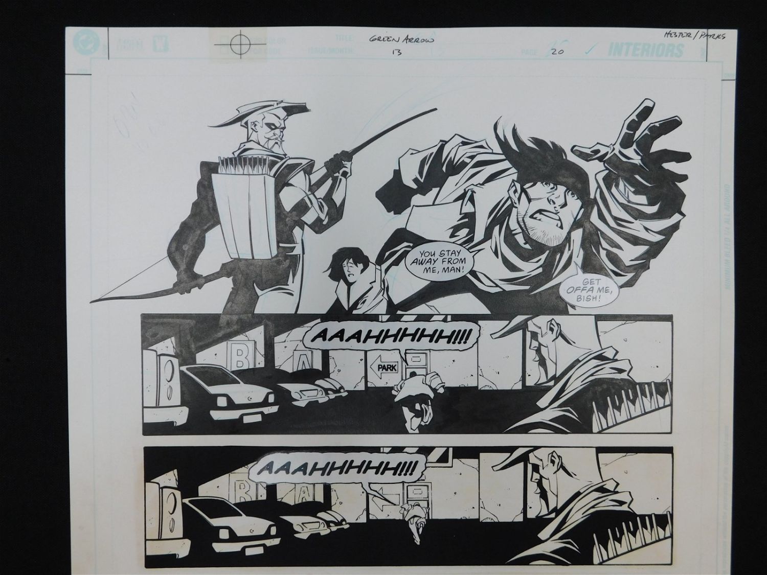 Original Comic Book Art – DC/Vertigo – Green Arrow – Issue #13 Page 20. Penciler Phil Hester. Inker Ande Parks. Includes images of Green Arrows – Oliver Queen and Connor Hawke. Also has statted on dialog bubbles. All lots in this sale are from the personal collection of Kevin Smith. All items come with a Bodnar’s Auction COA autographed by Kevin Smith. Join Us Live on Sale Day as Kevin Smith will be our guest caller and will talk about each piece. All invoices must be paid within 24 hours of the sale. We offer multiple shipping options, please read the terms as they have changed. We also offer Pick-Ups Thursday, Friday, Saturday, and Monday immediately following the sale. BY APPOINTMENT ONLY. PLEASE READ THE NEW TERMS!!!