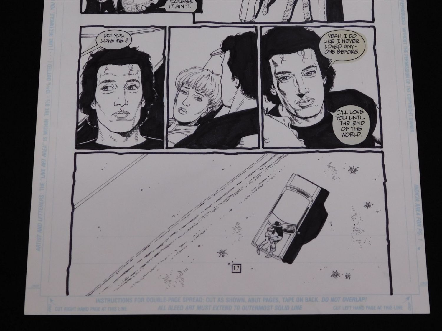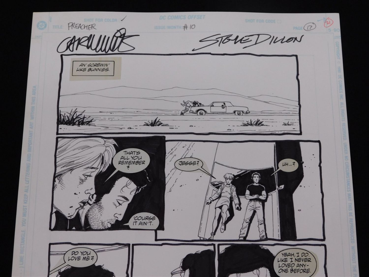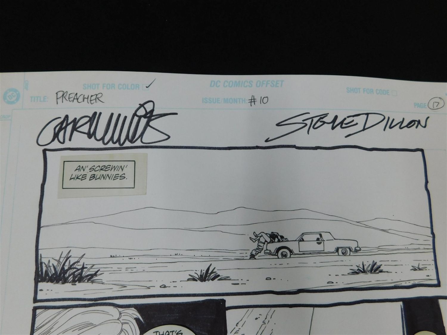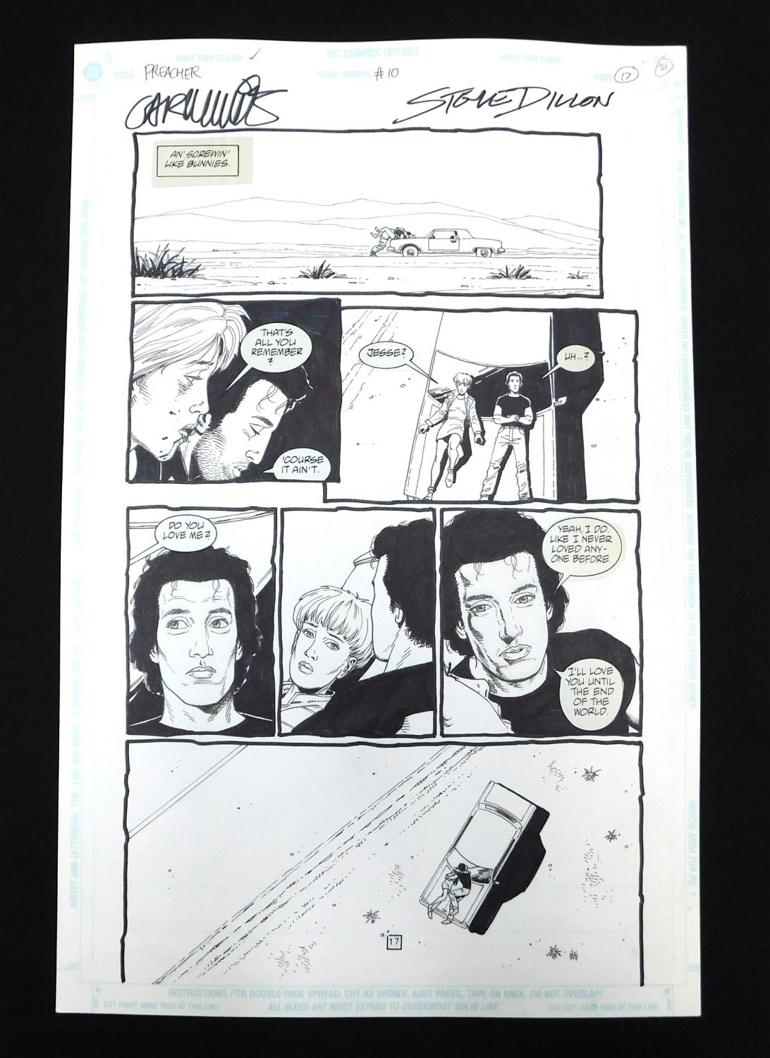 Original Comic Book Art DC/Vertigo Preacher Issue #10 Page 17. Art is by Steve Dillon. Signed by Garth Ennis and Steve Dillon. Includes numerous images of Jesse and Tulip. "They are Screwin’ Like Bunnies". Also includes Jesse tells Tulip that he will love her until the end of the world. Statted on dialog. All lots in this sale are from the personal collection of Kevin Smith. All items come with a Bodnar’s Auction COA autographed by Kevin Smith. Join Us Live on Sale Day as Kevin Smith will be our guest caller and will talk about each piece. All invoices must be paid within 24 hours of the sale. We offer multiple shipping options, please read the terms as they have changed. We also offer Pick-Ups Thursday, Friday, Saturday, and Monday immediately following the sale. BY APPOINTMENT ONLY. PLEASE READ THE NEW TERMS!!!