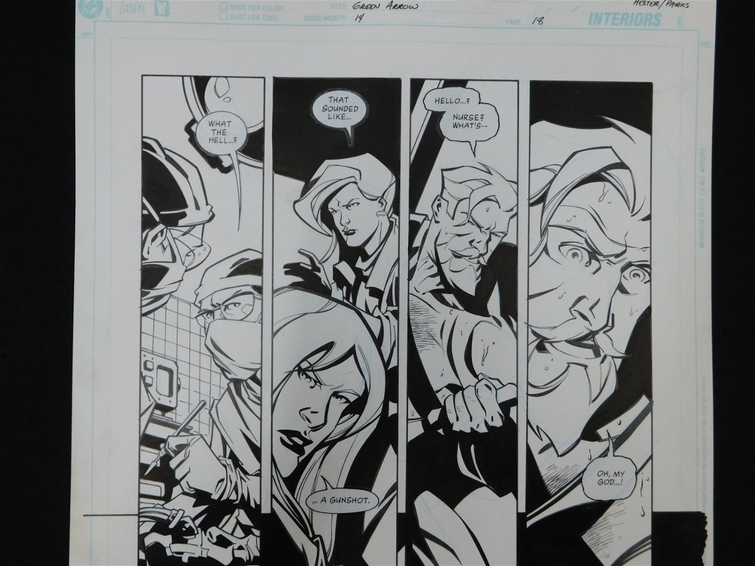 Original Comic Book Art – DC/Vertigo – Green Arrow – Issue #14 Page 18. Penciler Phil Hester. Inker Ande Parks. Includes images of Green Arrow – Oliver Queen, Mia Deorden, Black Canary, and Onomatopoeia. Also has statted on dialog bubbles. All lots in this sale are from the personal collection of Kevin Smith. All items come with a Bodnar’s Auction COA autographed by Kevin Smith. Join Us Live on Sale Day as Kevin Smith will be our guest caller and will talk about each piece. All invoices must be paid within 24 hours of the sale. We offer multiple shipping options, please read the terms as they have changed. We also offer Pick-Ups Thursday, Friday, Saturday, and Monday immediately following the sale. BY APPOINTMENT ONLY. PLEASE READ THE NEW TERMS!!!