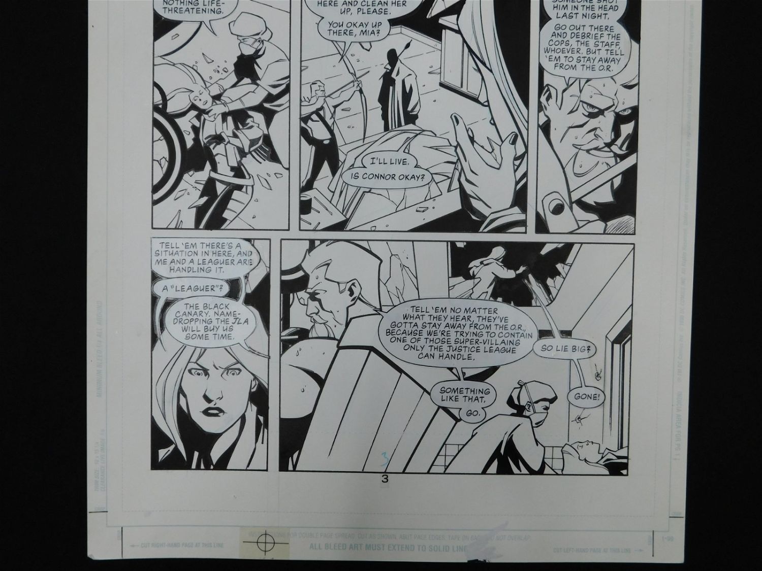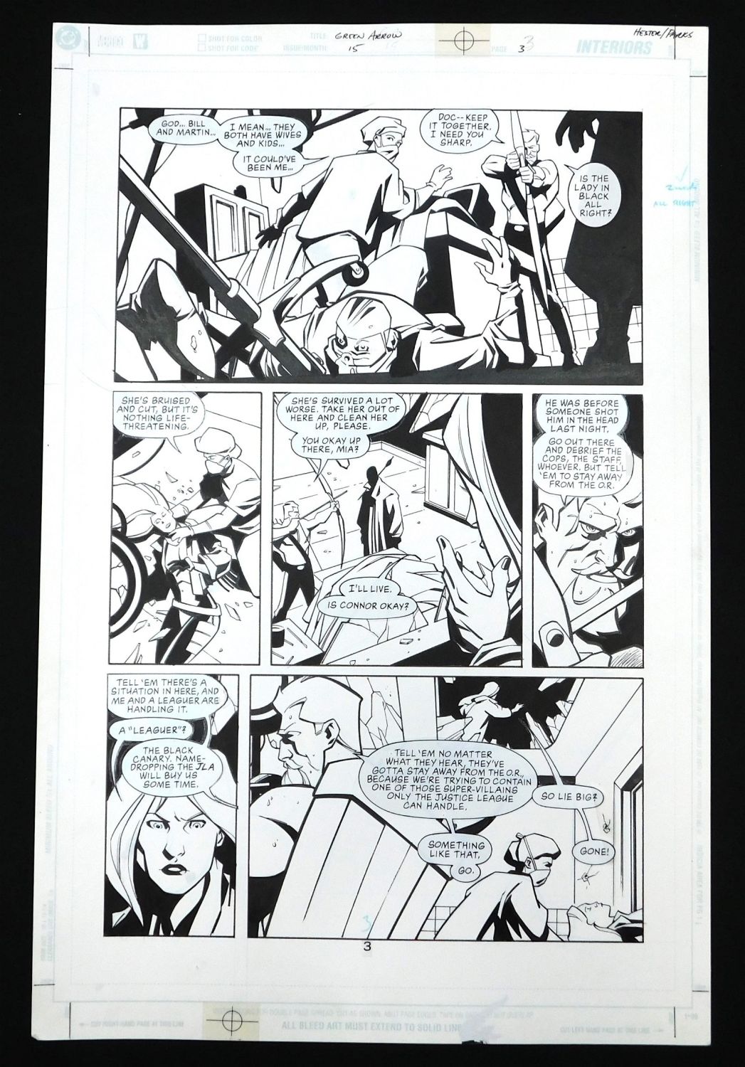 Original Comic Book Art – DC/Vertigo – Green Arrow – Issue #15 Page 3. Penciler Phil Hester. Inker Ande Parks. Includes images of Green Arrow Oliver Queen, Mia Dearden, Black Canary and Onomatopoeia. Also has statted on dialog bubbles. All lots in this sale are from the personal collection of Kevin Smith. All items come with a Bodnar’s Auction COA autographed by Kevin Smith. Join Us Live on Sale Day as Kevin Smith will be our guest caller and will talk about each piece. All invoices must be paid within 24 hours of the sale. We offer multiple shipping options, please read the terms as they have changed. We also offer Pick-Ups Thursday, Friday, Saturday, and Monday immediately following the sale. BY APPOINTMENT ONLY. PLEASE READ THE NEW TERMS!!!