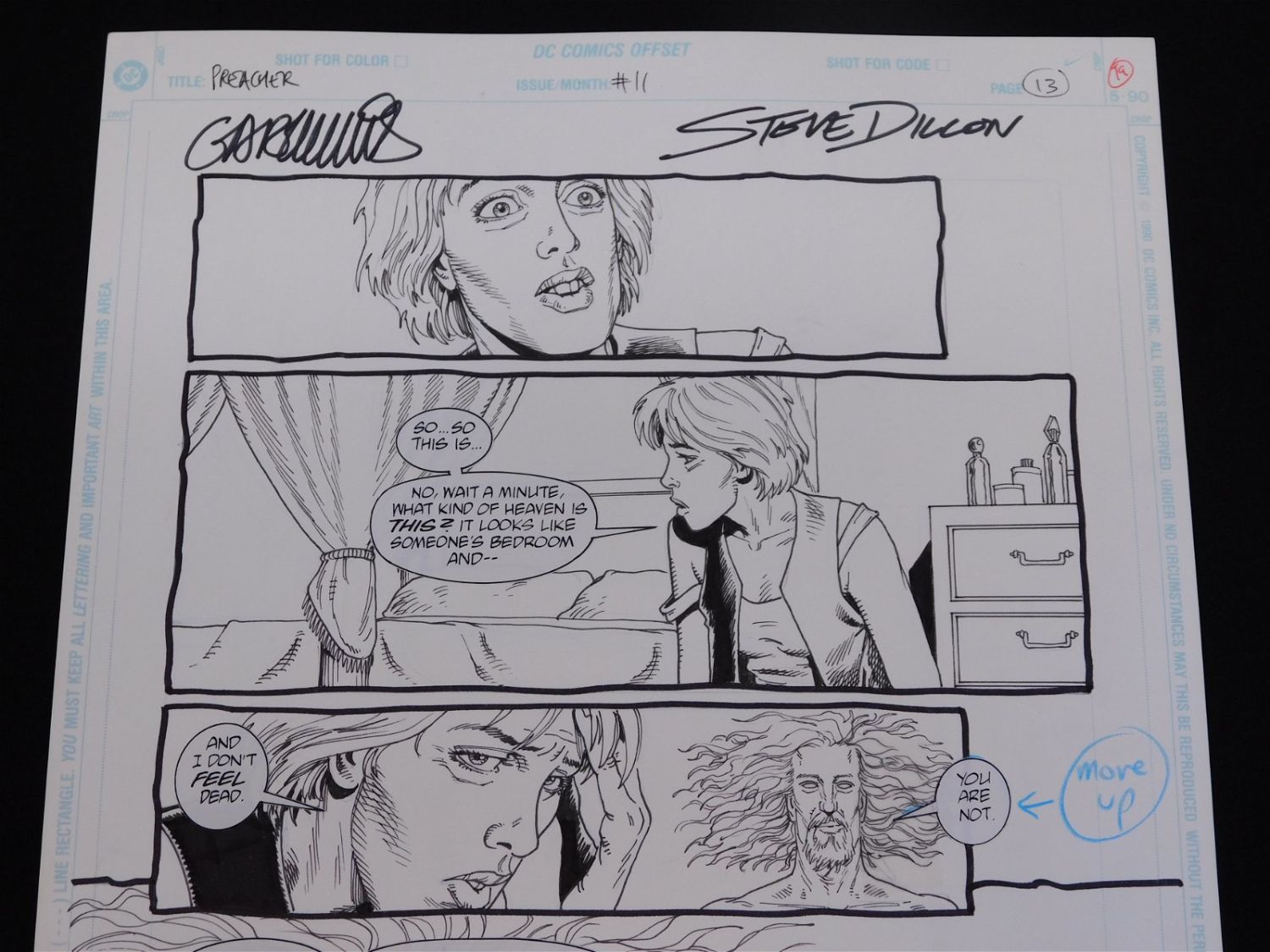 Original Comic Book Art DC/Vertigo Preacher Issue #11 Page 13. Art is by Steve Dillon. Signed by Garth Ennis and Steve Dillon. Includes multiple images of Tulip and God. Statted on dialog. All lots in this sale are from the personal collection of Kevin Smith. All items come with a Bodnar’s Auction COA autographed by Kevin Smith. Join Us Live on Sale Day as Kevin Smith will be our guest caller and will talk about each piece. All invoices must be paid within 24 hours of the sale. We offer multiple shipping options, please read the terms as they have changed. We also offer Pick-Ups Thursday, Friday, Saturday, and Monday immediately following the sale. BY APPOINTMENT ONLY. PLEASE READ THE NEW TERMS!!!
