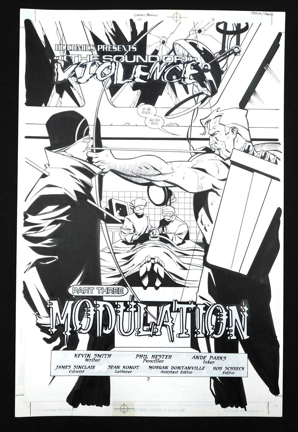 Original Comic Book Art – DC/Vertigo – Green Arrow – Issue #15 Page 7. Penciler Phil Hester. Inker Ande Parks. Includes images of Green Arrow Oliver Queen, Connor Hawke and Onomatopoeia. Also has statted on dialog bubbles. All lots in this sale are from the personal collection of Kevin Smith. All items come with a Bodnar’s Auction COA autographed by Kevin Smith. Join Us Live on Sale Day as Kevin Smith will be our guest caller and will talk about each piece. All invoices must be paid within 24 hours of the sale. We offer multiple shipping options, please read the terms as they have changed. We also offer Pick-Ups Thursday, Friday, Saturday, and Monday immediately following the sale. BY APPOINTMENT ONLY. PLEASE READ THE NEW TERMS!!!