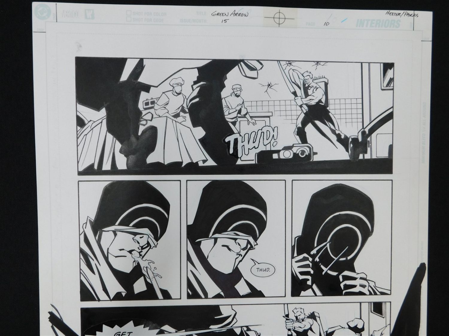 Original Comic Book Art – DC/Vertigo – Green Arrow – Issue #15 Page 10. Penciler Phil Hester. Inker Ande Parks. Includes images of Green Arrow Oliver Queen and Onomatopoeia. Also has statted on dialog bubbles. All lots in this sale are from the personal collection of Kevin Smith. All items come with a Bodnar’s Auction COA autographed by Kevin Smith. Join Us Live on Sale Day as Kevin Smith will be our guest caller and will talk about each piece. All invoices must be paid within 24 hours of the sale. We offer multiple shipping options, please read the terms as they have changed. We also offer Pick-Ups Thursday, Friday, Saturday, and Monday immediately following the sale. BY APPOINTMENT ONLY. PLEASE READ THE NEW TERMS!!!