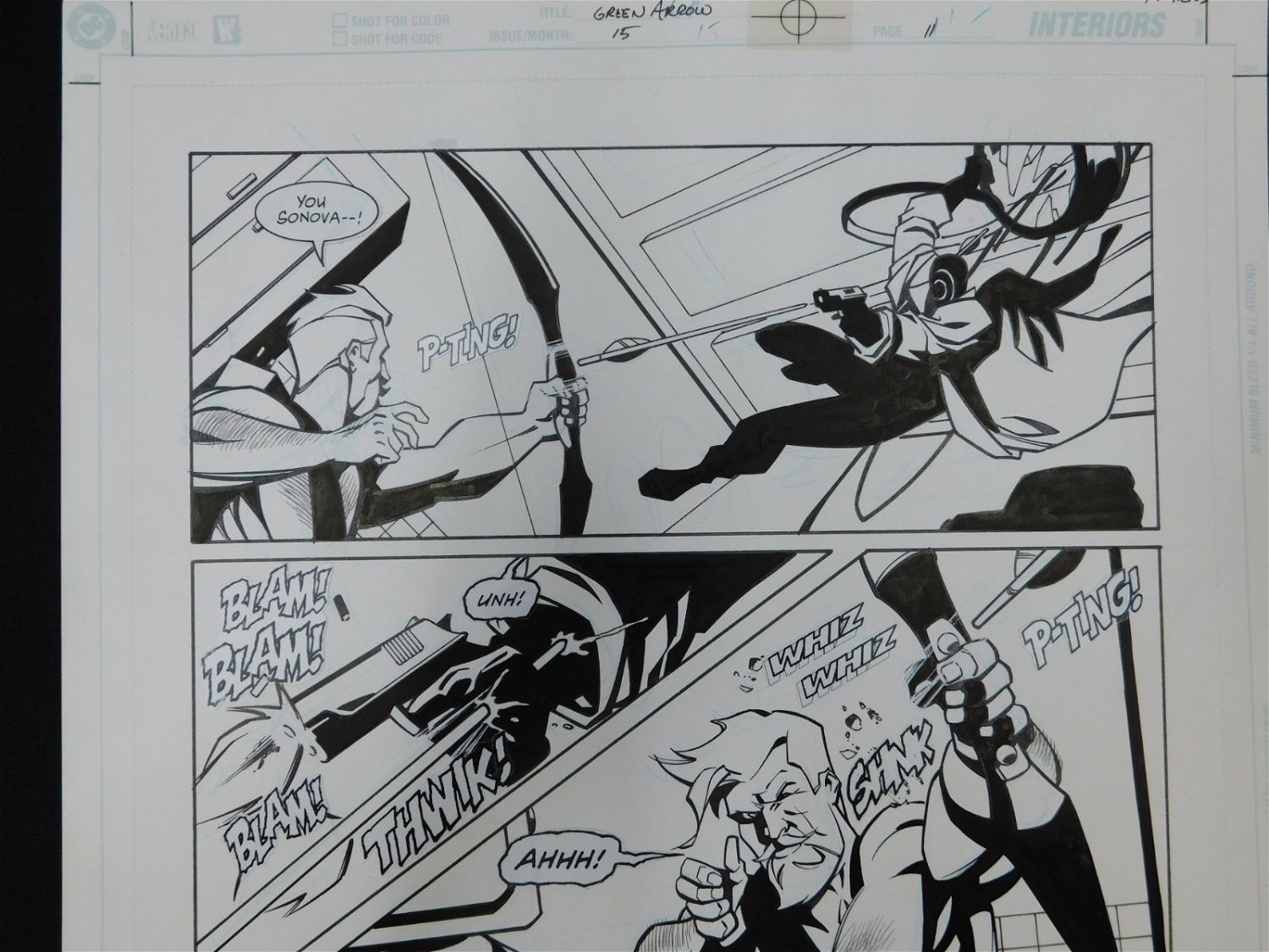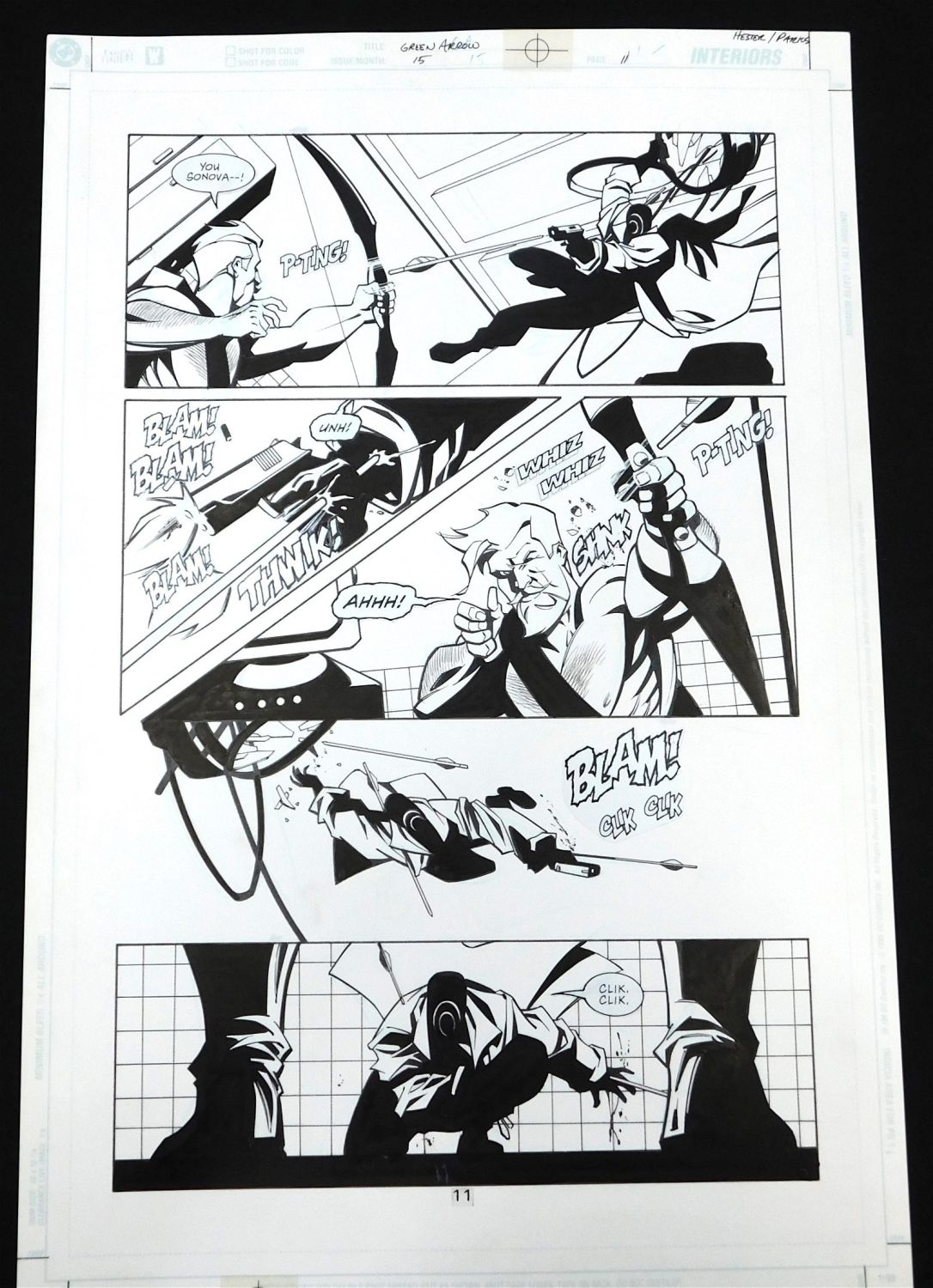 Original Comic Book Art – DC/Vertigo – Green Arrow – Issue #15 Page 11. Penciler Phil Hester. Inker Ande Parks. Includes images of Green Arrow Oliver Queen and Onomatopoeia. Also has statted on dialog bubbles. All lots in this sale are from the personal collection of Kevin Smith. All items come with a Bodnar’s Auction COA autographed by Kevin Smith. Join Us Live on Sale Day as Kevin Smith will be our guest caller and will talk about each piece. All invoices must be paid within 24 hours of the sale. We offer multiple shipping options, please read the terms as they have changed. We also offer Pick-Ups Thursday, Friday, Saturday, and Monday immediately following the sale. BY APPOINTMENT ONLY. PLEASE READ THE NEW TERMS!!!