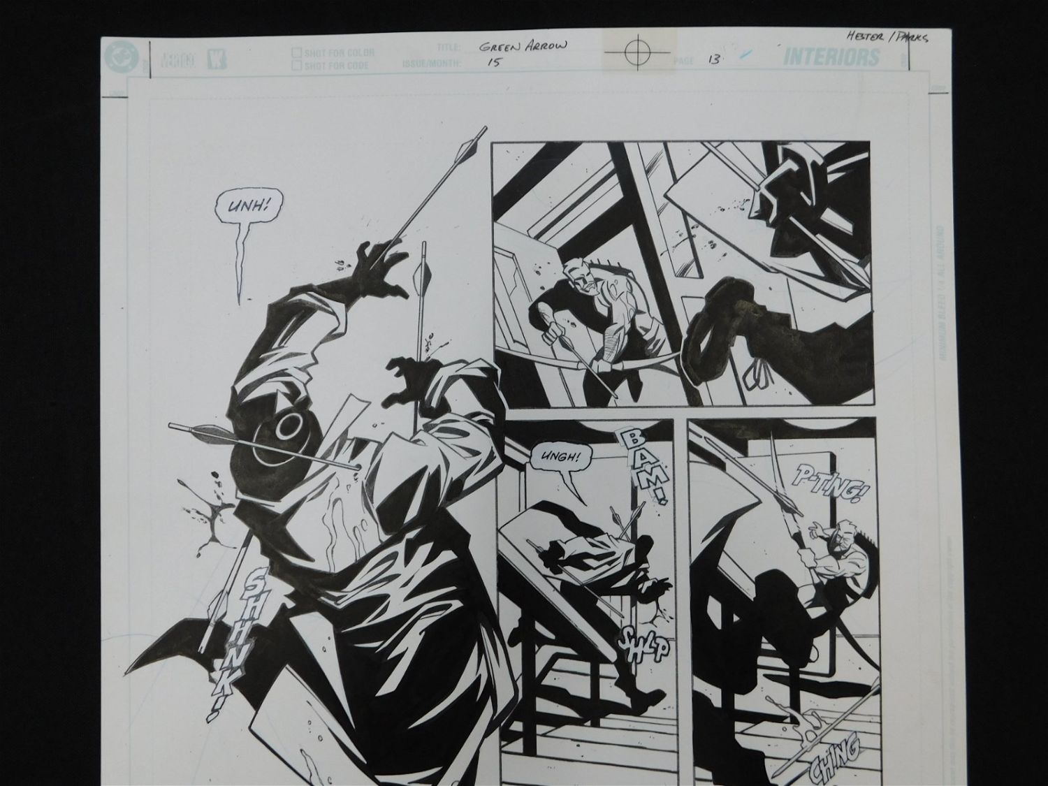 Original Comic Book Art – DC/Vertigo – Green Arrow – Issue #15 Page 13. Penciler Phil Hester. Inker Ande Parks. Includes images of Green Arrow Oliver Queen and Onomatopoeia. Also has statted on dialog bubbles. All lots in this sale are from the personal collection of Kevin Smith. All items come with a Bodnar’s Auction COA autographed by Kevin Smith. Join Us Live on Sale Day as Kevin Smith will be our guest caller and will talk about each piece. All invoices must be paid within 24 hours of the sale. We offer multiple shipping options, please read the terms as they have changed. We also offer Pick-Ups Thursday, Friday, Saturday, and Monday immediately following the sale. BY APPOINTMENT ONLY. PLEASE READ THE NEW TERMS!!!