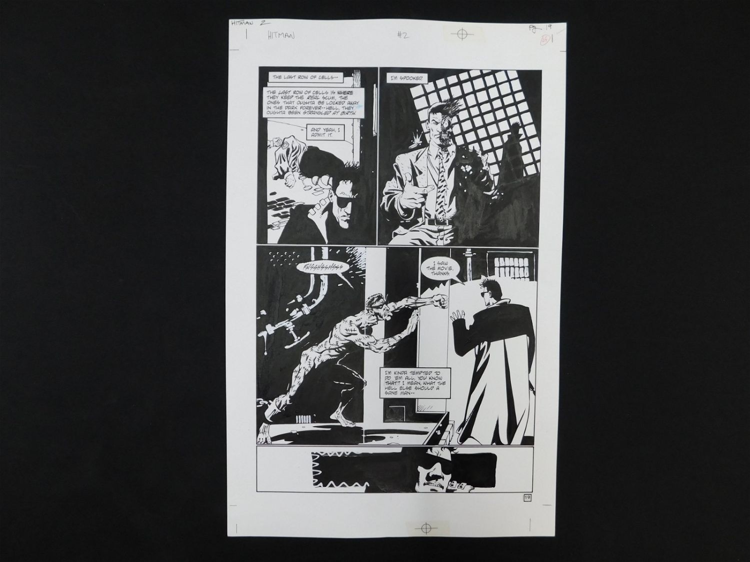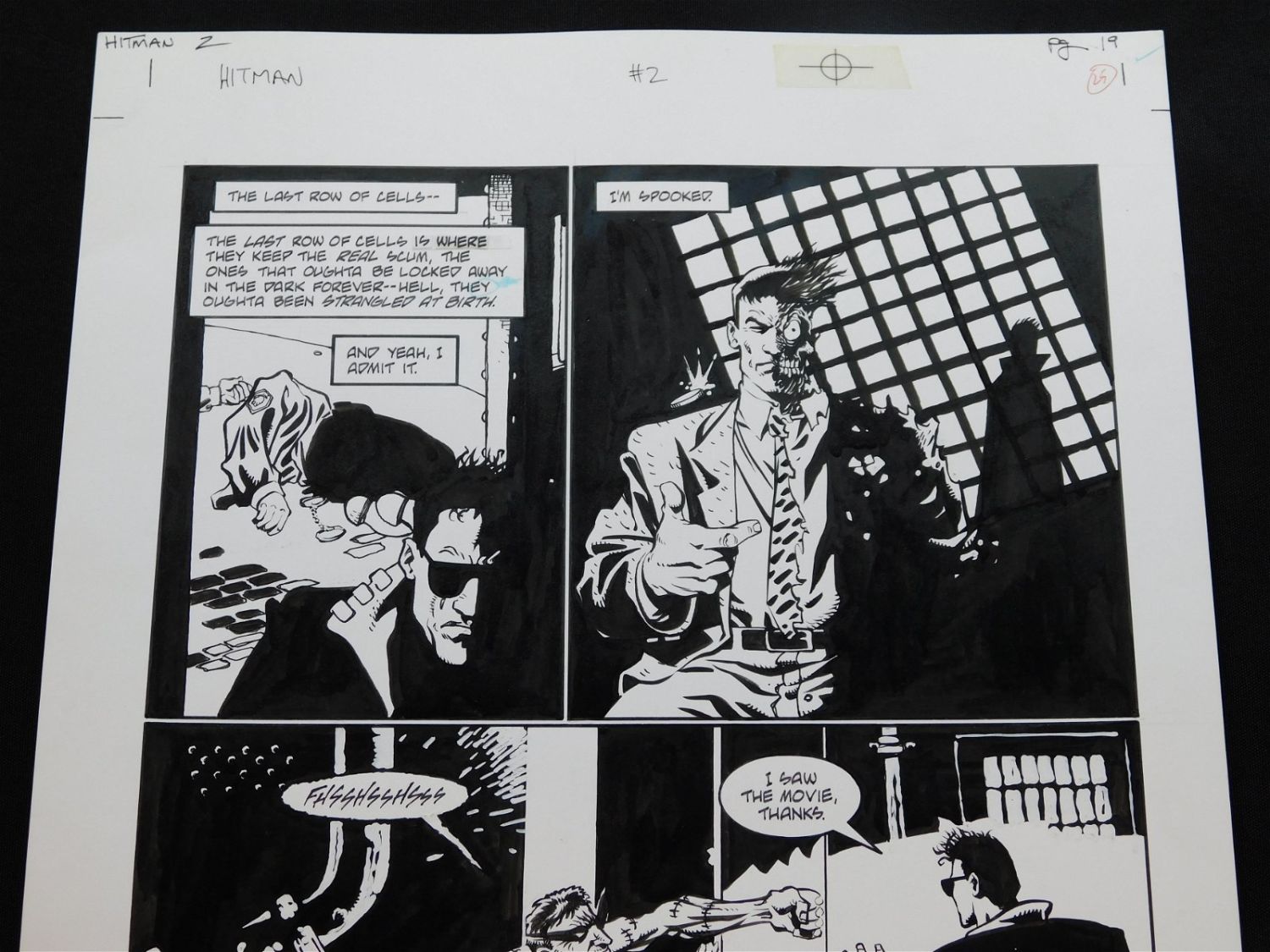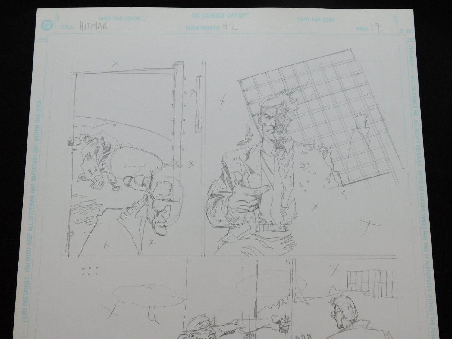 Lot of 2 Pieces of Original Comic Book Art DC Hitman Issue #2 Page 19. Includes preliminary pencils and final inked art. Art is by John McCrea. Includes multiple images of Hitman, 1 image of Two-Face, and Mister Zsasz. Set in Arkham Asylum. All lots in this sale are from the personal collection of Kevin Smith. All items come with a Bodnar’s Auction COA autographed by Kevin Smith. Join Us Live on Sale Day as Kevin Smith will be our guest caller and will talk about each piece. All invoices must be paid within 24 hours of the sale. We offer multiple shipping options, please read the terms as they have changed. We also offer Pick-Ups Thursday, Friday, Saturday, and Monday immediately following the sale. BY APPOINTMENT ONLY. PLEASE READ THE NEW TERMS!!!