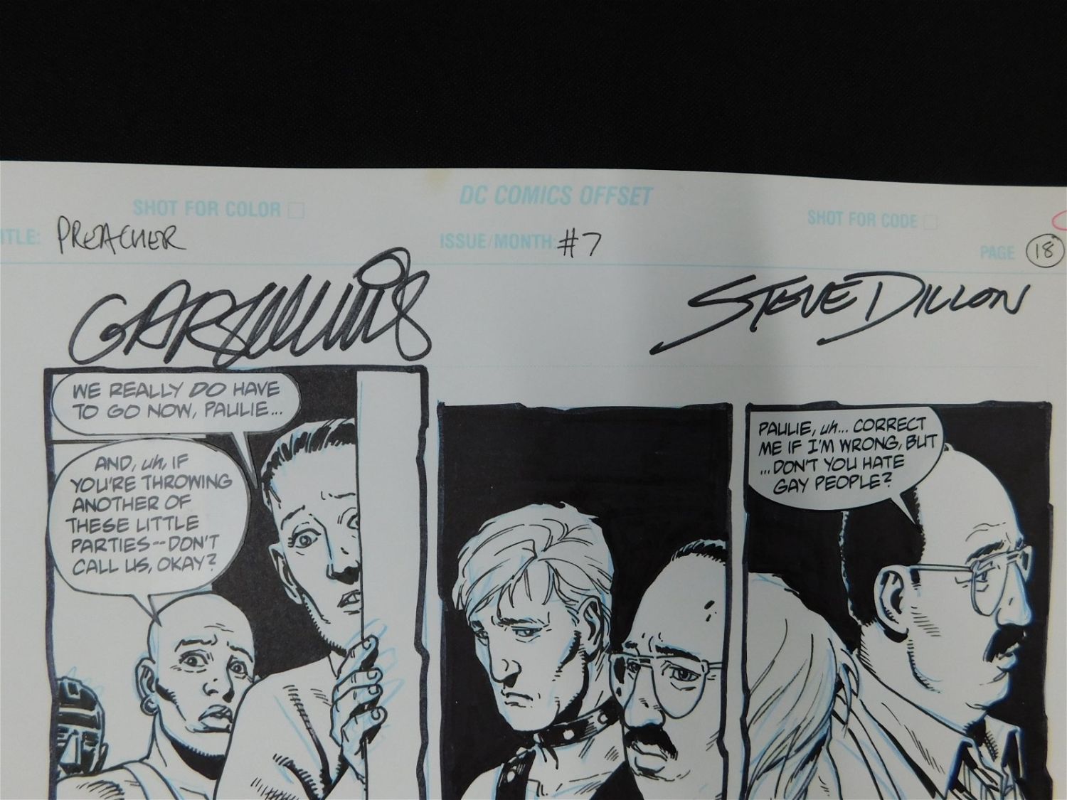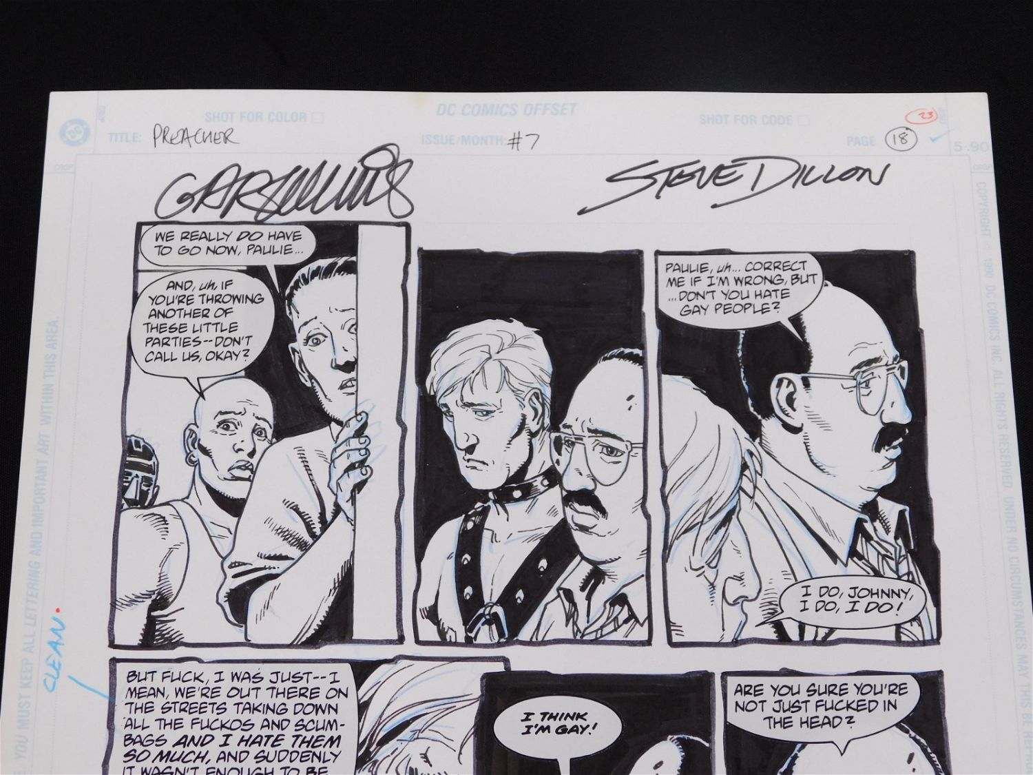 Original Comic Book Art DC/Vertigo Preacher Issue #7 Page 18. Art is by Steve Dillon. Signed by Garth Ennis and Steve Dillon. Dialog is statted on. Includes man in bondage outfit coming out of closet. Includes profanity. All lots in this sale are from the personal collection of Kevin Smith. All items come with a Bodnar’s Auction COA autographed by Kevin Smith. Join Us Live on Sale Day as Kevin Smith will be our guest caller and will talk about each piece. All invoices must be paid within 24 hours of the sale. We offer multiple shipping options, please read the terms as they have changed. We also offer Pick-Ups Thursday, Friday, Saturday, and Monday immediately following the sale. BY APPOINTMENT ONLY. PLEASE READ THE NEW TERMS!!!