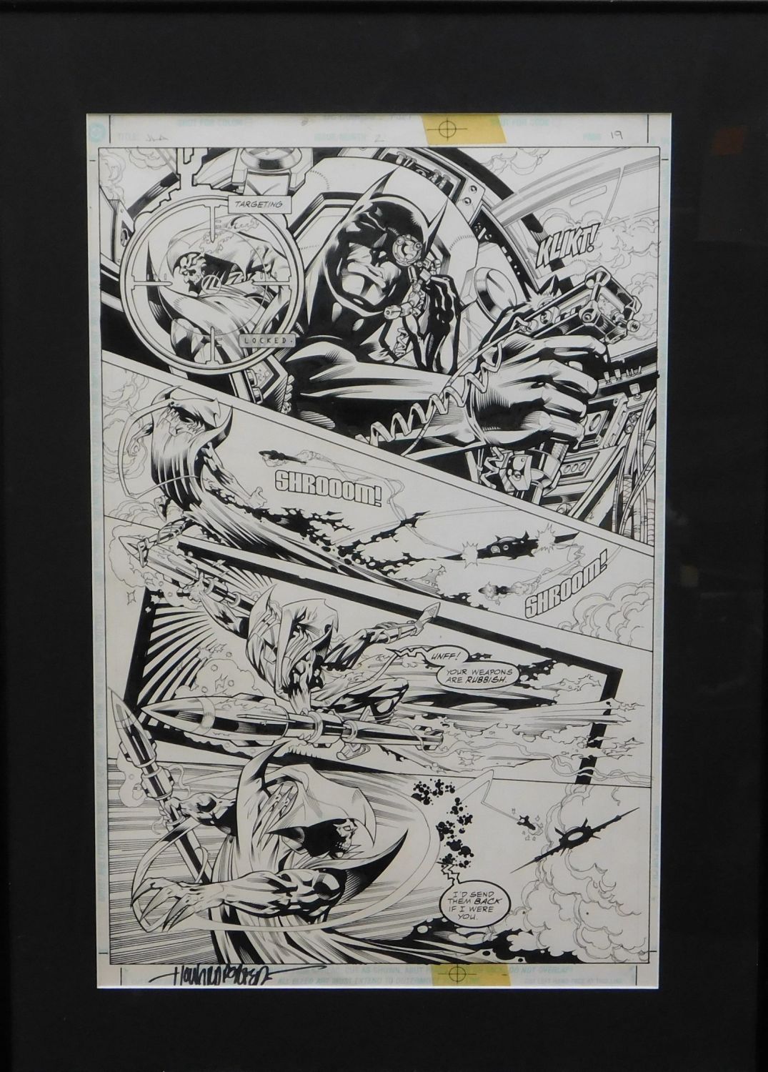 Original Comic Book Art – JLA Issue #2 Page 19. Pencils by Howard Porter. Inker John Dell. Signed by Artist Howard Porter. Includes image of Batman, Bat Plane and A-Mortal. Professionally Framed and Matted. Measures 21" tall x 15" wide. All lots in this sale are from the personal collection of Kevin Smith. All items come with a Bodnar’s Auction COA autographed by Kevin Smith. Join Us Live on Sale Day as Kevin Smith will be our guest caller and will talk about each piece. All invoices must be paid within 24 hours of the sale. We offer multiple shipping options, please read the terms as they have changed. We also offer Pick-Ups Thursday, Friday, Saturday, and Monday immediately following the sale. BY APPOINTMENT ONLY. PLEASE READ THE NEW TERMS!!!