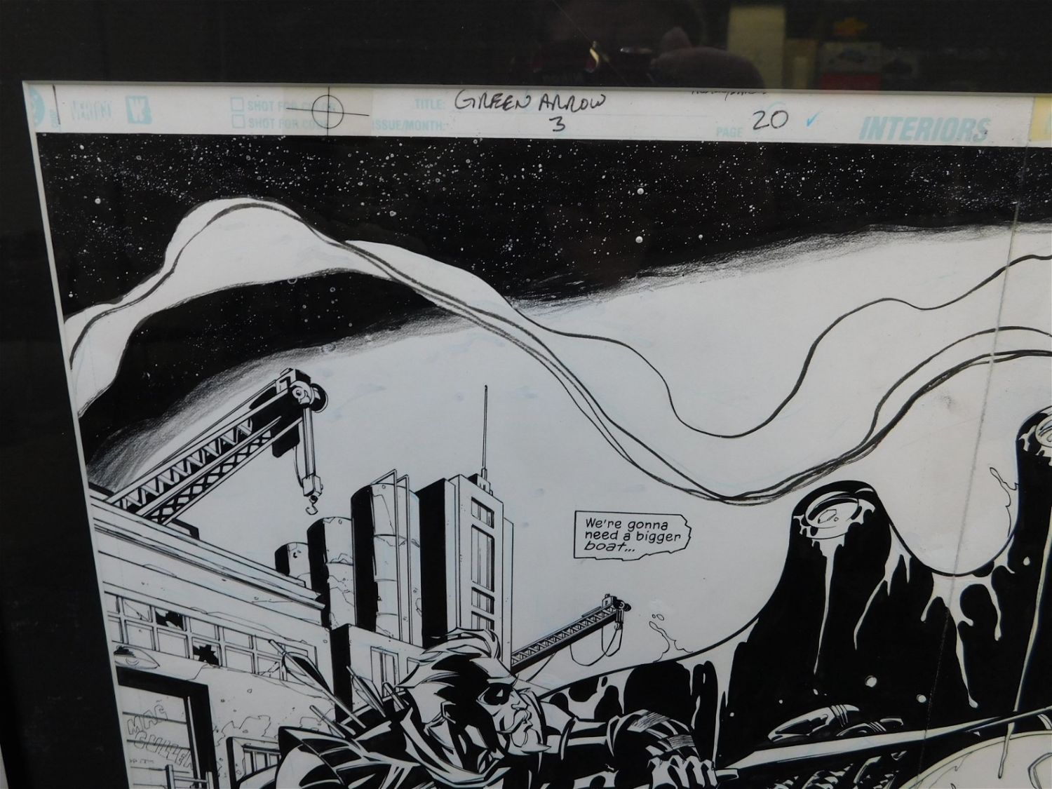 Original Comic Book Art – Double Splash Page – Green Arrow Issue #3 Page 20 & 21. Art by Phil Hester. Includes image of Black Manta and Green Arrow. Professionally Framed and Matted. Measures 20.5" tall x 23.5" wide. All lots in this sale are from the personal collection of Kevin Smith. All items come with a Bodnar’s Auction COA autographed by Kevin Smith. Join Us Live on Sale Day as Kevin Smith will be our guest caller and will talk about each piece. All invoices must be paid within 24 hours of the sale. We offer multiple shipping options, please read the terms as they have changed. We also offer Pick-Ups Thursday, Friday, Saturday, and Monday immediately following the sale. BY APPOINTMENT ONLY. PLEASE READ THE NEW TERMS!!!