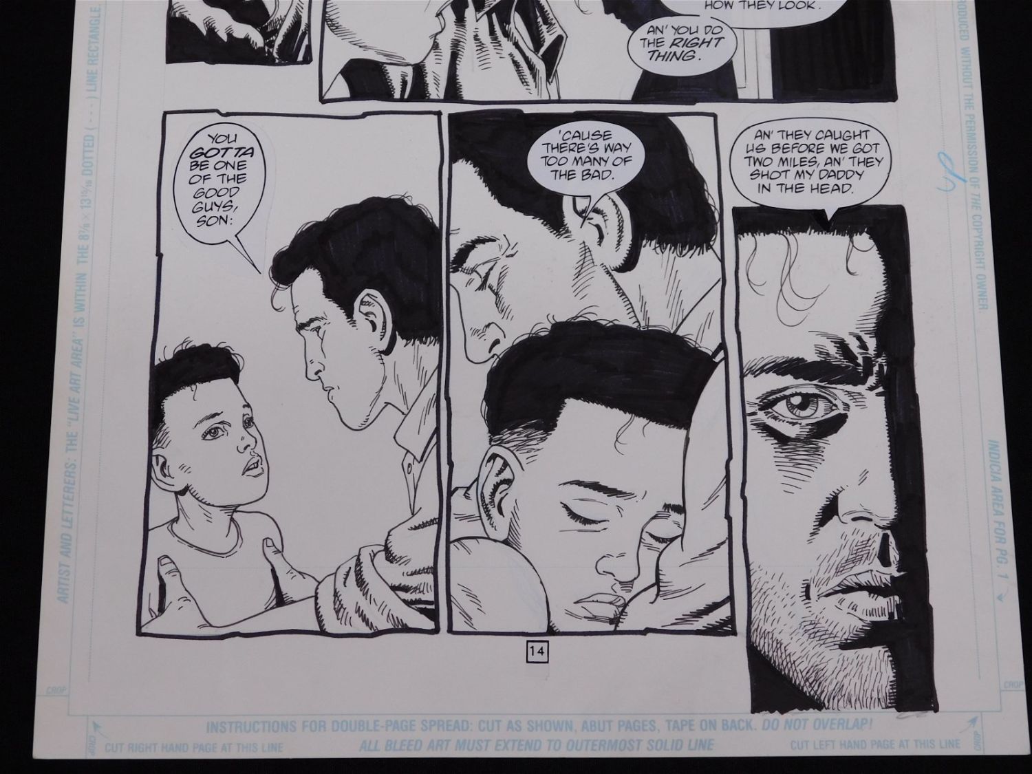 Original Comic Book Art DC/Vertigo Preacher Issue #9 Page 14. Art is by Steve Dillon. Signed by Garth Ennis and Steve Dillon. Includes Flashback to Jesse’s Childhood with multiple images of Adult Jesse and numerous panels of Jesse as a child and John Custer. Statted on dialog. Reference to John Wayne. All lots in this sale are from the personal collection of Kevin Smith. All items come with a Bodnar’s Auction COA autographed by Kevin Smith. Join Us Live on Sale Day as Kevin Smith will be our guest caller and will talk about each piece. All invoices must be paid within 24 hours of the sale. We offer multiple shipping options, please read the terms as they have changed. We also offer Pick-Ups Thursday, Friday, Saturday, and Monday immediately following the sale. BY APPOINTMENT ONLY. PLEASE READ THE NEW TERMS!!!