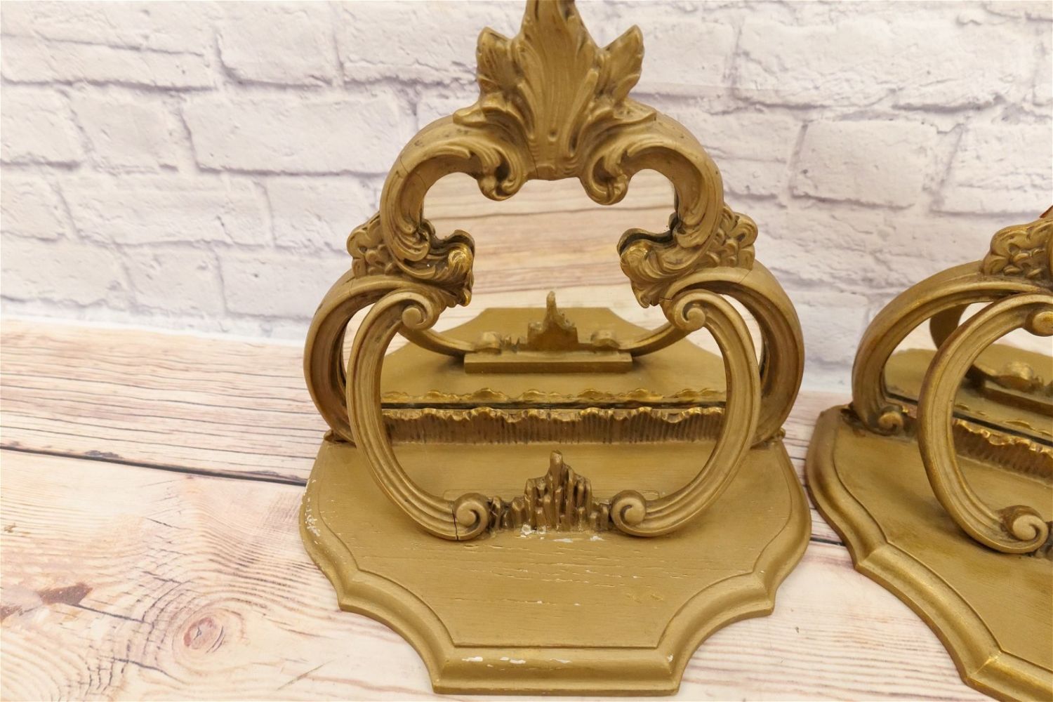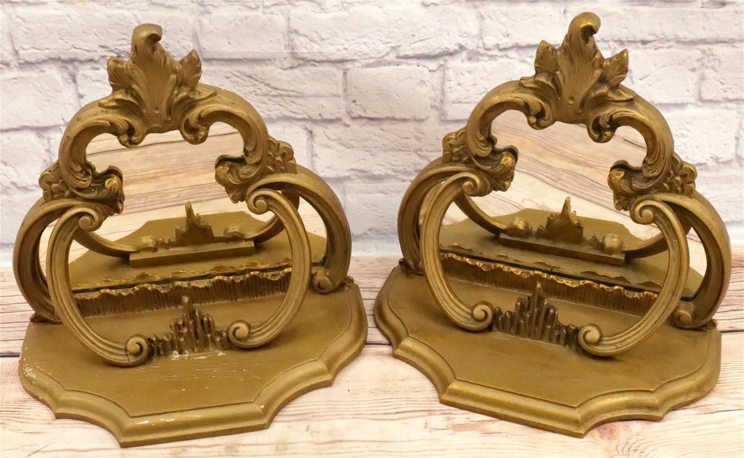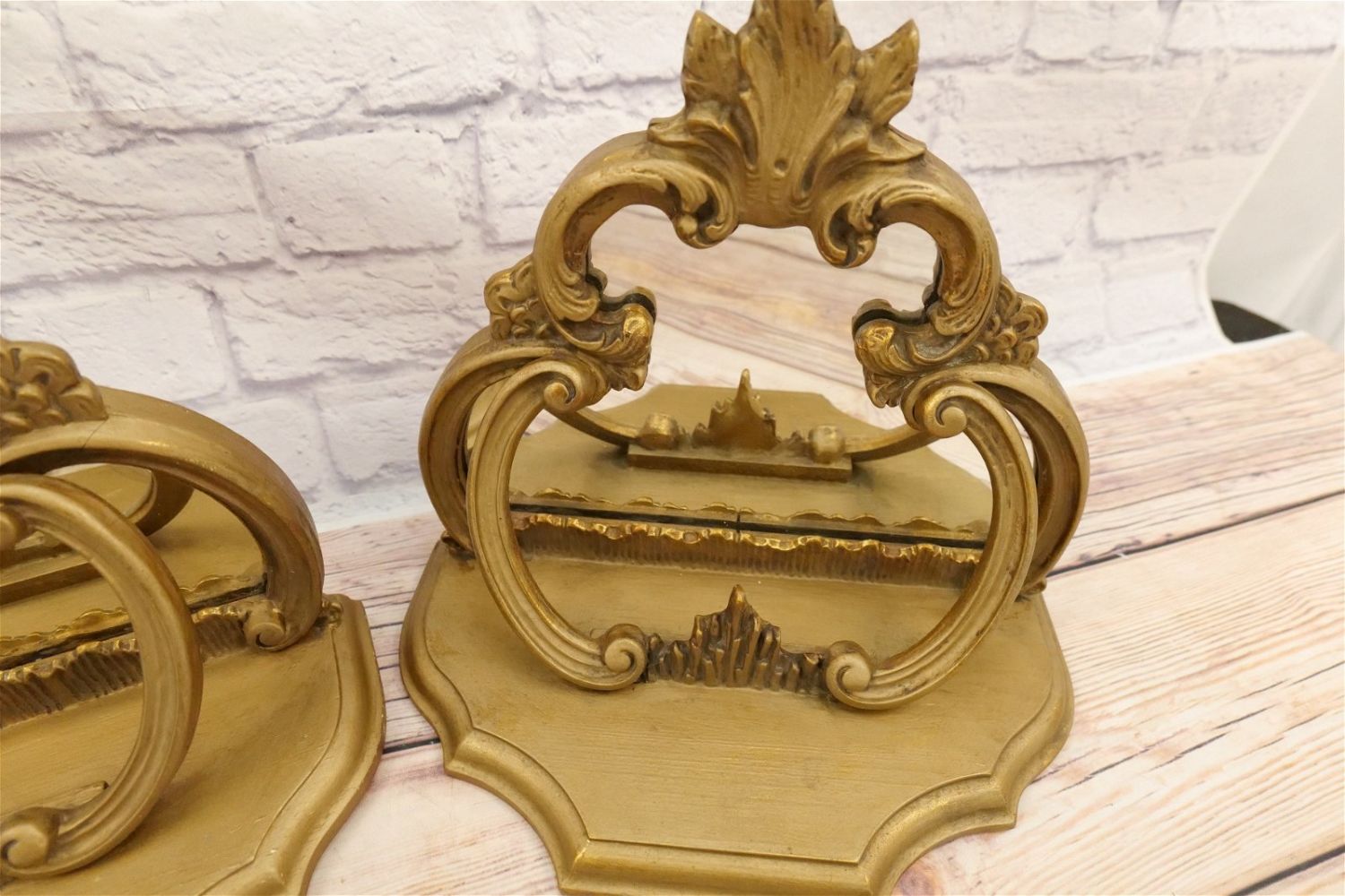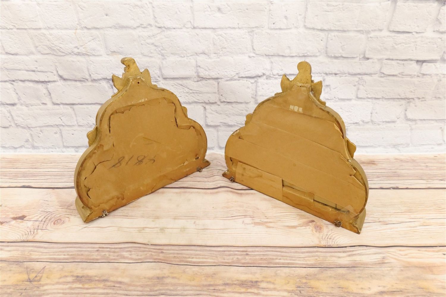 Pair of Gold Painted and Mirrored Wall Sconces. Measures 14" long x 13.5" wide x 7.5" deep. All invoices must be paid for within 24 hours. We offer multiple shipping options, please read the terms as they have changed. We also offer pick ups on Friday, Saturday and Monday immediately following the sale BY APPOINTMENT ONLY. PLEASE READ THE TERMS!!!