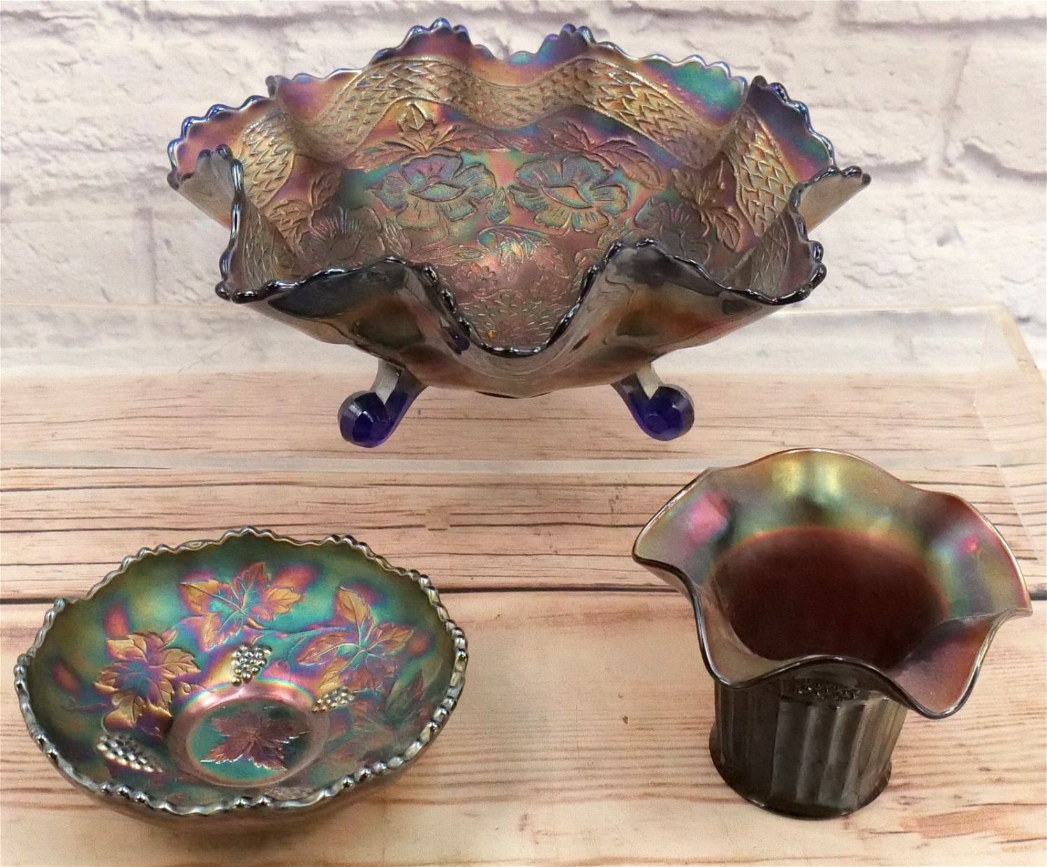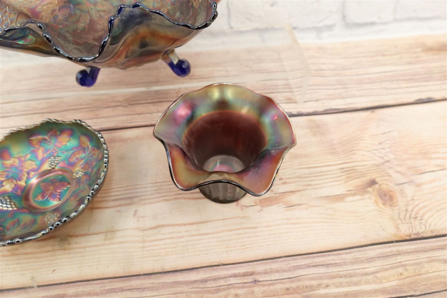 Lot of 3 Pieces of Carnival Glass including Oversized Footed Purple Bowl, Signed Northwood Purple Vase, and Purple Bowl with Grape Design. Largest measures 4.5" tall x 10" wide. All invoices must be paid for within 24 hours. We offer multiple shipping options, please read the terms as they have changed. We also offer pick ups on Friday, Saturday and Monday immediately following the sale BY APPOINTMENT ONLY. PLEASE READ THE TERMS!!!