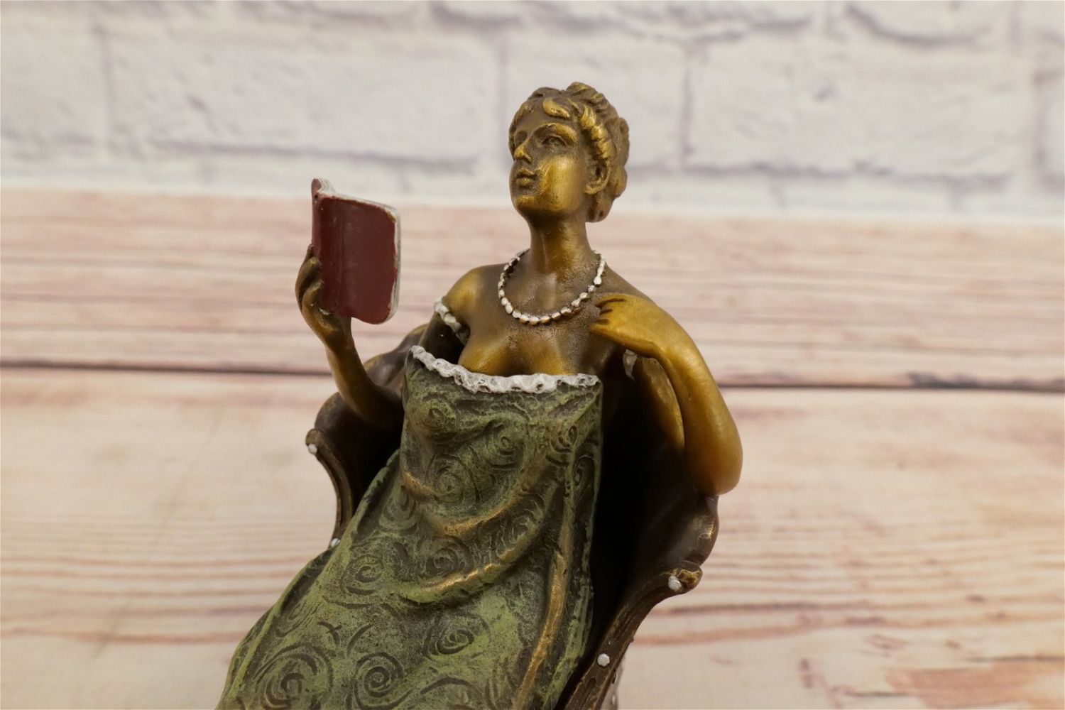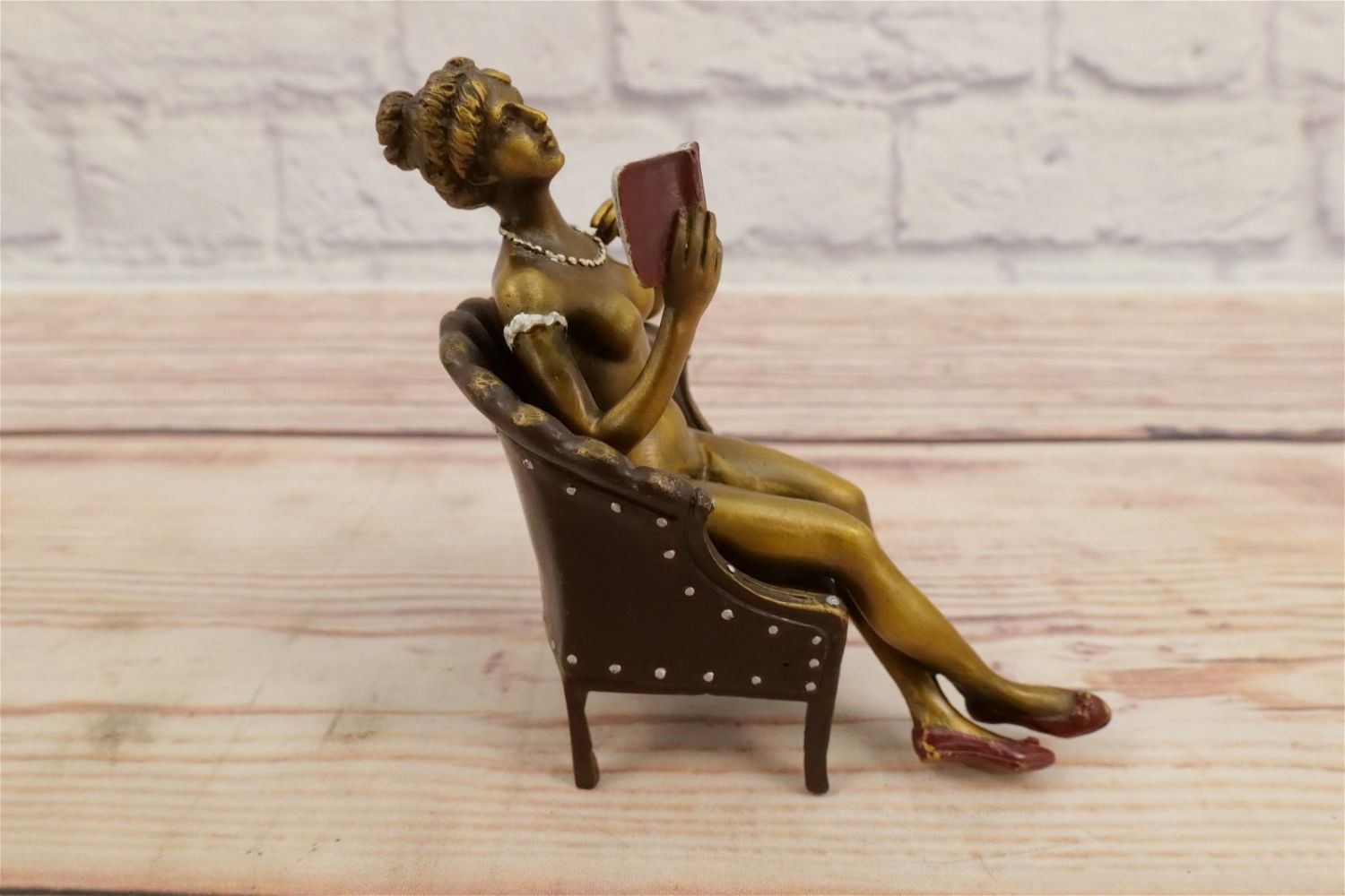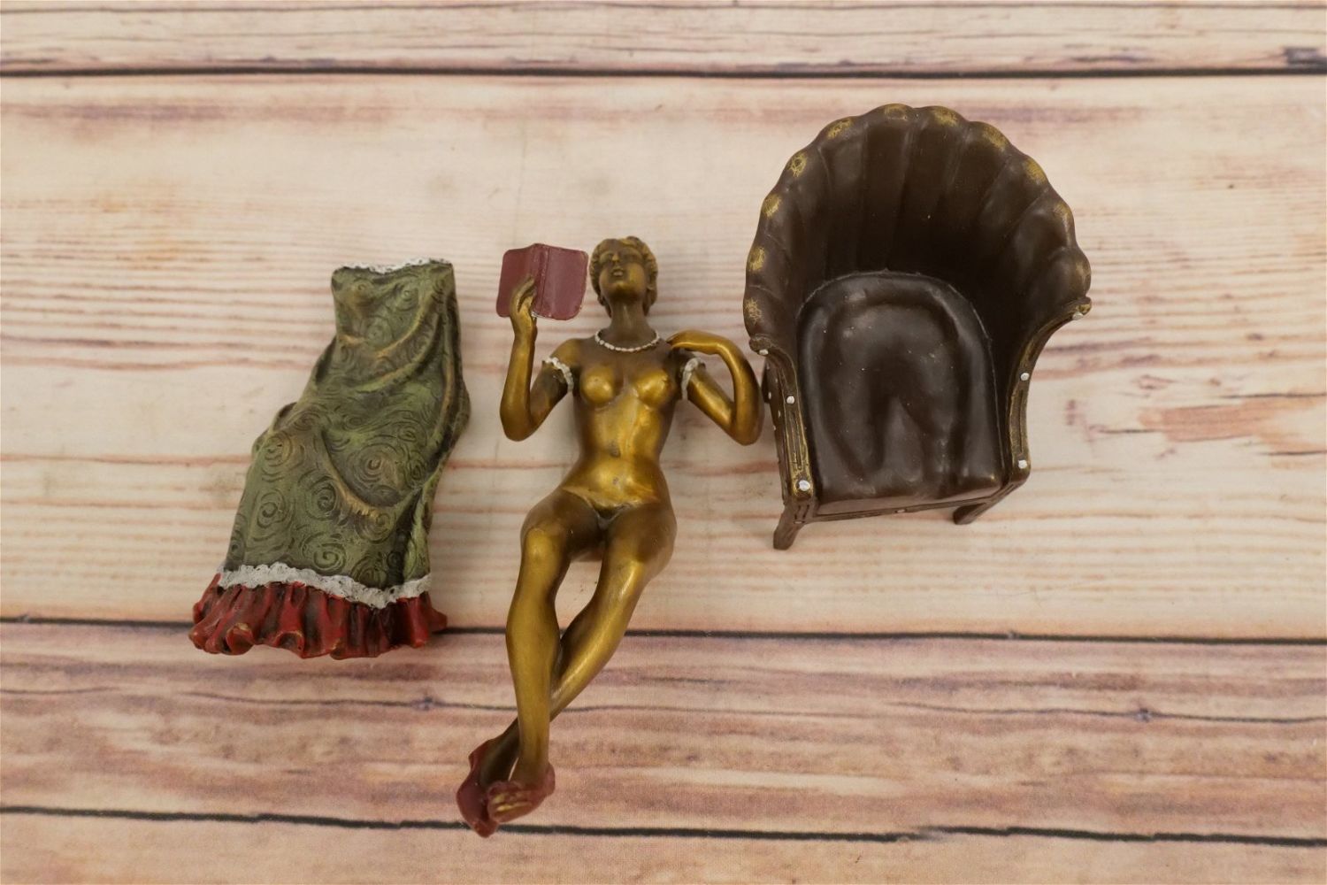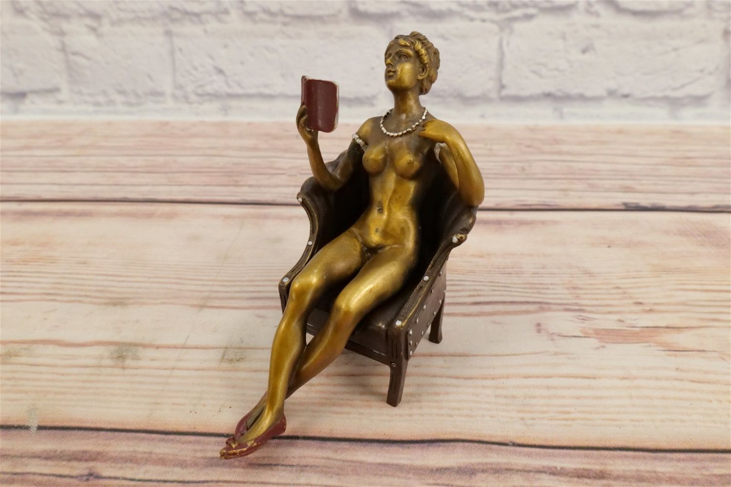 Cold Painted Vienna Style Bronze Statue of Woman Sitting on Chair Reading a Book. Three Pieces – Chair, Nude Woman Sitting, and Detachable Dress. Contemporary Bronze in the manner of Nam Greb. Measures 5" tall x 2.75" wide. All invoices must be paid for within 24 hours. We offer multiple shipping options, please read the terms as they have changed. We also offer pick ups on Friday, Saturday and Monday immediately following the sale BY APPOINTMENT ONLY. PLEASE READ THE TERMS!!!