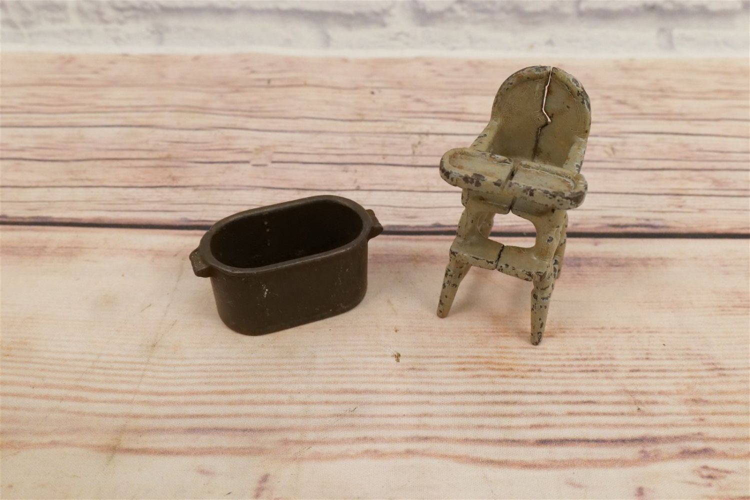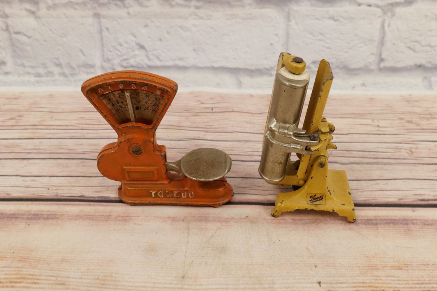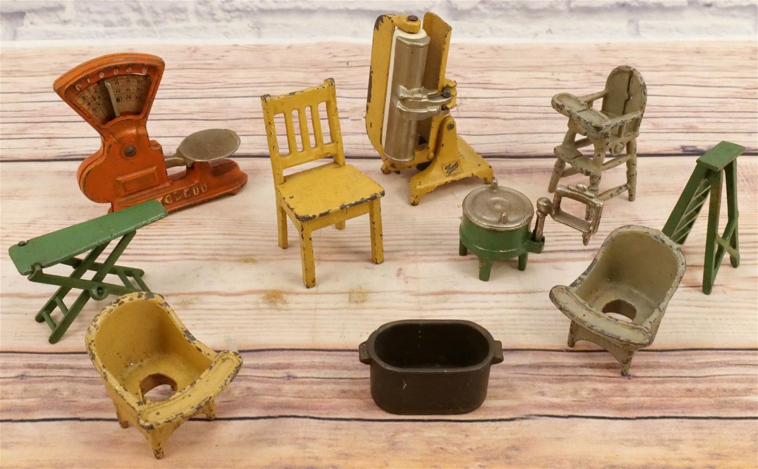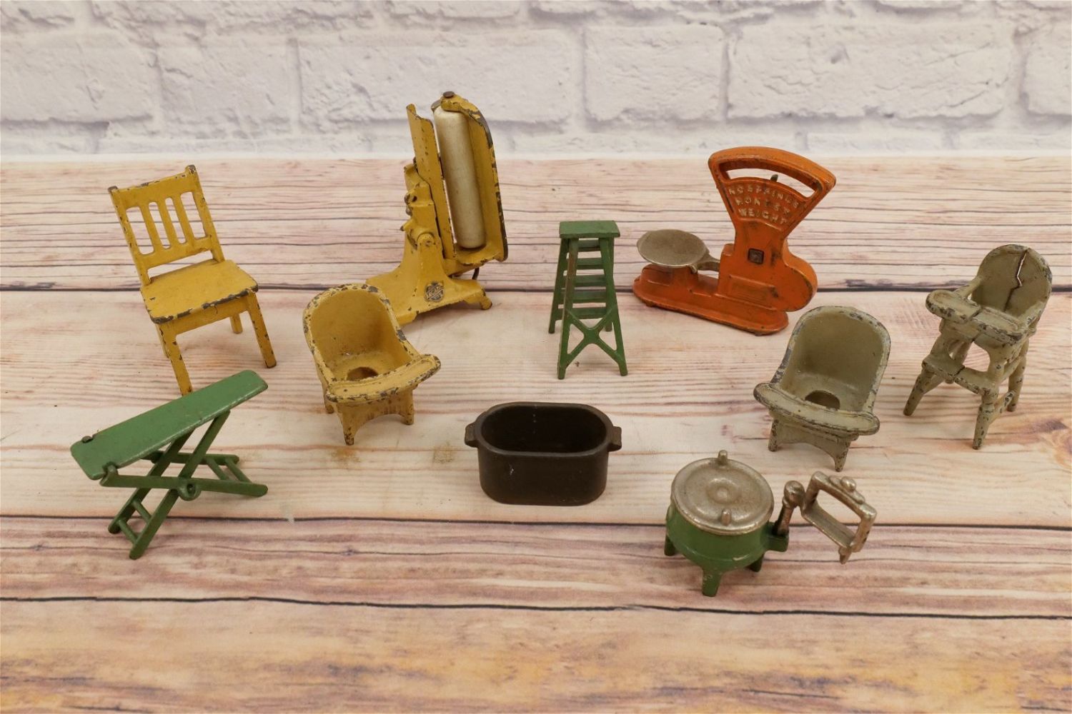 Lot of Vintage Arcade Cast Iron Toys. Including Weight Machine, Mangle, High Chair, Ironing Board and More. All invoices must be paid for within 24 hours. We offer multiple shipping options, please read the terms as they have changed. We also offer pick ups on Friday, Saturday and Monday immediately following the sale BY APPOINTMENT ONLY. PLEASE READ THE TERMS!!!