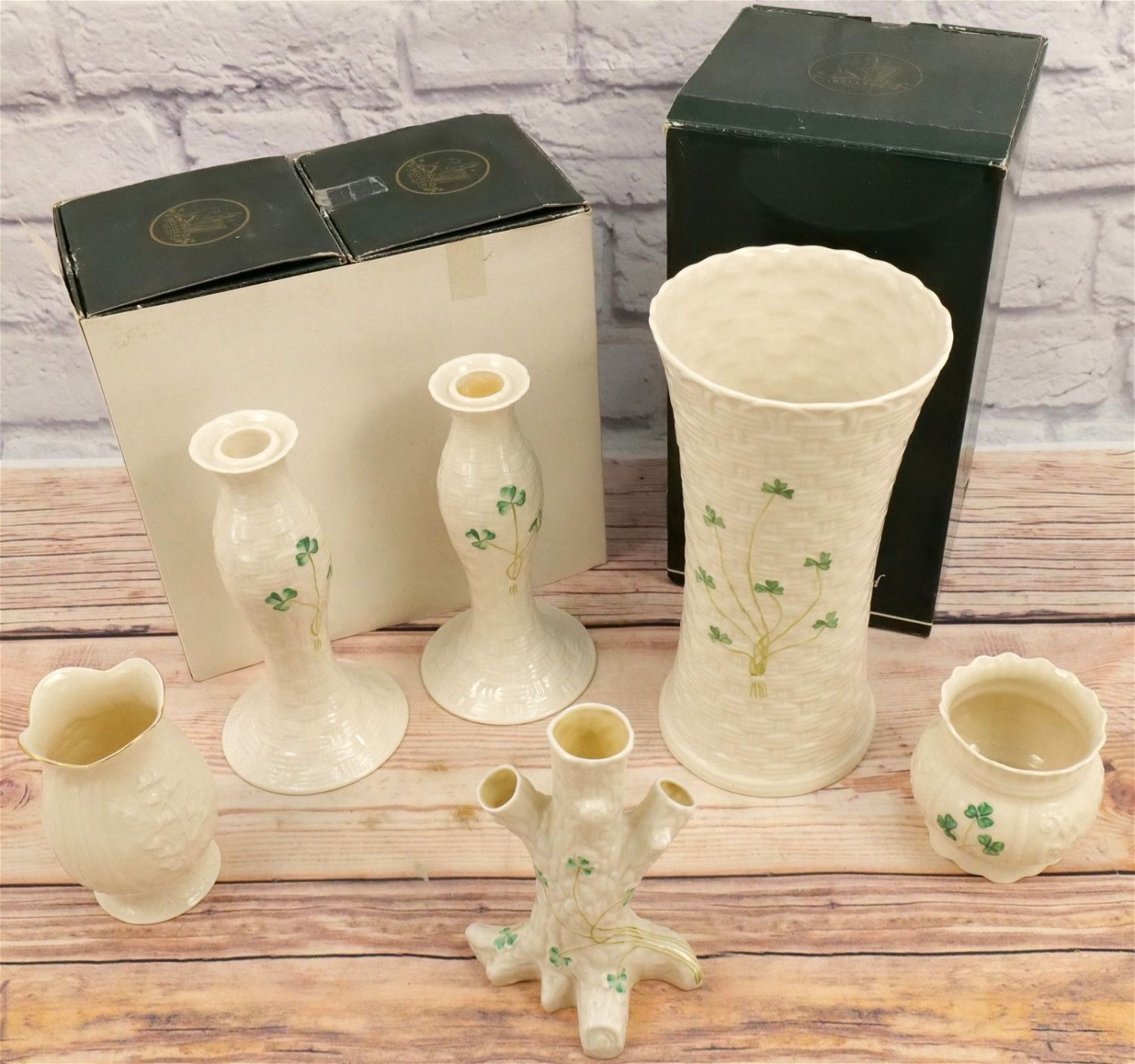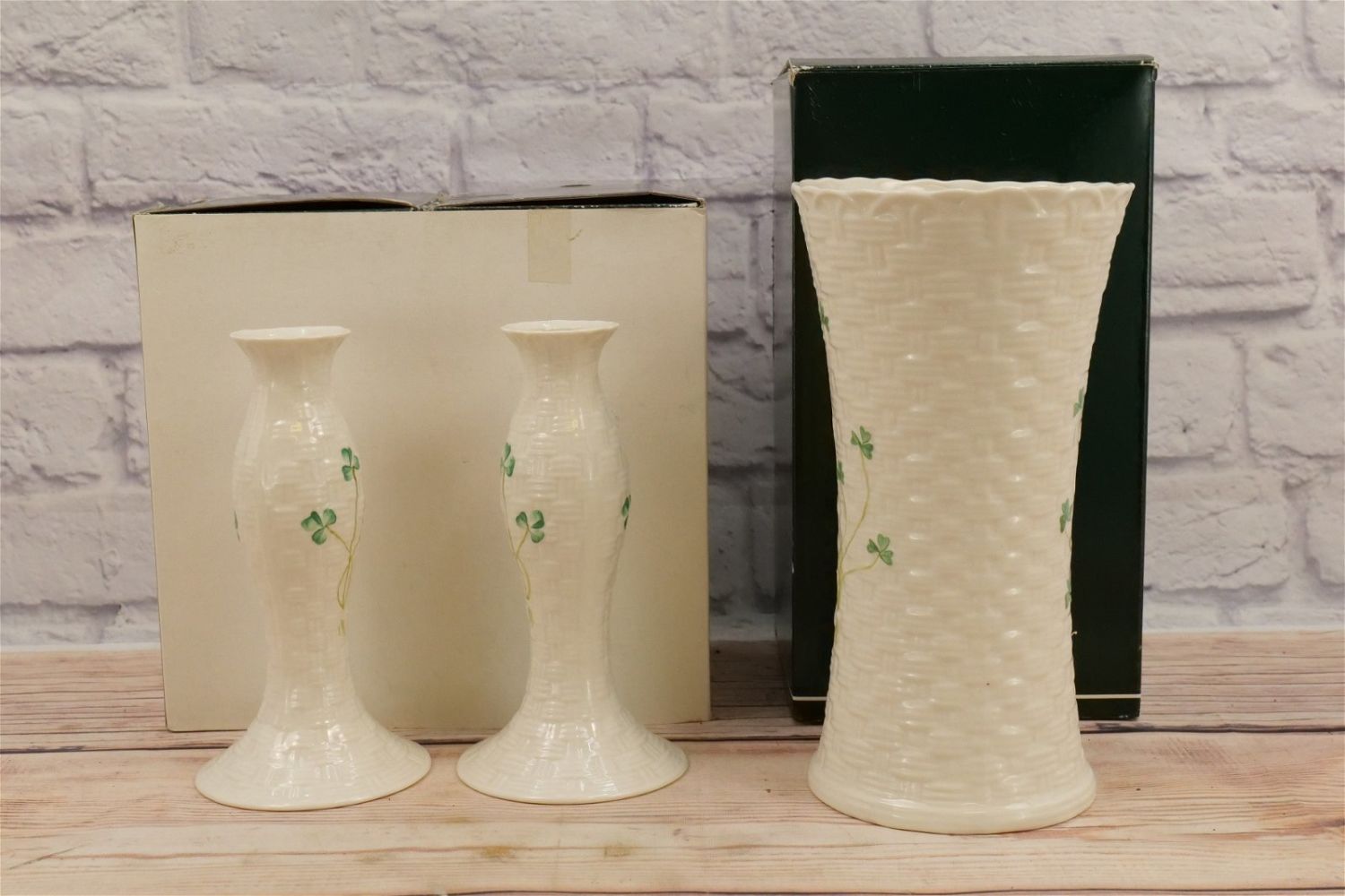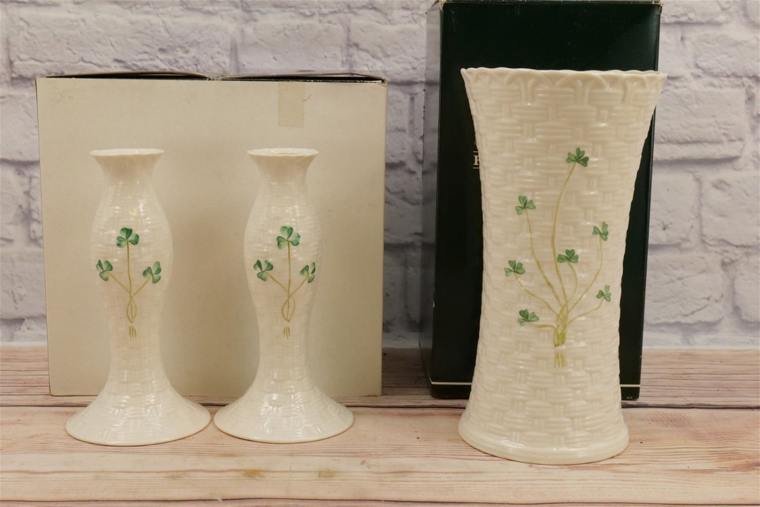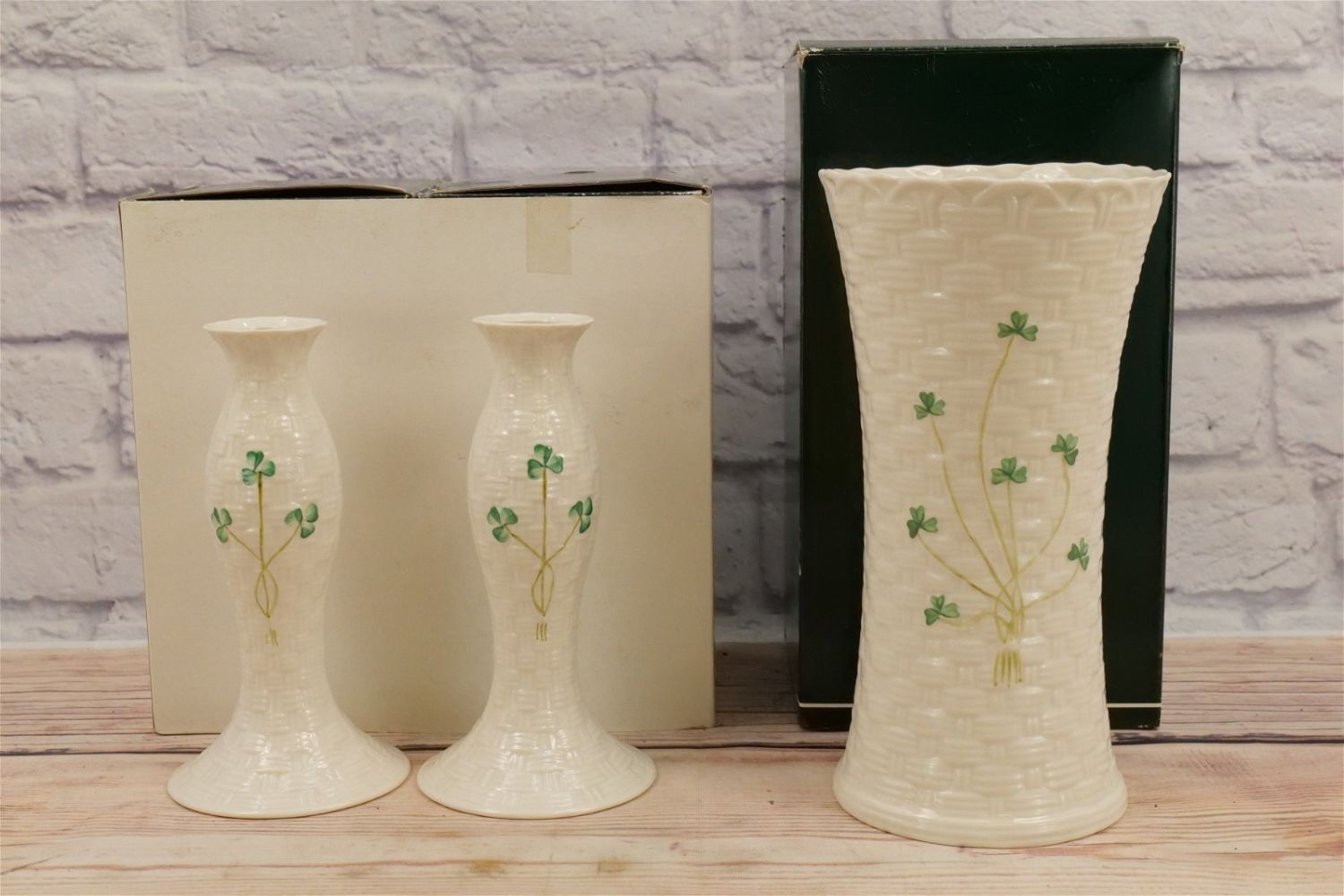 Lot of Belleek Porcelain. Including Pair of Kylemore Candlesticks with Box, Colleen Vase with Box, and 3 other vases without boxes. Largest piece measures 9.75" tall. All invoices must be paid for within 24 hours. We offer multiple shipping options, please read the terms as they have changed. We also offer pick ups on Friday, Saturday and Monday immediately following the sale BY APPOINTMENT ONLY. PLEASE READ THE TERMS!!!