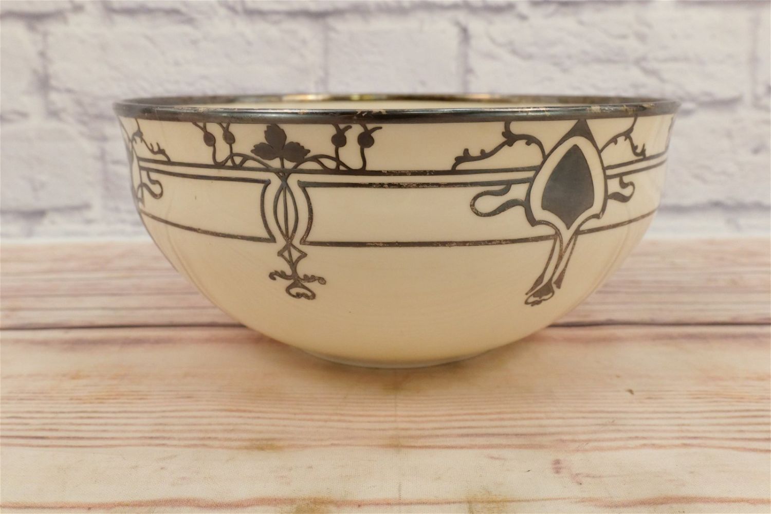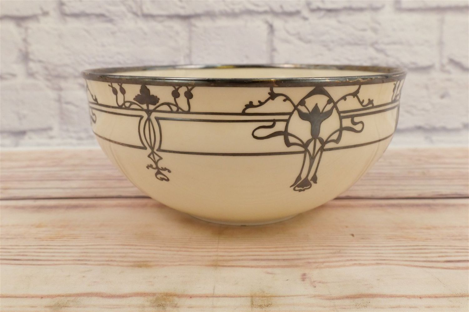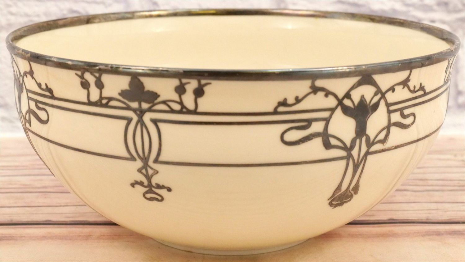 Belleek Porcelain with Silver Overlay Center Bowl. Some light rubbing to the overlay on the rim. Measures 4" tall x 9" diameter. All invoices must be paid for within 24 hours. We offer multiple shipping options, please read the terms as they have changed. We also offer pick ups on Friday, Saturday and Monday immediately following the sale BY APPOINTMENT ONLY. PLEASE READ THE TERMS!!!