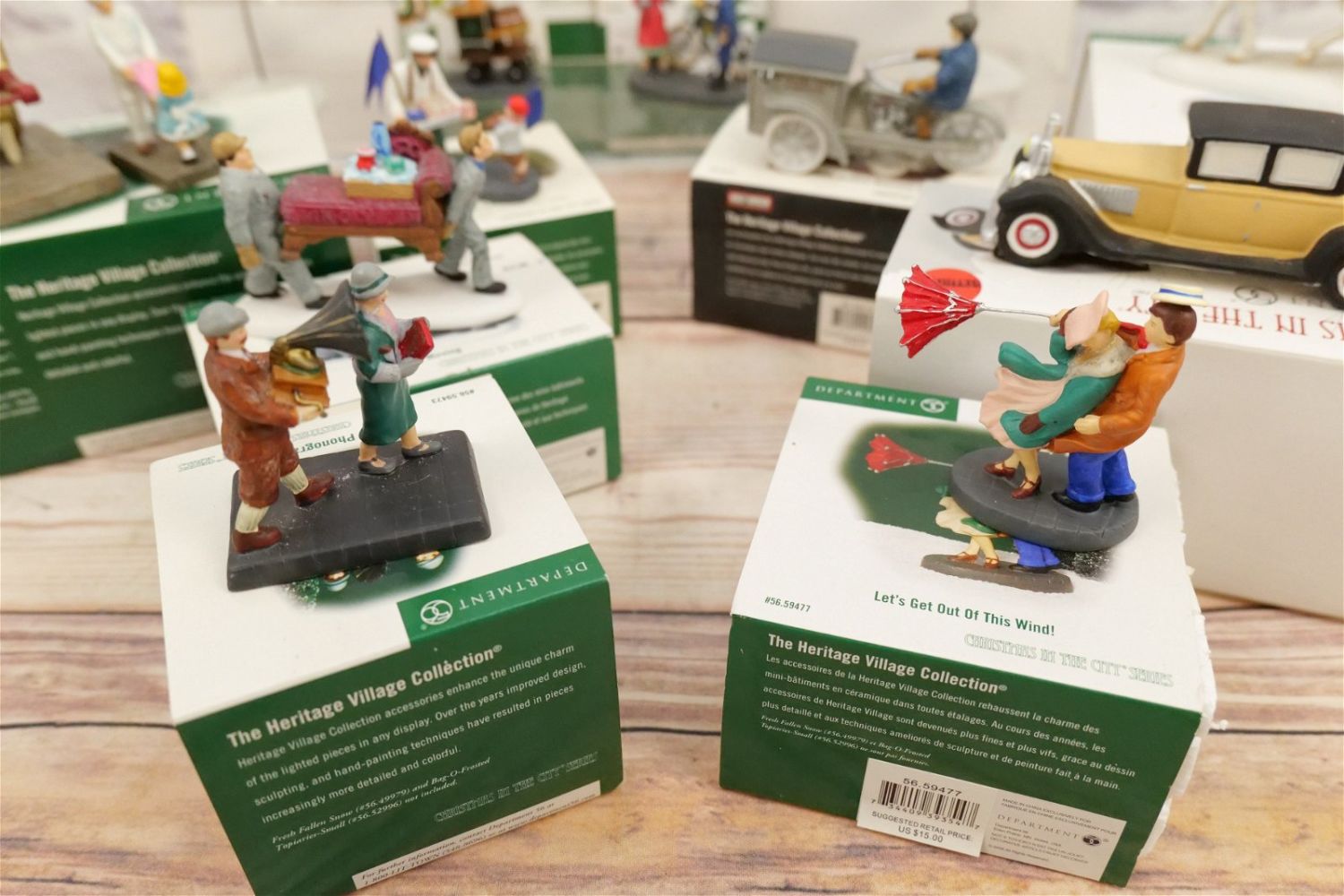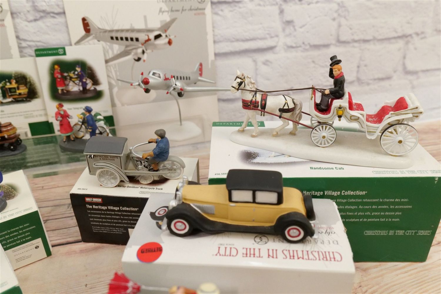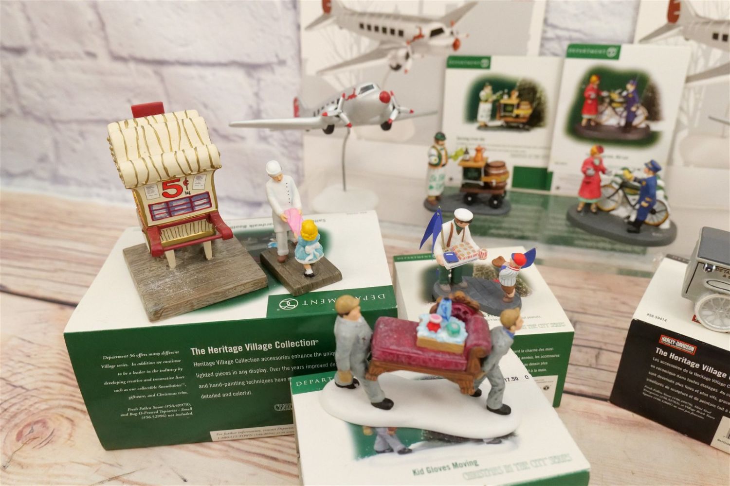 Lot of Department 56 Accessories including Harley Davidson Motorcycle Truck, Saltwater Taffy Boardwalk Booth, Handsome Cab, A New Photograph, Peanuts Pennants and Programs, Your Telegram Ma’am, Kid Gloves Moving, Let’s Get Out of this Wind, Flying Home for Christmas and City Cars. Most have boxes. Some have outer sleeves only. Majority seem to be in good condition. All Items in this sale have been on display and are in Used Condition. Most are assumed to not be complete or have small nicks/chips from being displayed unless noted in the description otherwise.. Some may be customized as well. Please examine photographs closely. All invoices must be paid within 24 hours of the sale. We offer multiple shipping options, please read the terms as they have changed. We also offer Pick-Ups Thursday, Friday, Saturday, and Monday immediately following the sale. BY APPOINTMENT ONLY. PLEASE READ THE NEW TERMS!!!