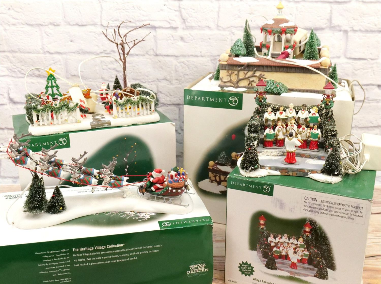 Lot of 4 Department 56 Accessories including Classic Village Square, Village Animated Singers, Santa’s Sleigh, and Festive Front Yard. All appear to be in good condition. Three come with power cords. All Items in this sale have been on display and are in Used Condition. Most are assumed to not be complete or have small nicks/chips from being displayed unless noted in the description otherwise.. Some may be customized as well. Please examine photographs closely. All invoices must be paid within 24 hours of the sale. We offer multiple shipping options, please read the terms as they have changed. We also offer Pick-Ups Thursday, Friday, Saturday, and Monday immediately following the sale. BY APPOINTMENT ONLY. PLEASE READ THE NEW TERMS!!!