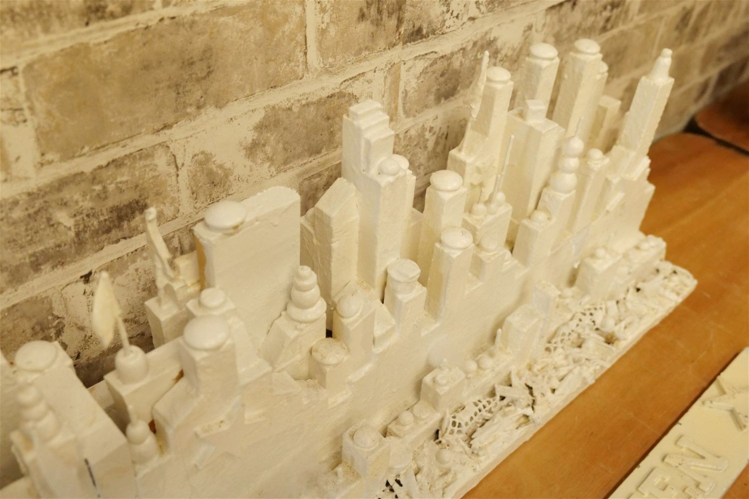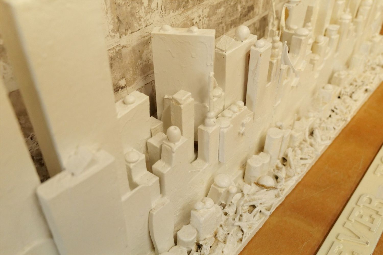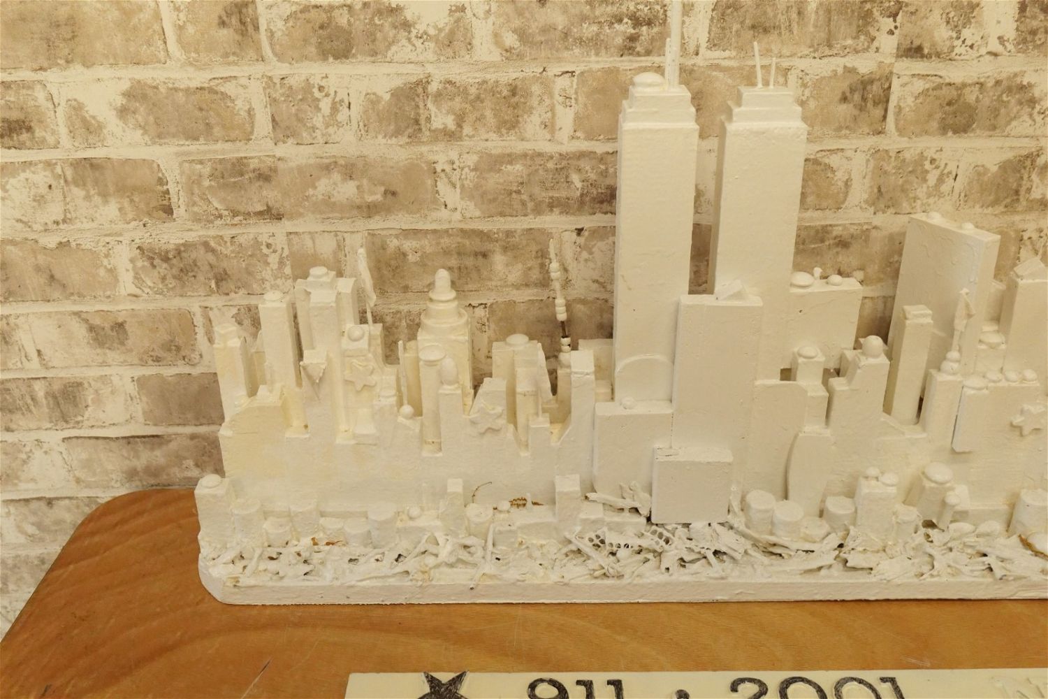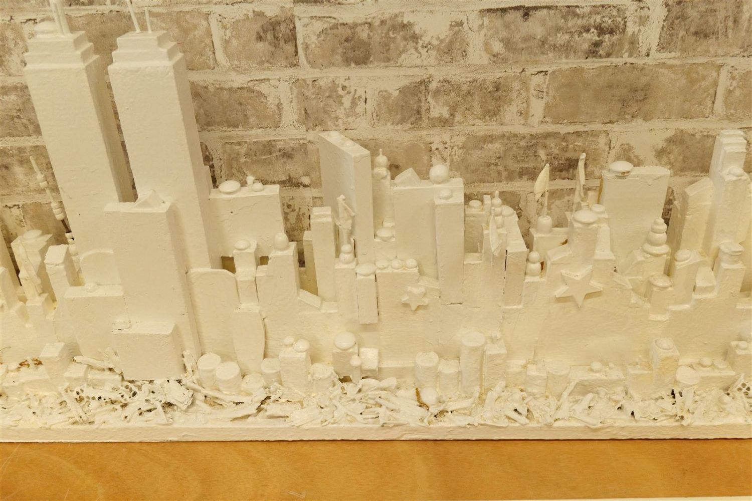 Abstract Display of New York City Skyline with Twin Towers. Artist – Ed Tikkanen. Painted Carved Wood/Composition/Plastic. May be missing a couple of pieces. Overall good condition. Measures 19" tall x 52" wide x 7" deep. All Items in this sale have been on display and are in Used Condition. Most are assumed to not be complete or have small nicks/chips from being displayed unless noted in the description otherwise.. Some may be customized as well. Please examine photographs closely. All invoices must be paid within 24 hours of the sale. We offer multiple shipping options, please read the terms as they have changed. We also offer Pick-Ups Thursday, Friday, Saturday, and Monday immediately following the sale. BY APPOINTMENT ONLY. PLEASE READ THE NEW TERMS!!!