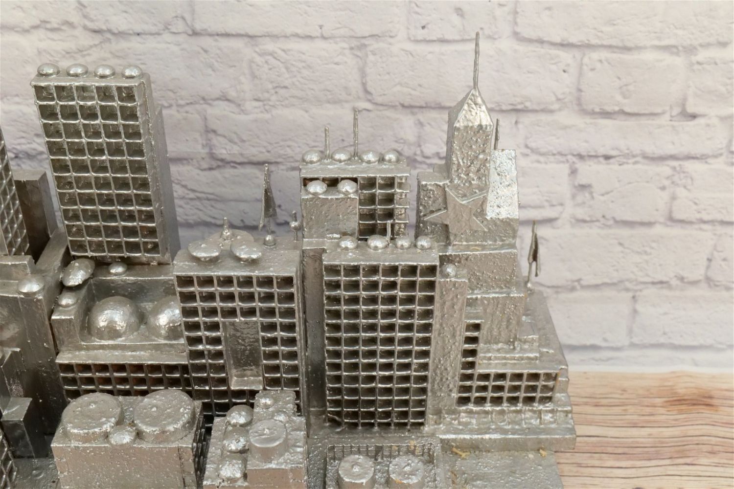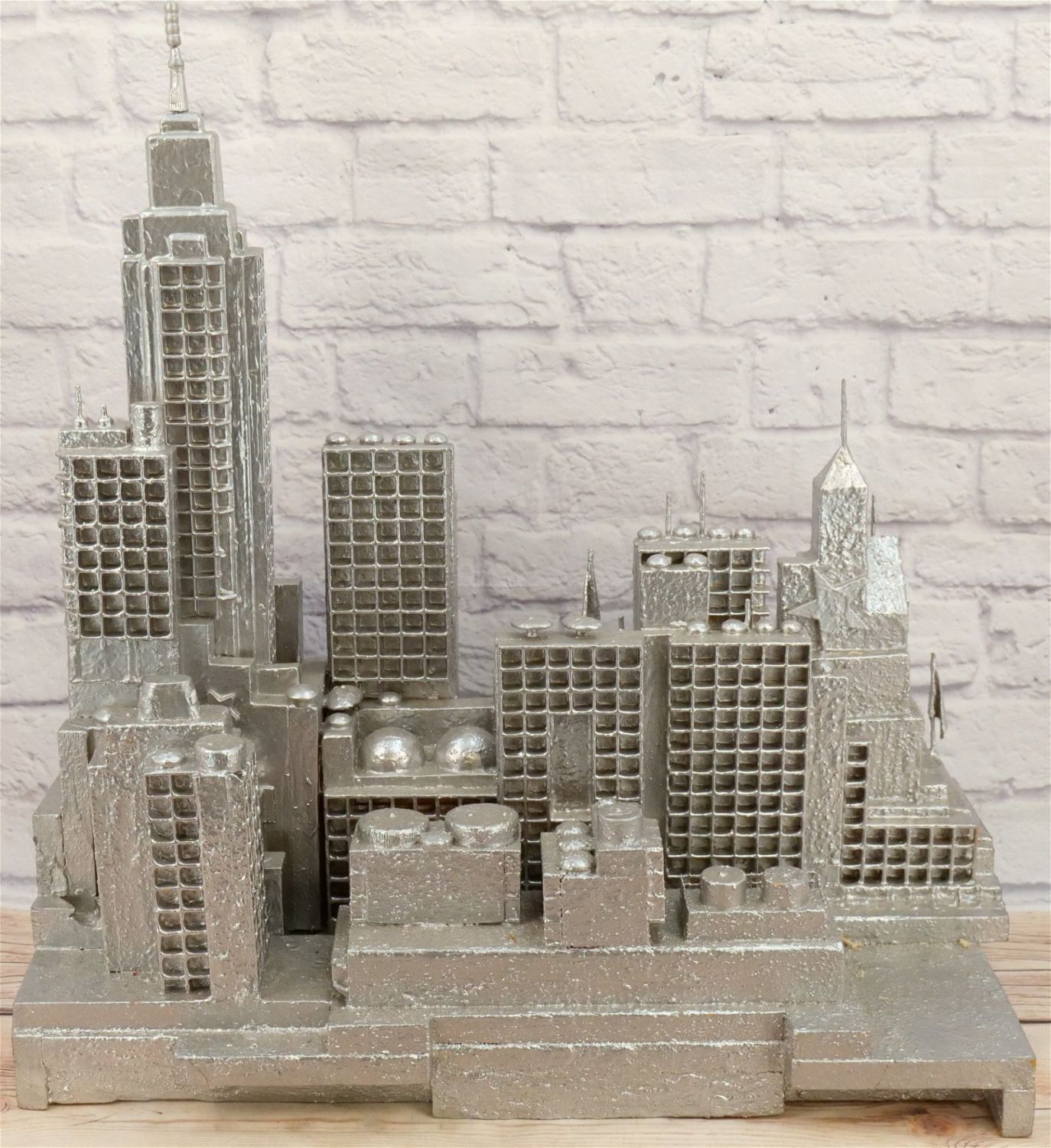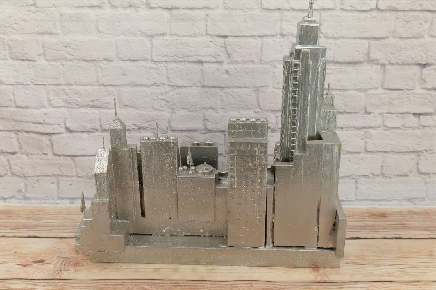 Abstract Display of New York City Skyline with Empire State Building. Artist – Ed Tikkanen. Painted Carved Wood/Composition/Plastic. May be missing a couple of pieces. Overall good condition. Measures 19" tall x 52" wide x 7" deep. All Items in this sale have been on display and are in Used Condition. Most are assumed to not be complete or have small nicks/chips from being displayed unless noted in the description otherwise.. Some may be customized as well. Please examine photographs closely. All invoices must be paid within 24 hours of the sale. We offer multiple shipping options, please read the terms as they have changed. We also offer Pick-Ups Thursday, Friday, Saturday, and Monday immediately following the sale. BY APPOINTMENT ONLY. PLEASE READ THE NEW TERMS!!!