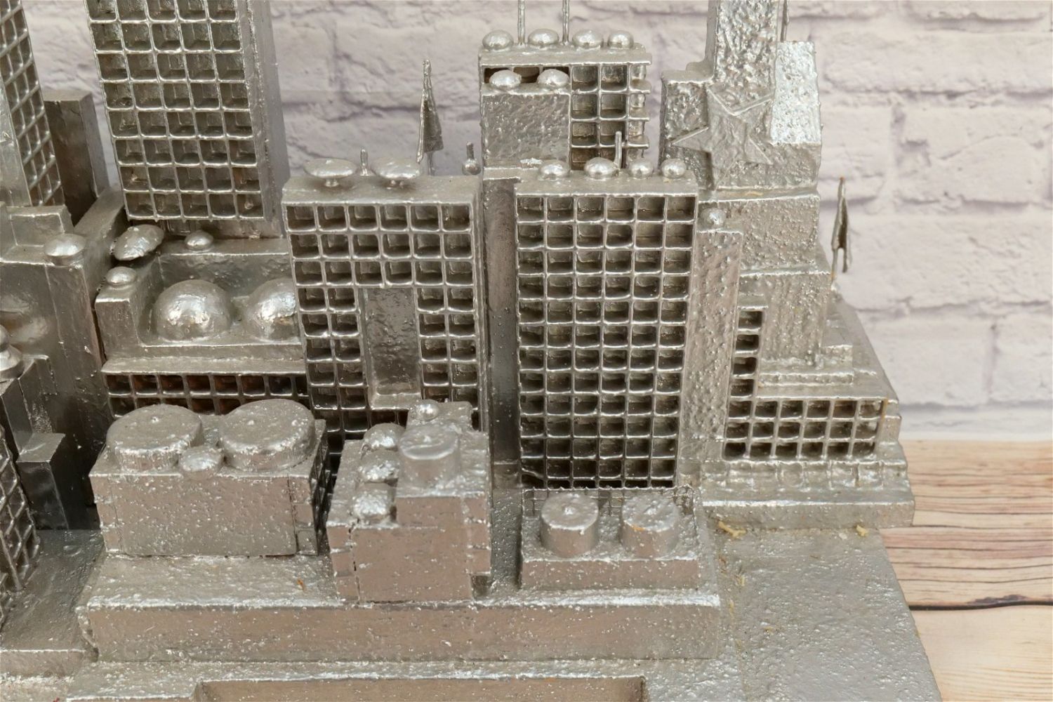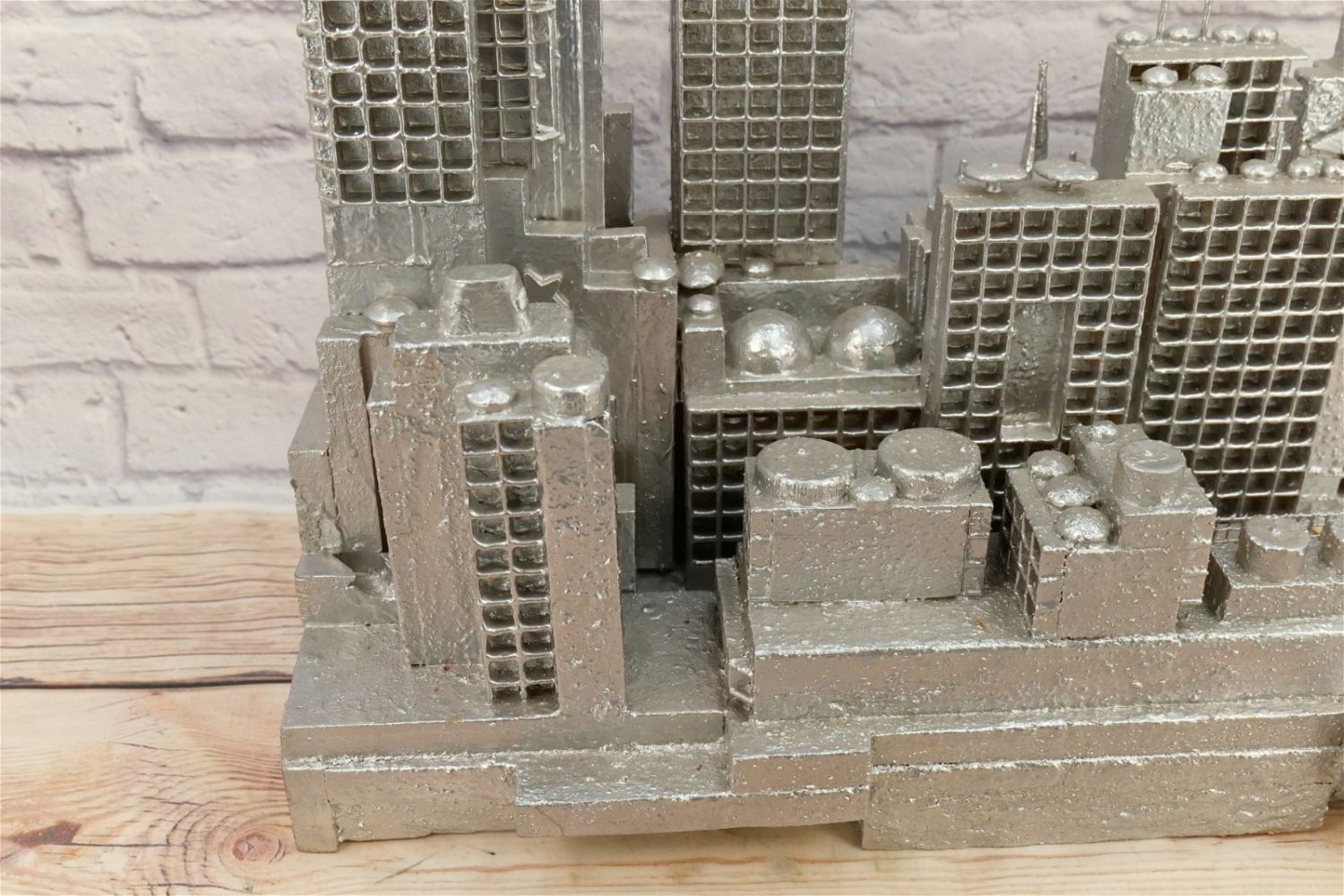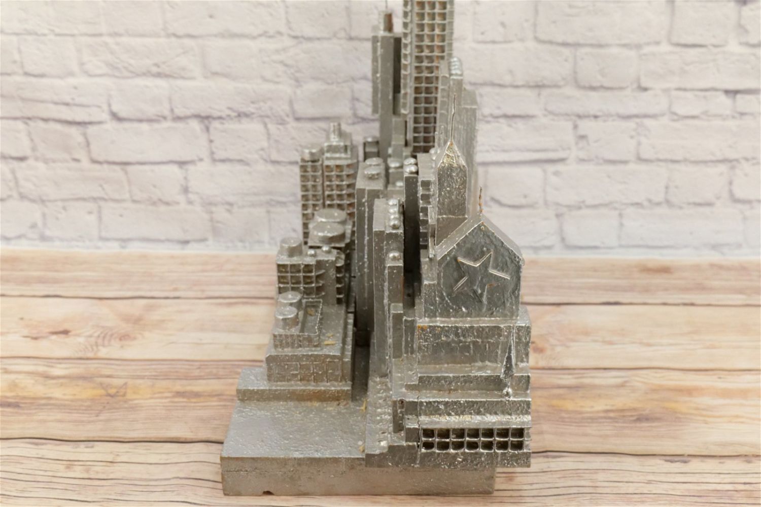 Abstract Display of New York City Skyline with Empire State Building. Artist – Ed Tikkanen. Painted Carved Wood/Composition/Plastic. May be missing a couple of pieces. Overall good condition. Measures 19" tall x 52" wide x 7" deep. All Items in this sale have been on display and are in Used Condition. Most are assumed to not be complete or have small nicks/chips from being displayed unless noted in the description otherwise.. Some may be customized as well. Please examine photographs closely. All invoices must be paid within 24 hours of the sale. We offer multiple shipping options, please read the terms as they have changed. We also offer Pick-Ups Thursday, Friday, Saturday, and Monday immediately following the sale. BY APPOINTMENT ONLY. PLEASE READ THE NEW TERMS!!!