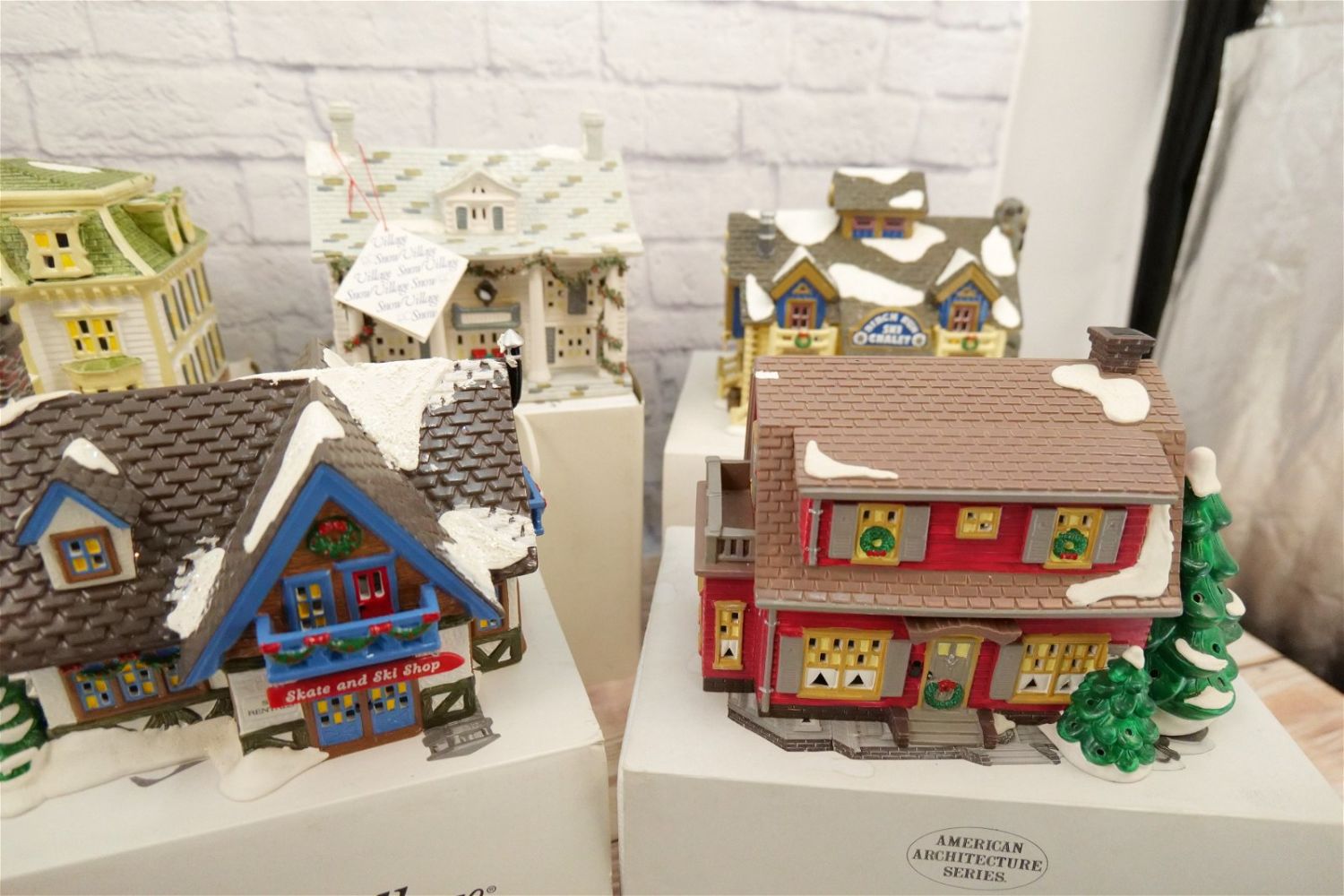 Lot of 7 Department 56 Snow Village Houses including Cumberland, Birch Run Ski Chalet – With Skis, Skate & Ski Shop, Hartford House – Minor chipping by light insert, Dutch Colonial – Chip on Rooftop, The Honeymooner Hotel – Small chip by vacancy sign and box has heavier damage, and Maple Ridge Inn. Comes with 7 Light Cords. All Items in this sale have been on display and are in Used Condition. Most are assumed to not be complete or have small nicks/chips from being displayed unless noted in the description otherwise.. Some may be customized as well. Please examine photographs closely. All invoices must be paid within 24 hours of the sale. We offer multiple shipping options, please read the terms as they have changed. We also offer Pick-Ups Thursday, Friday, Saturday, and Monday immediately following the sale. BY APPOINTMENT ONLY. PLEASE READ THE NEW TERMS!!!