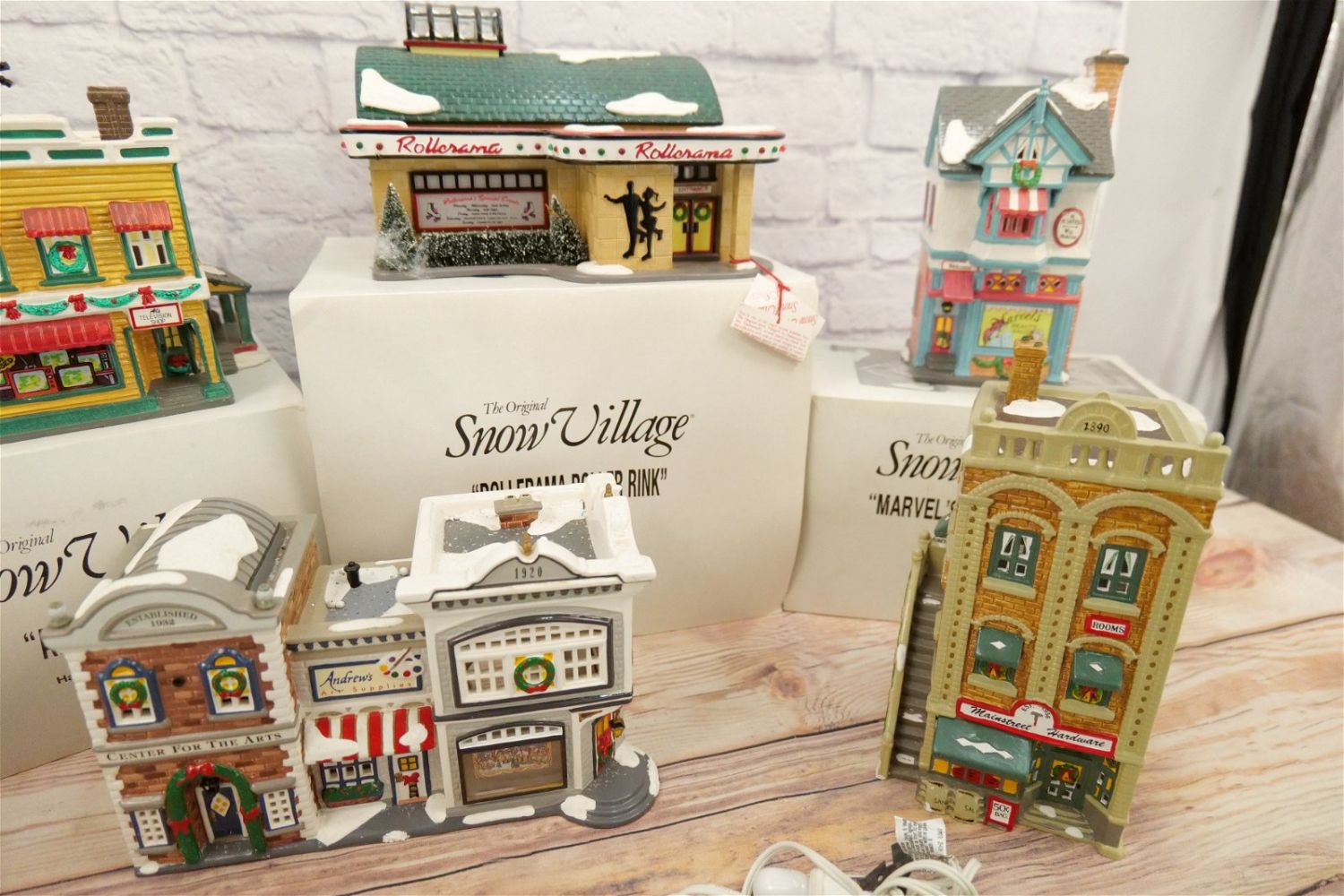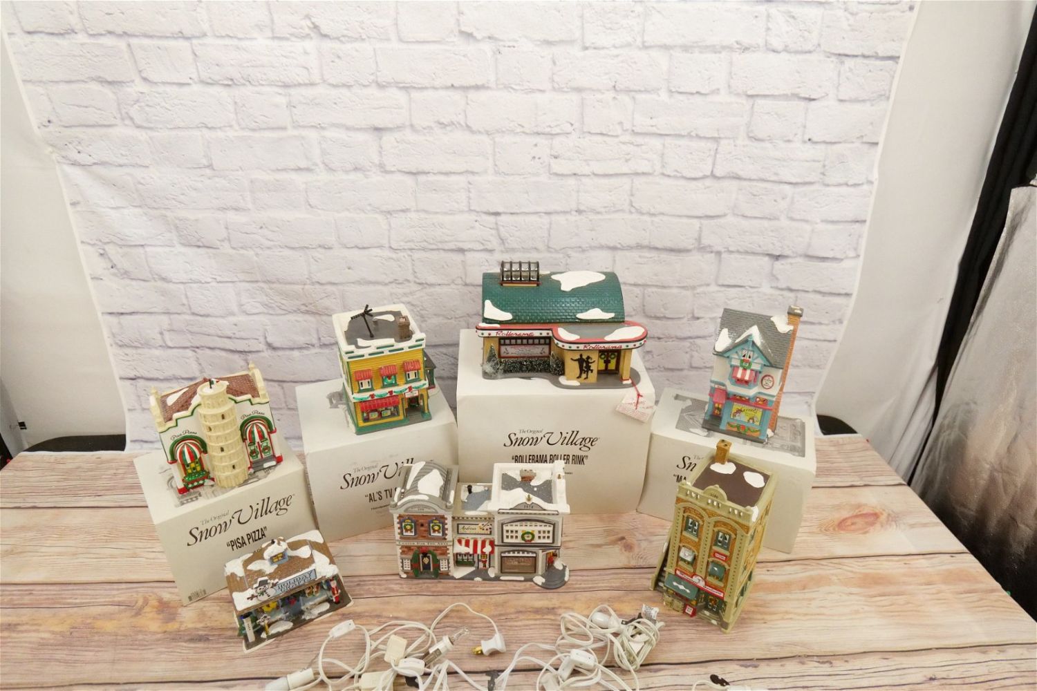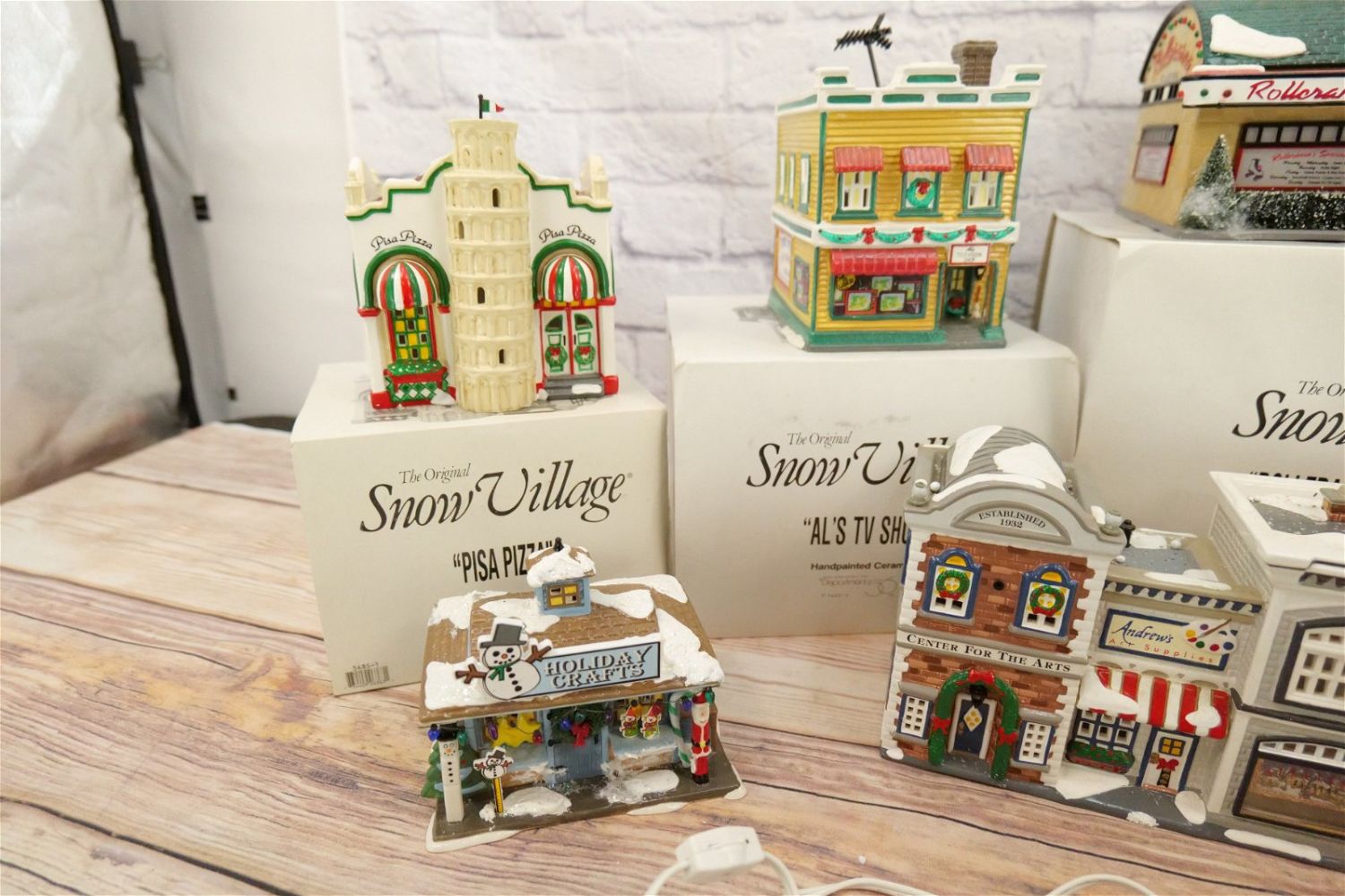 Lot of 7 Department 56 Snow Village Houses including Rollerama Roller Rink, Al’s TV Shop – Antenna is loose on roof and some chipping present, Marvel’s Beauty Salon, Pisa Pizza – Minor Chips, Holiday Crafts – No Specialty Cord – Missing Styrofoam – Comes with outer sleeve, Center for the Arts – Minor chipping on base – No Box, and Mainstreet Hardware – Minor chipping by light insert – No Box. Comes with 5 Light Cords. All Items in this sale have been on display and are in Used Condition. Most are assumed to not be complete or have small nicks/chips from being displayed unless noted in the description otherwise.. Some may be customized as well. Please examine photographs closely. All invoices must be paid within 24 hours of the sale. We offer multiple shipping options, please read the terms as they have changed. We also offer Pick-Ups Thursday, Friday, Saturday, and Monday immediately following the sale. BY APPOINTMENT ONLY. PLEASE READ THE NEW TERMS!!!