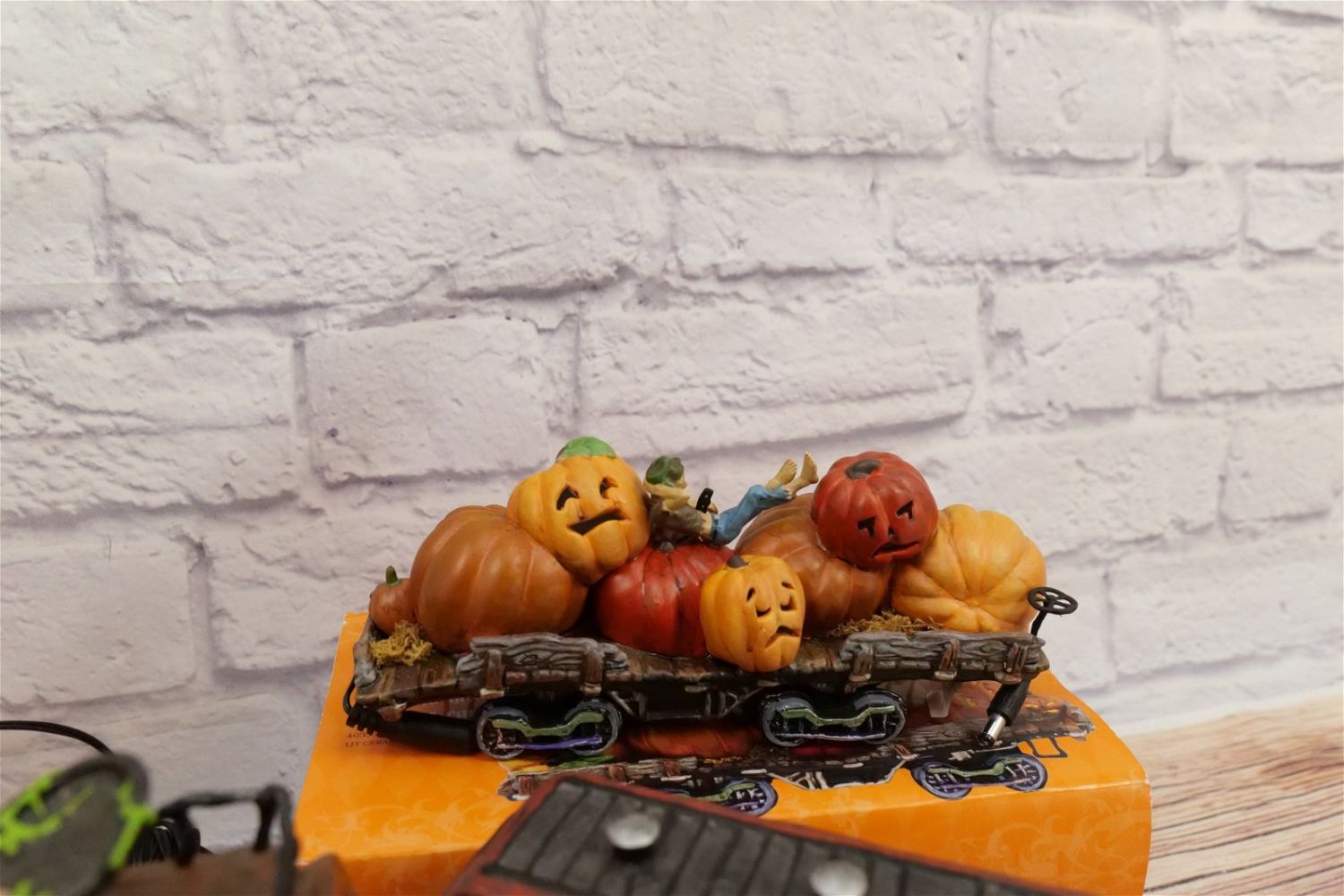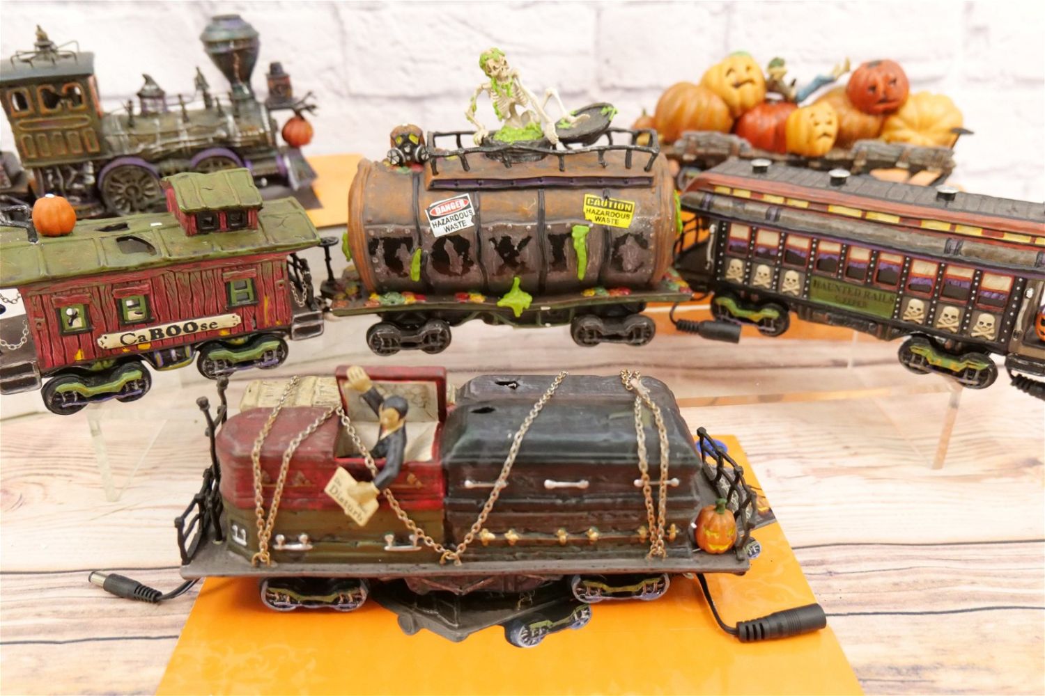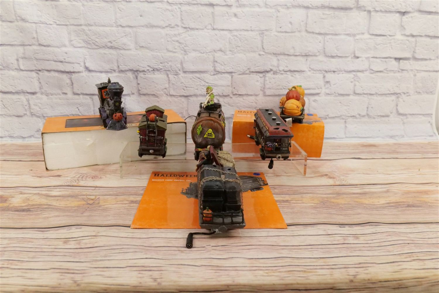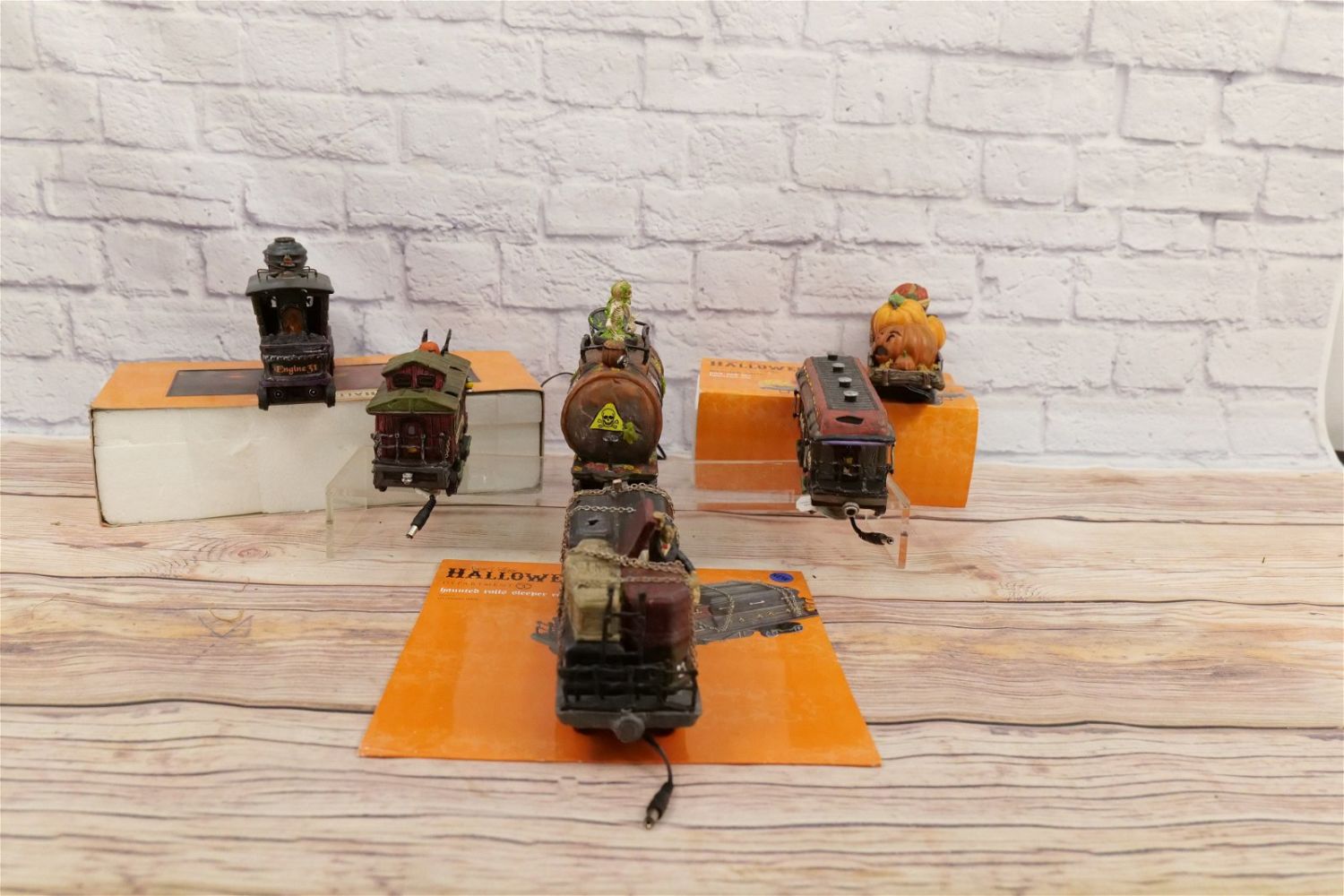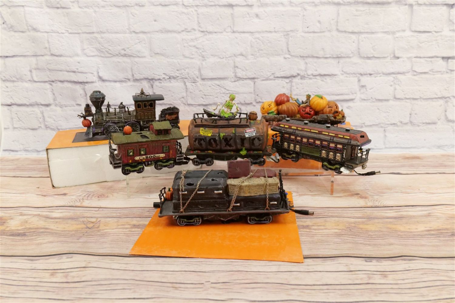 Lot of 6 Department 56 Haunted Rails Train Cars including Engine and Coal Car with Box, Jack and His Lanterns Car with Box, Sleeper Car – Missing Styrofoam – Has Outer Sleeve, Toxic Car – Some chipping – No Box, Sleeper Car – Some minor chips – No Box, and Caboose – Missing Searchlight and Broken Stem on Pumpkin. Comes with 1 Power Cord. All Items in this sale have been on display and are in Used Condition. Most are assumed to not be complete or have small nicks/chips from being displayed unless noted in the description otherwise.. Some may be customized as well. Please examine photographs closely. All invoices must be paid within 24 hours of the sale. We offer multiple shipping options, please read the terms as they have changed. We also offer Pick-Ups Thursday, Friday, Saturday, and Monday immediately following the sale. BY APPOINTMENT ONLY. PLEASE READ THE NEW TERMS!!!