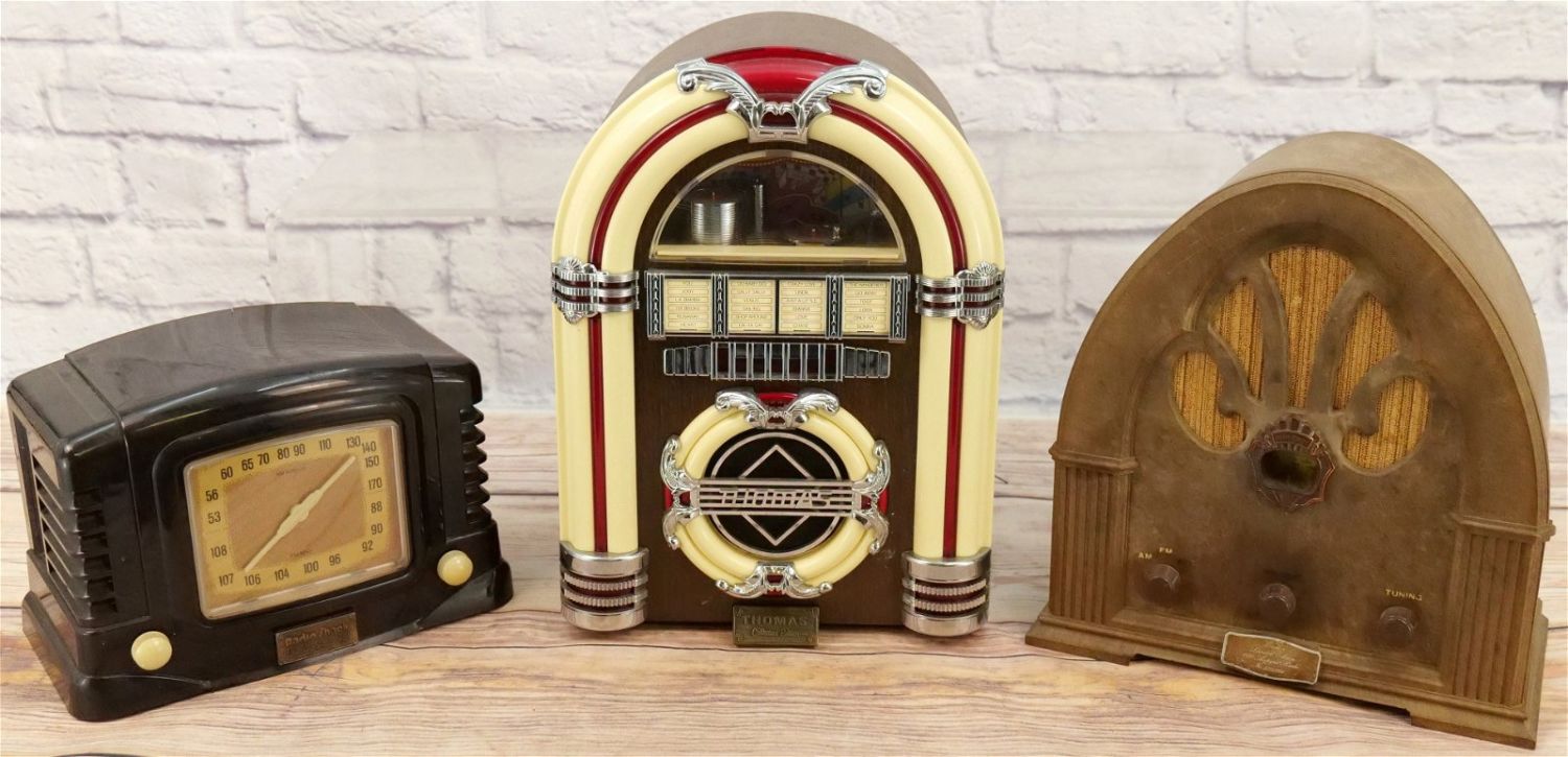 Lot of 3 Novelty Radios including Radio Shack Retro, Windsor Limited Edition Retro Radio, and Thomas Collector Edition Jukebox Radio. All in Used Condition. This Collection was displayed in the house and all items are untested. All invoices must be paid within 24 hours of the sale. We offer multiple shipping options, please read the terms as they have changed. We also offer Pick-Ups Thursday, Friday, Saturday, and Monday immediately following the sale. BY APPOINTMENT ONLY. PLEASE READ THE NEW TERMS!!!