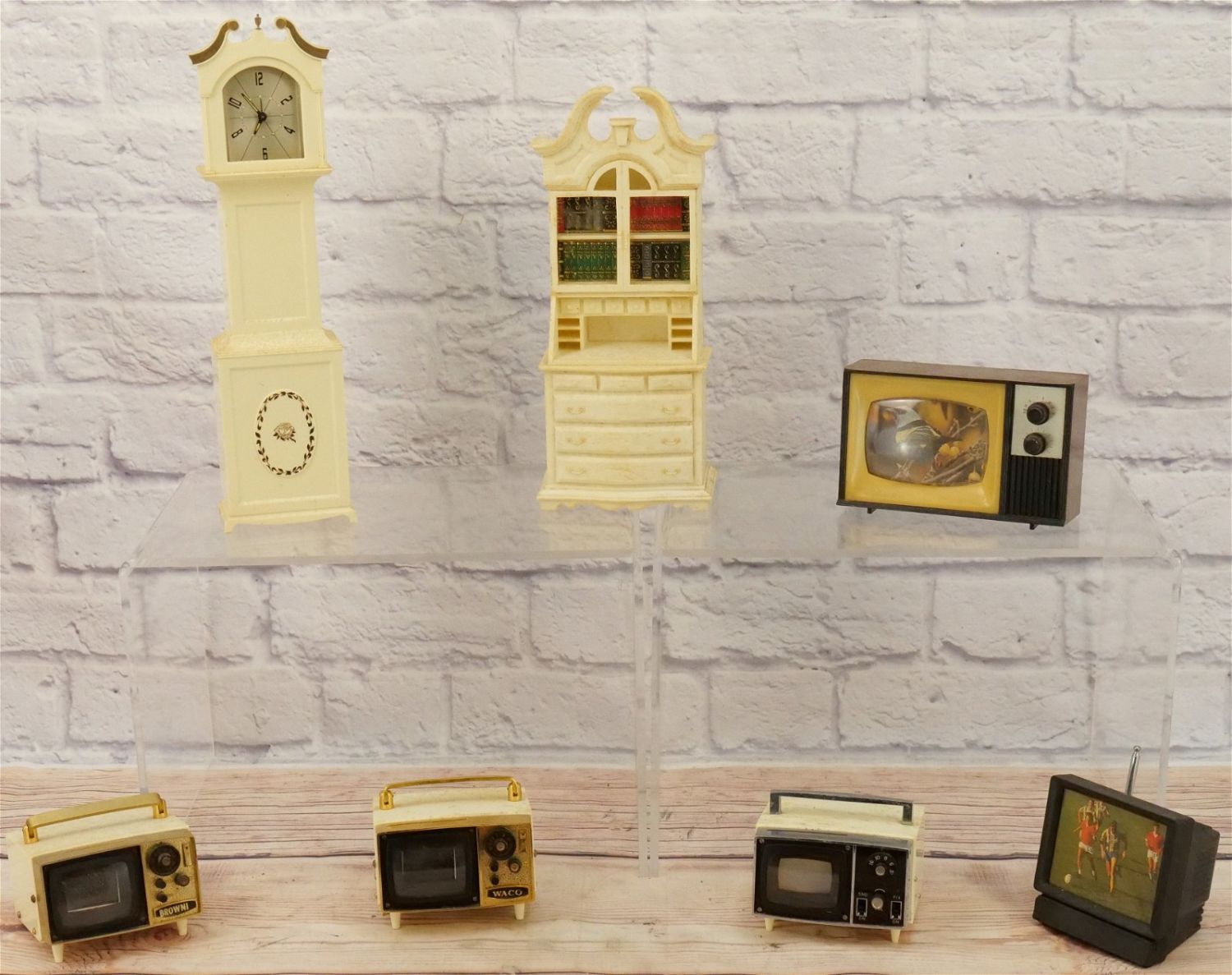 Lot of 7 TV and Furniture Novelty Radios including Grandfather Clock, Secretary, and (5) Television Sets. All in Used Condition. This Collection was displayed in the house and all items are untested. All invoices must be paid within 24 hours of the sale. We offer multiple shipping options, please read the terms as they have changed. We also offer Pick-Ups Thursday, Friday, Saturday, and Monday immediately following the sale. BY APPOINTMENT ONLY. PLEASE READ THE NEW TERMS!!!