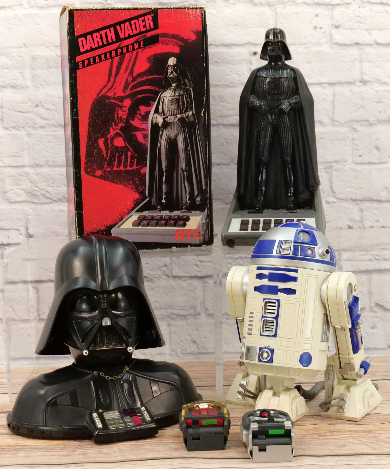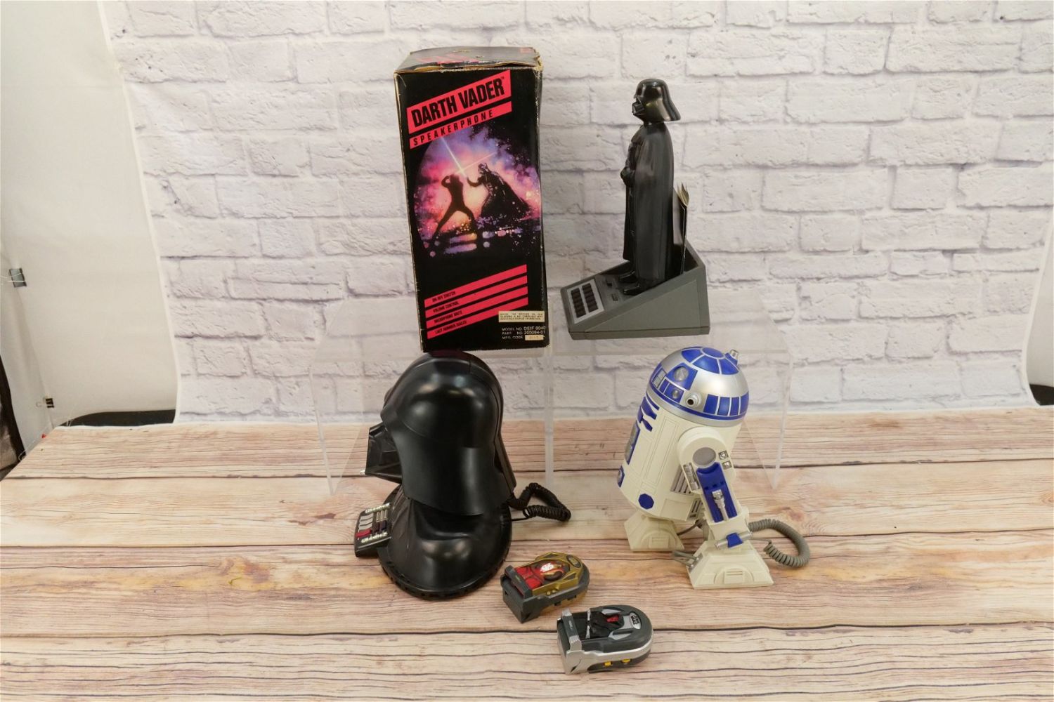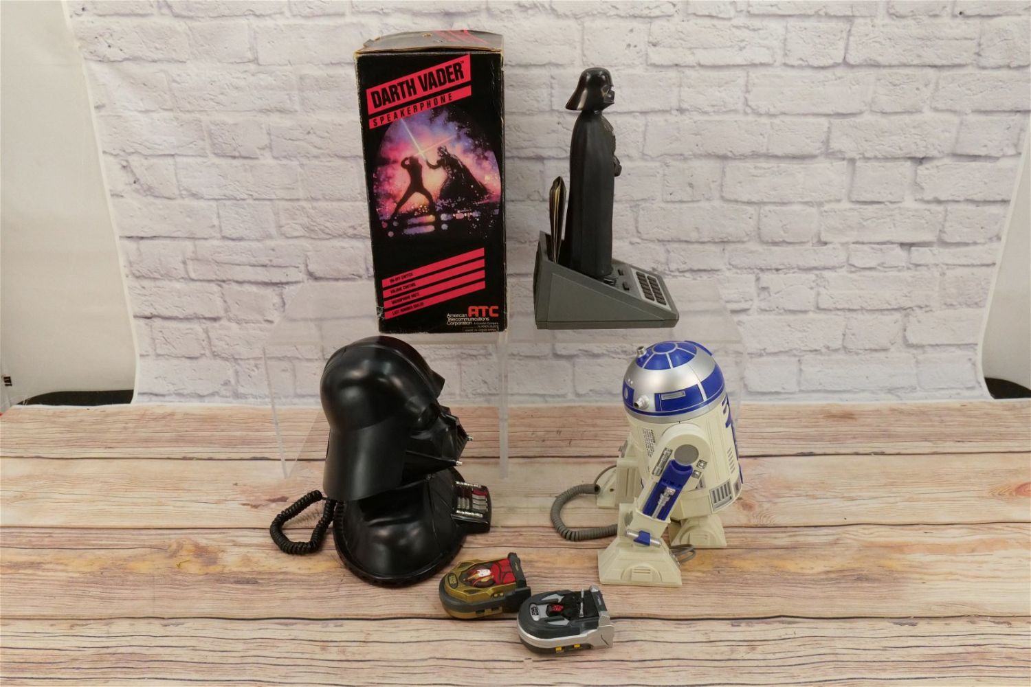 Lot of 5 Star Wars Novelty Telephones including Darth Vader Speakerphone with Box, Darth Vader Bust, R2-D2, and (2) Tiger Electronic Compact Phones – Queen Amidala and Darth Maul. Largest measures 14.5" tall x 6" wide. This Collection was displayed in the house and all items are untested. All invoices must be paid within 24 hours of the sale. We offer multiple shipping options, please read the terms as they have changed. We also offer Pick-Ups Thursday, Friday, Saturday, and Monday immediately following the sale. BY APPOINTMENT ONLY. PLEASE READ THE NEW TERMS!!!