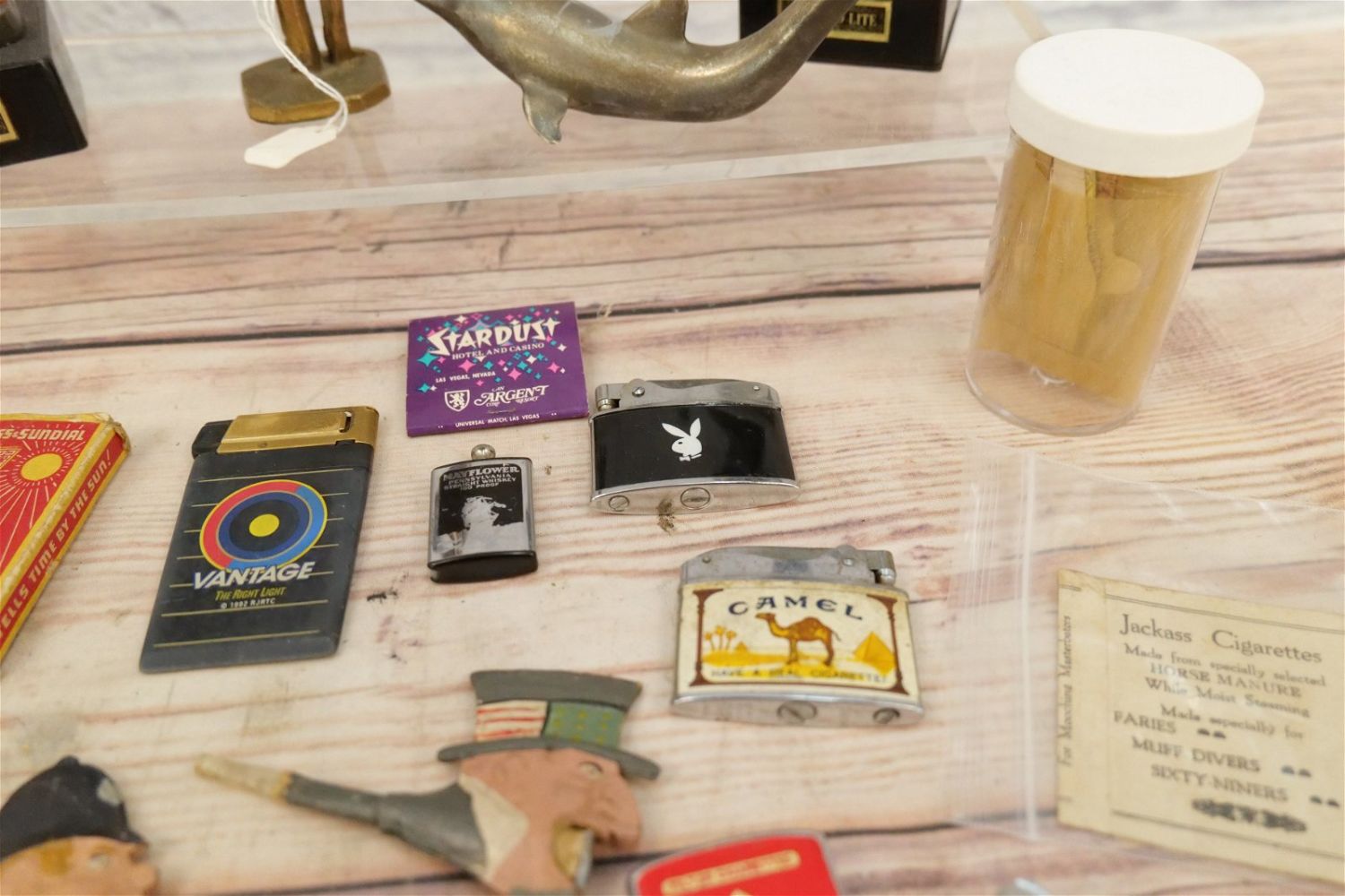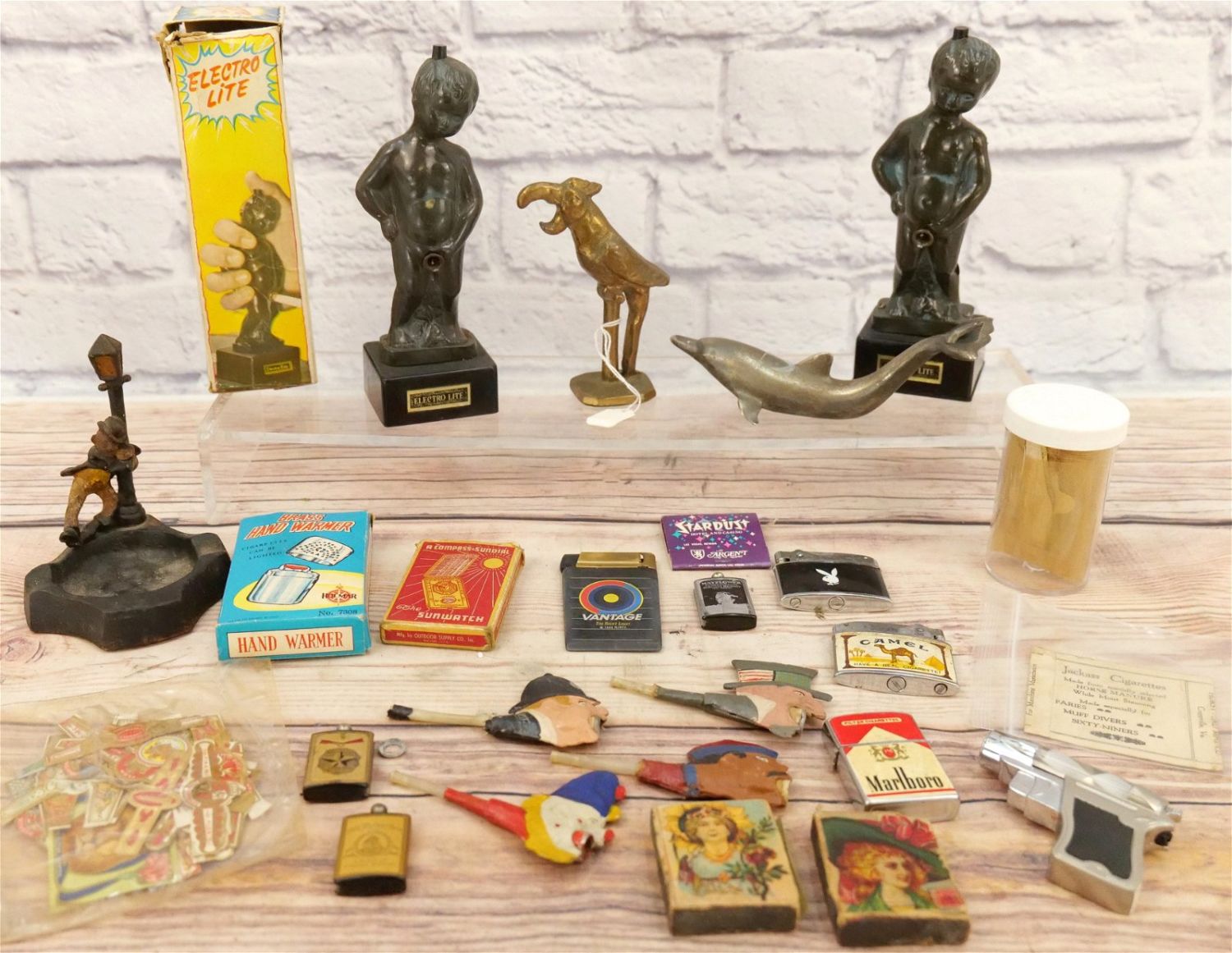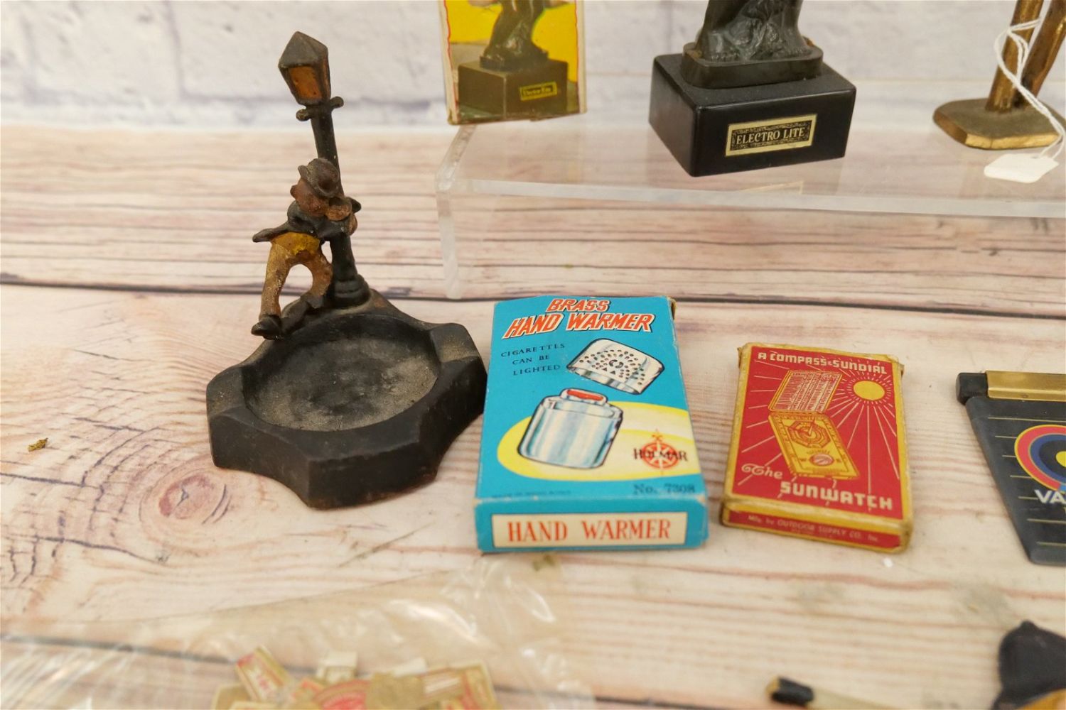 Lot of Mixed Collectibles including Dolphin Bottle Opener, Parrot Bottle Opener, Cast Iron Ashtray of Drunk on Lamppost, Playboy Lighter, (2) Electro-Lite – 1 in Box, The Sunwatch in Box, Brass Hand Warmer in Box, and More. All invoices must be paid within 24 hours of the sale. We offer multiple shipping options, please read the terms as they have changed. We also offer Pick-Ups Thursday, Friday, Saturday, and Monday immediately following the sale. BY APPOINTMENT ONLY. PLEASE READ THE NEW TERMS!!!