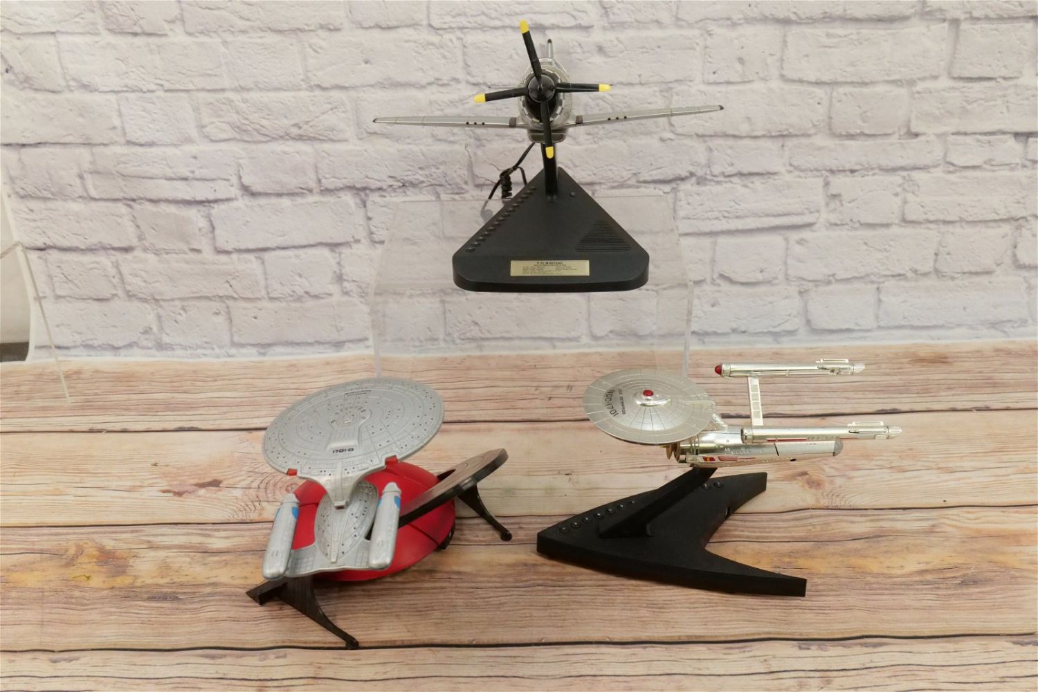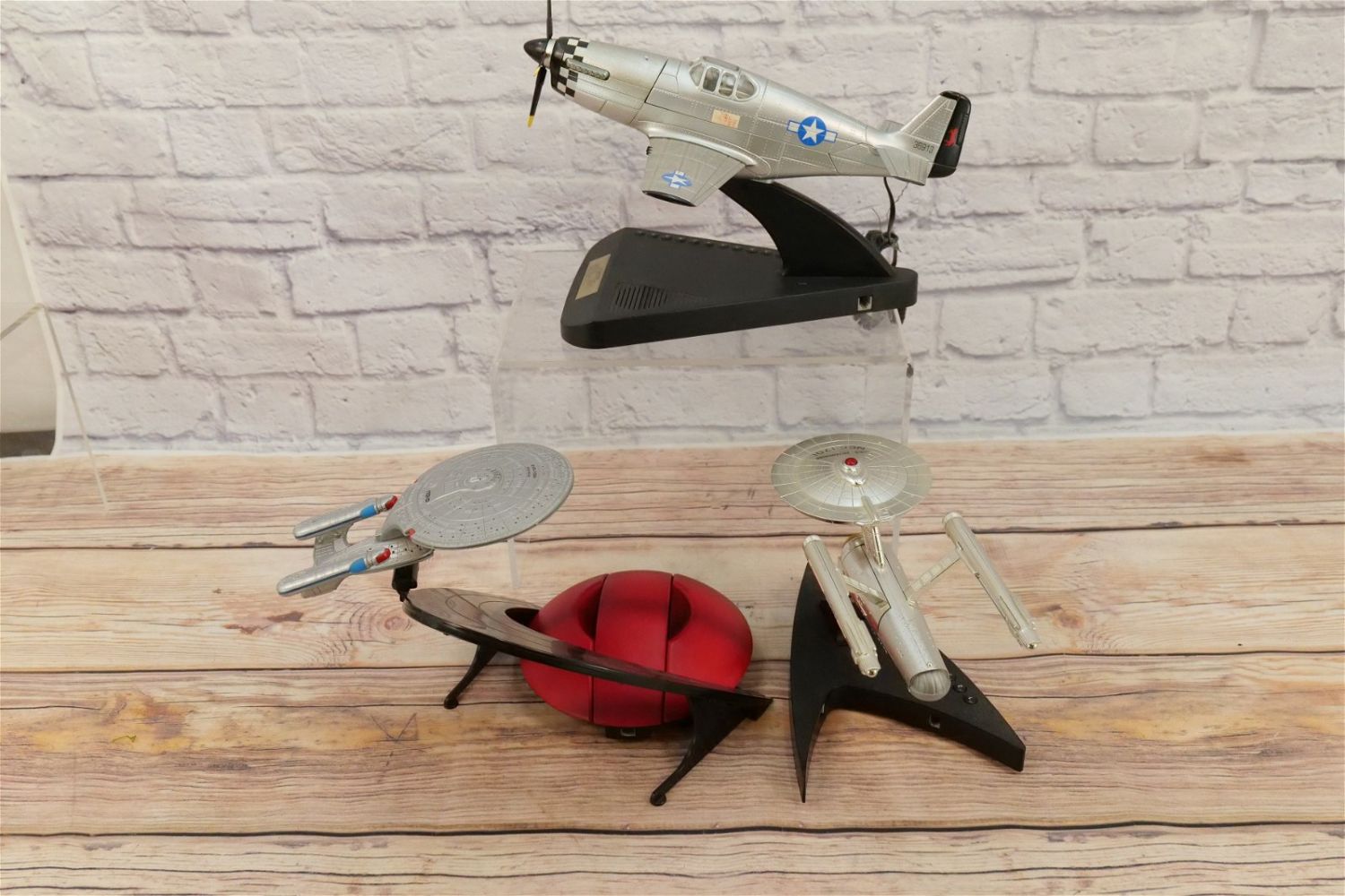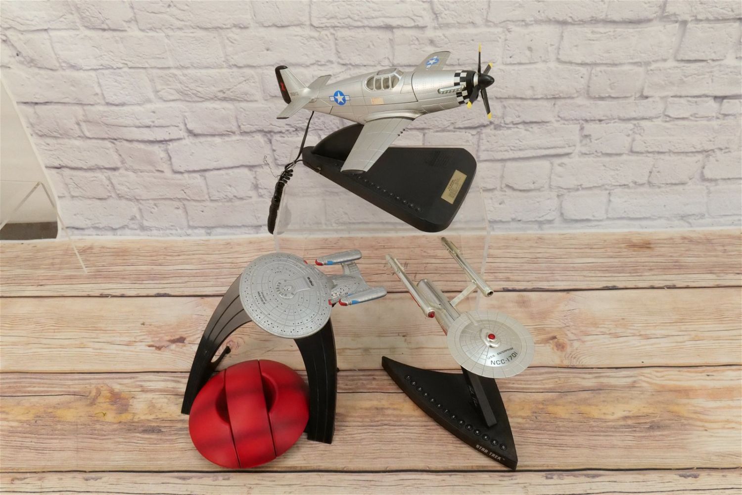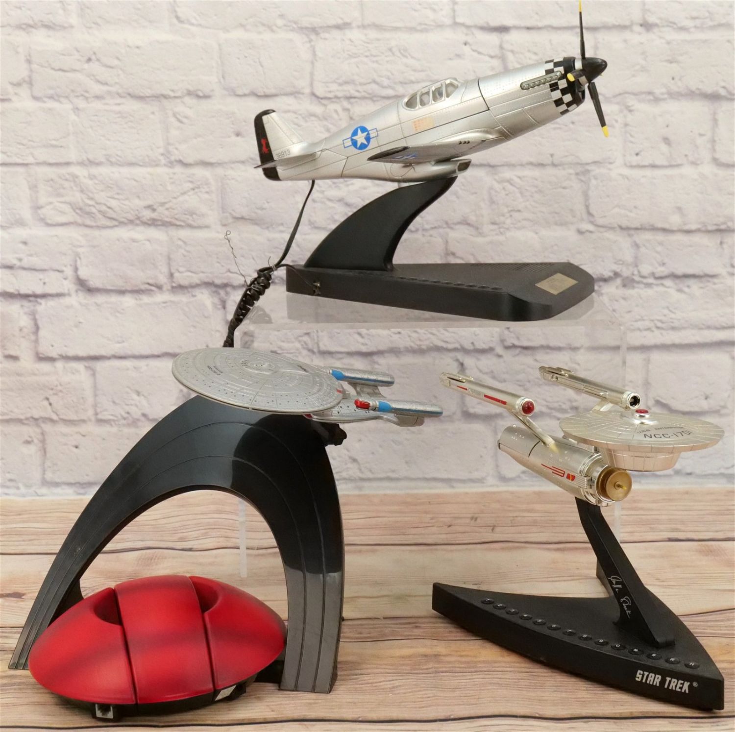 Lot of 3 Novelty Telephones including (2) Star Trek – USS Enterprise NCC-1701 & Enterprise 1701-D, and P-51 Mustang World War 2 Fighter Plane. Largest measures 11" tall x 14" wide. This Collection was displayed in the house and all items are untested. All invoices must be paid within 24 hours of the sale. We offer multiple shipping options, please read the terms as they have changed. We also offer Pick-Ups Thursday, Friday, Saturday, and Monday immediately following the sale. BY APPOINTMENT ONLY. PLEASE READ THE NEW TERMS!!!