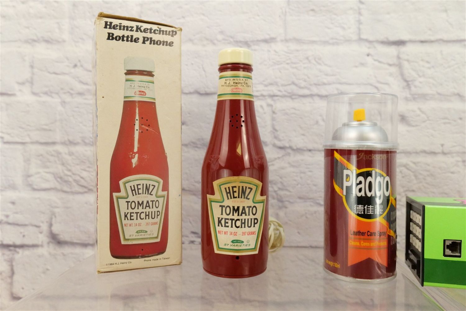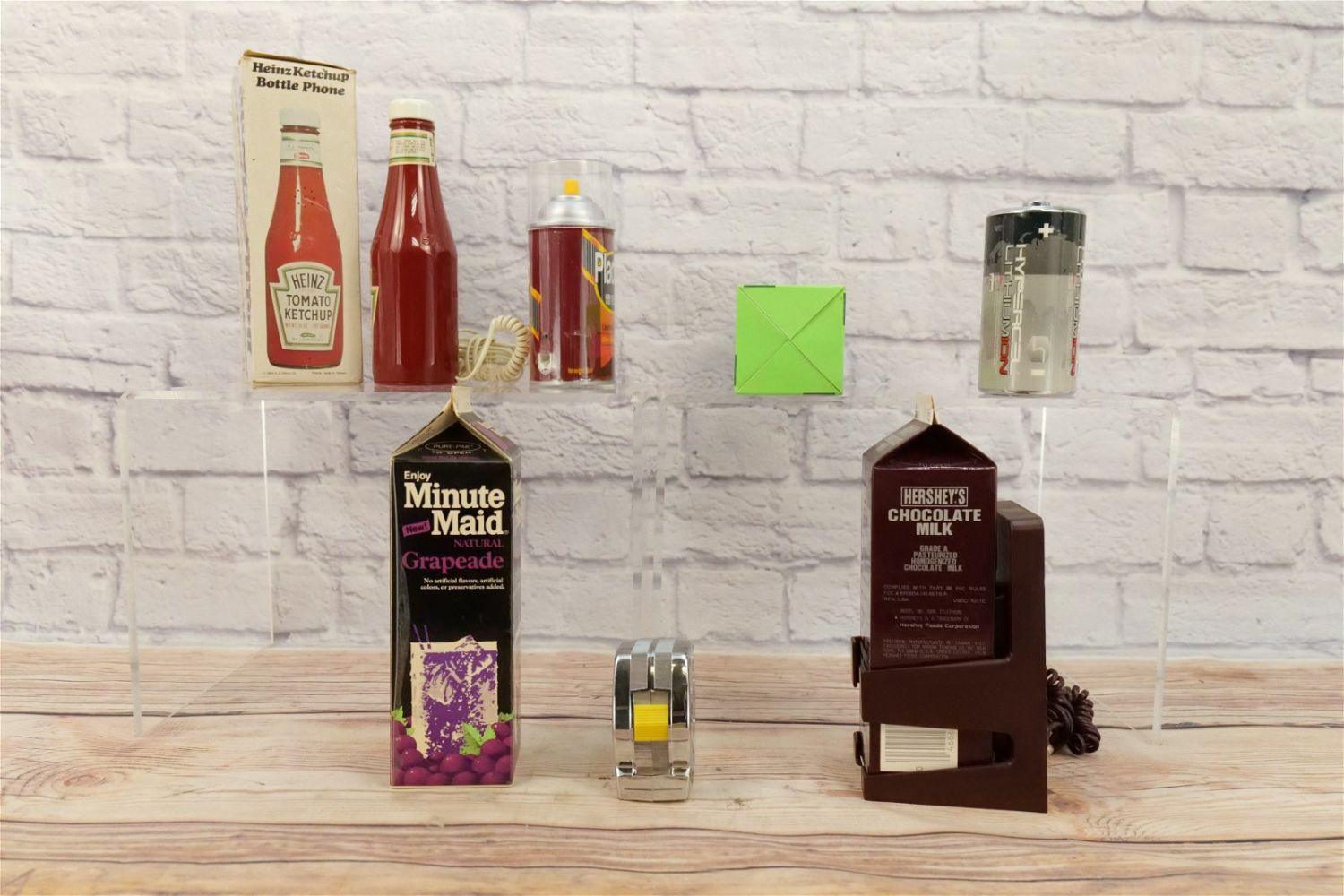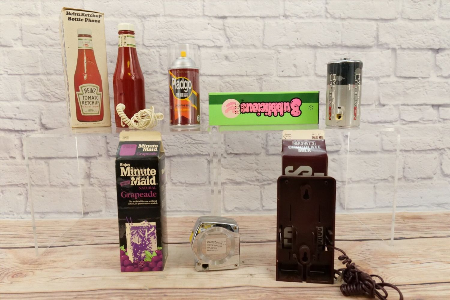 Lot of 7 Novelty Telephones including Hershey Chocolate Milk, Grape Ade, Bubblicious, Heinz Ketchup with Box, Lithium Ion Battery, Pledge Leather Care, and Stanley Tape Measurer. Largest measures 10" tall x 3" wide. This Collection was displayed in the house and all items are untested. All invoices must be paid within 24 hours of the sale. We offer multiple shipping options, please read the terms as they have changed. We also offer Pick-Ups Thursday, Friday, Saturday, and Monday immediately following the sale. BY APPOINTMENT ONLY. PLEASE READ THE NEW TERMS!!!