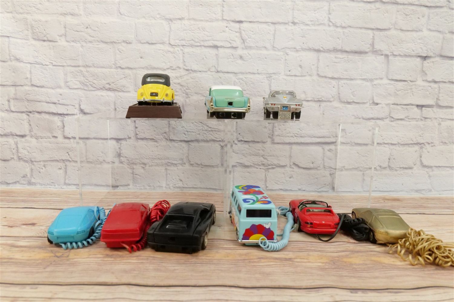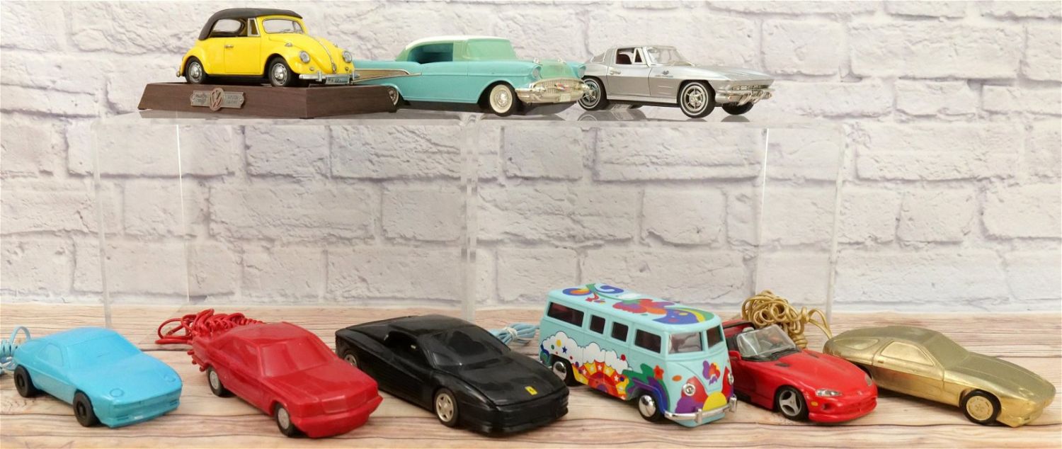 Lot of 9 Car Novelty Telephones including VW Bus, VW Beetle, Corvette, 57 Chevy and More. Largest measures 3" tall x 10.25" wide. This Collection was displayed in the house and all items are untested. All invoices must be paid within 24 hours of the sale. We offer multiple shipping options, please read the terms as they have changed. We also offer Pick-Ups Thursday, Friday, Saturday, and Monday immediately following the sale. BY APPOINTMENT ONLY. PLEASE READ THE NEW TERMS!!!