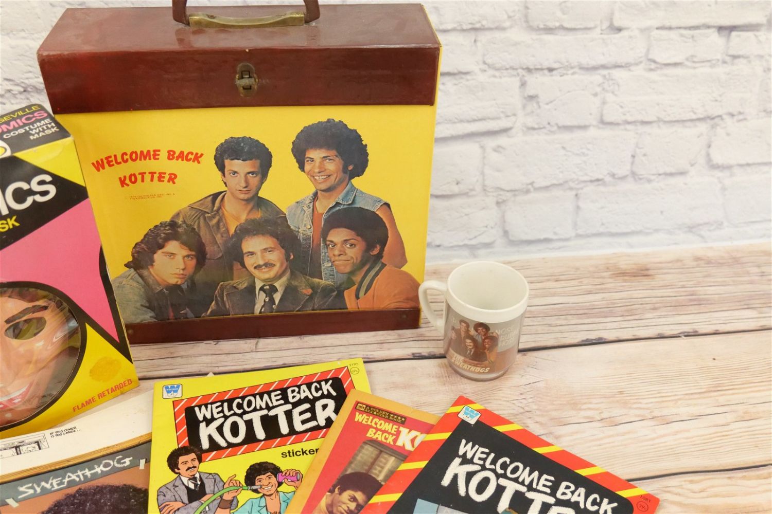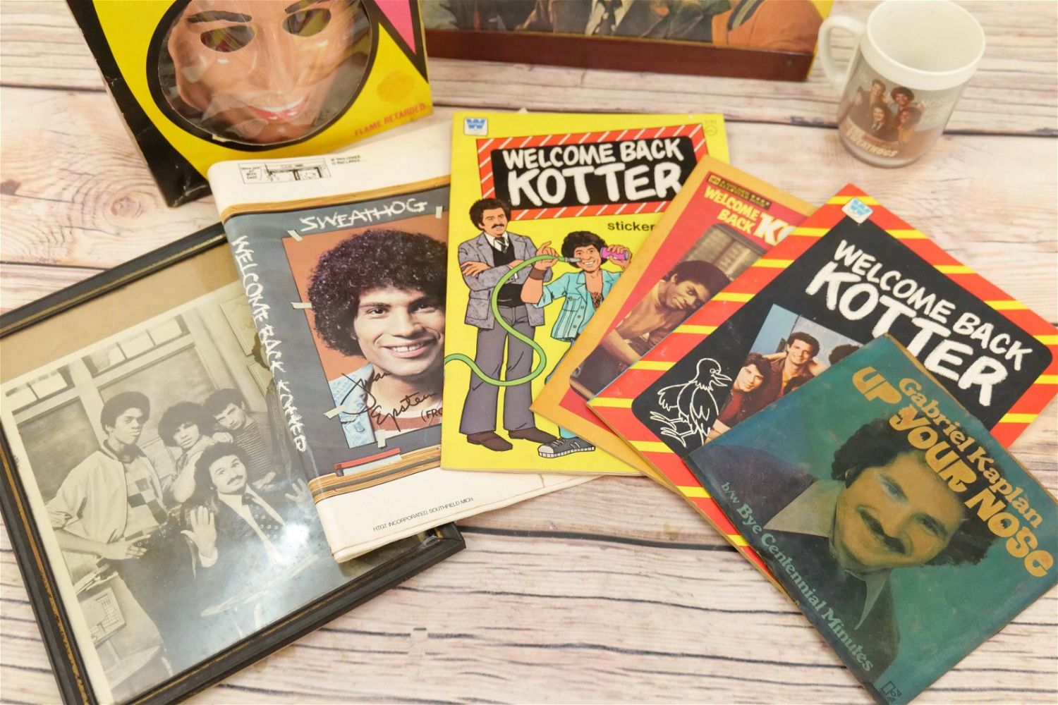 Lot of Welcome Back Kotter Collectibles including Collegeville John Travolta Barbarino Costume with Mask – Size Large, Barbarino Plastic Cup, Record Case, and Other Various Paper and Books. All invoices must be paid for within 24 hours. We offer multiple shipping options, please read the terms as they have changed. We also offer pick ups on Friday, Saturday and Monday immediately following the sale BY APPOINTMENT ONLY. PLEASE READ THE TERMS!!!
