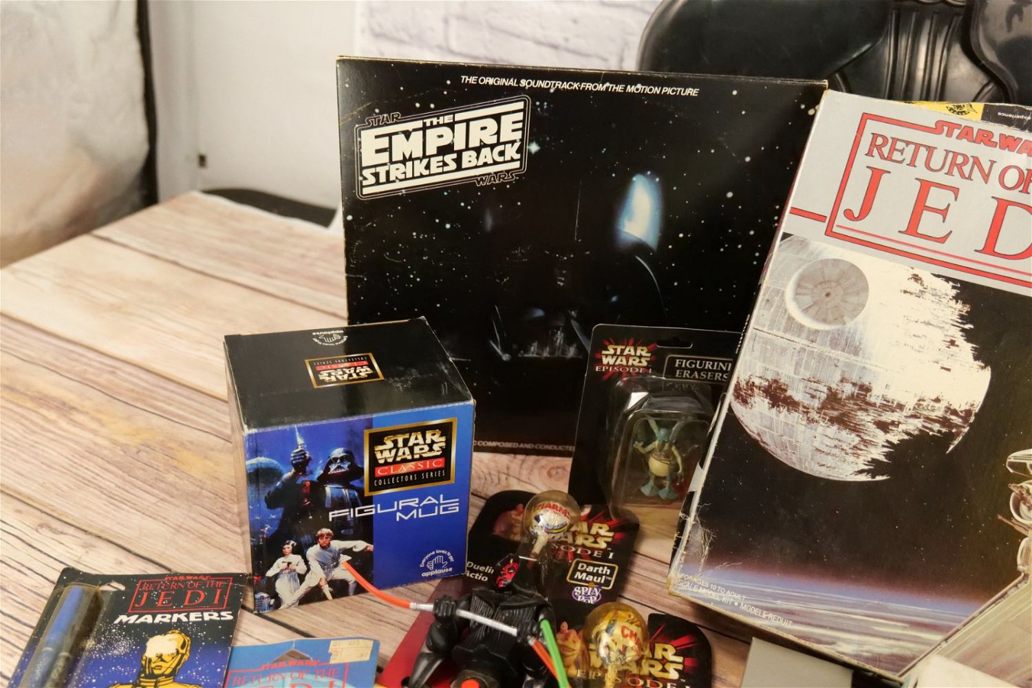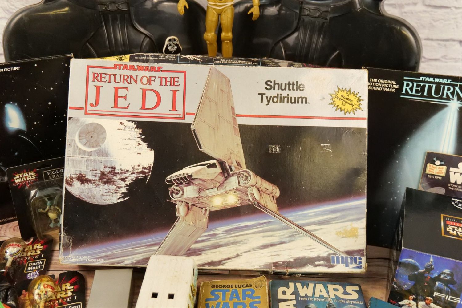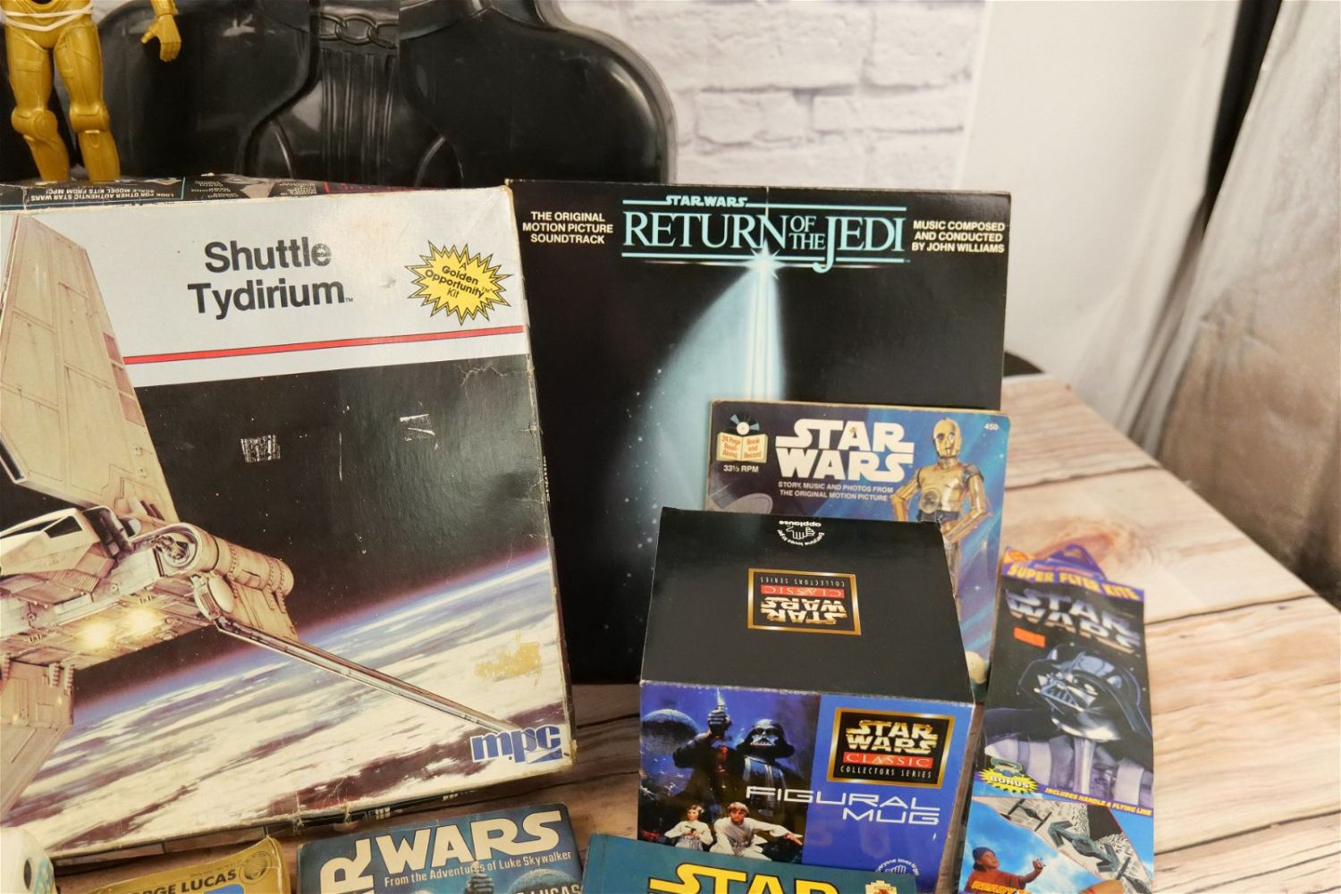 Lot of Mixed Star Wars Collectibles including (2) Darth Vader Action Figure Carrying Cases (One has Empire Strikes Back Stickers and Other has Return of the Jedi Stickers), Super Flyer Kite in Package, ROTJ Pen in Package, ROTJ Eraser on Card, ROTJ Shuttle Tydirium Model Kit by MPC with Box, Figural Mugs, Records, Books, and More. All invoices must be paid for within 24 hours. We offer multiple shipping options, please read the terms as they have changed. We also offer pick ups on Friday, Saturday and Monday immediately following the sale BY APPOINTMENT ONLY. PLEASE READ THE TERMS!!!