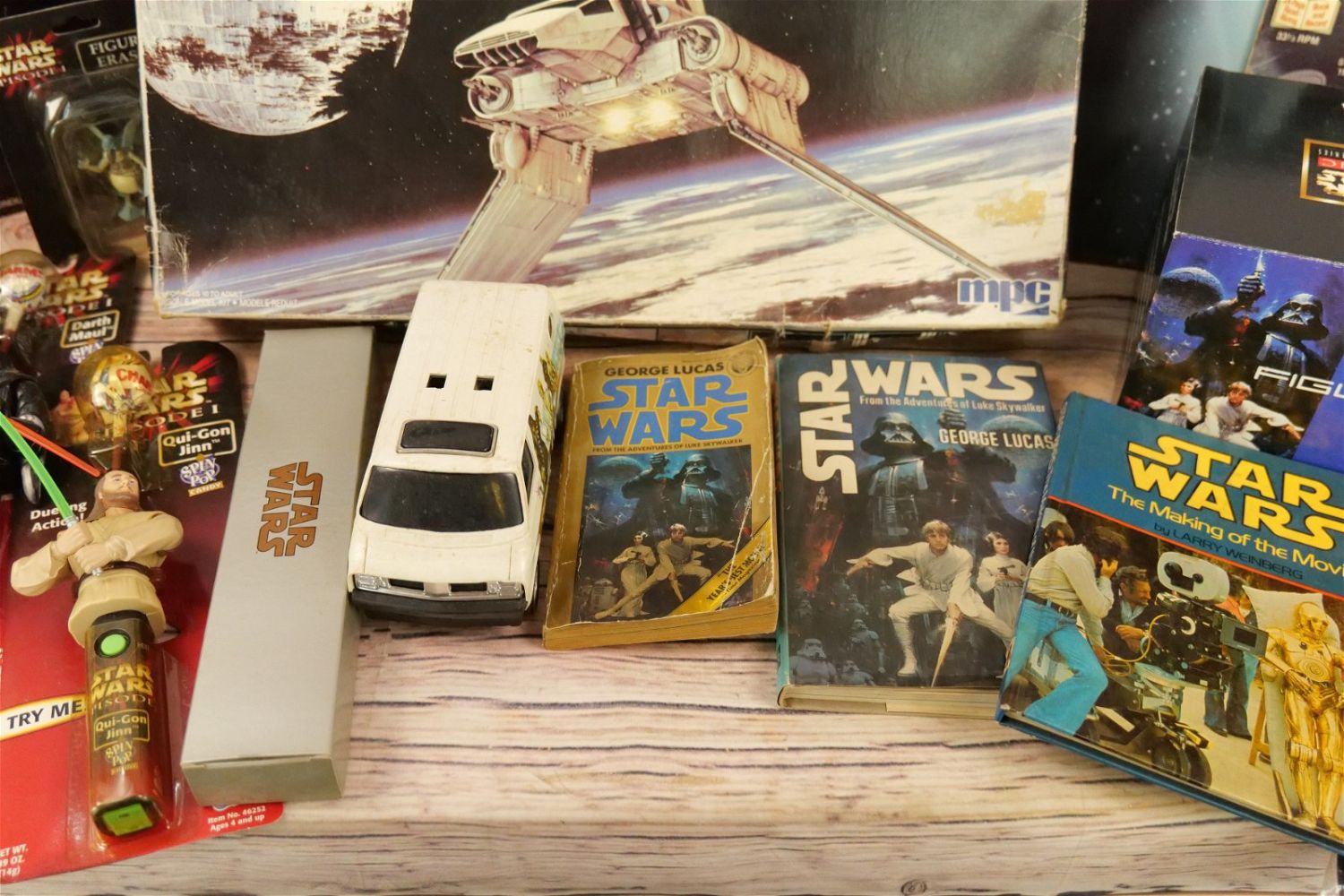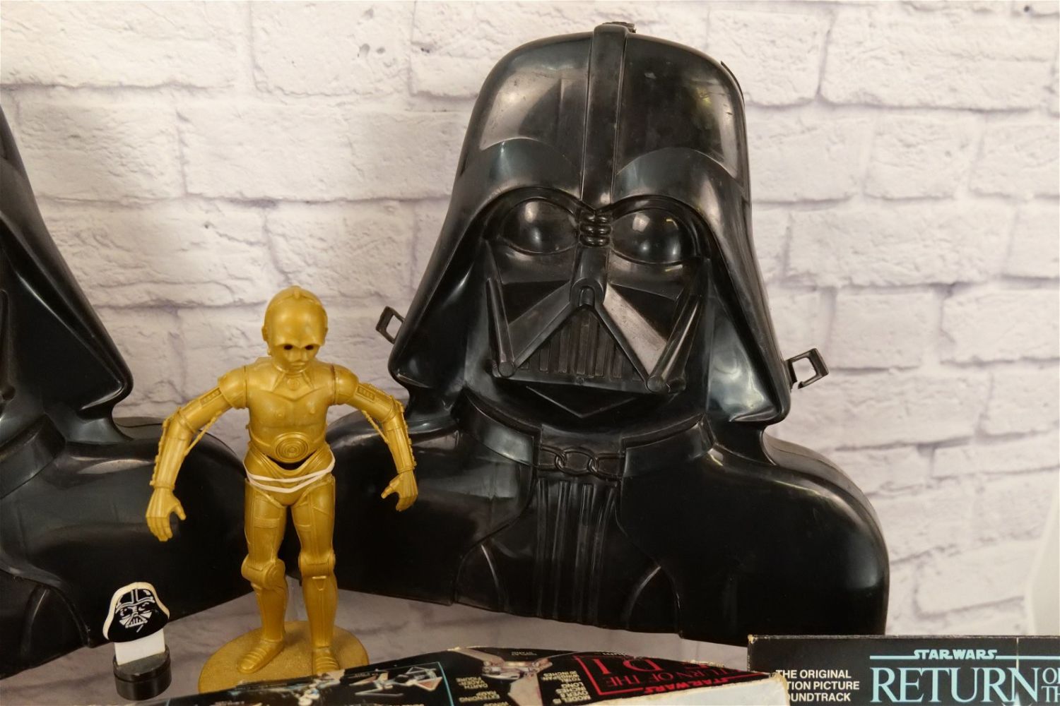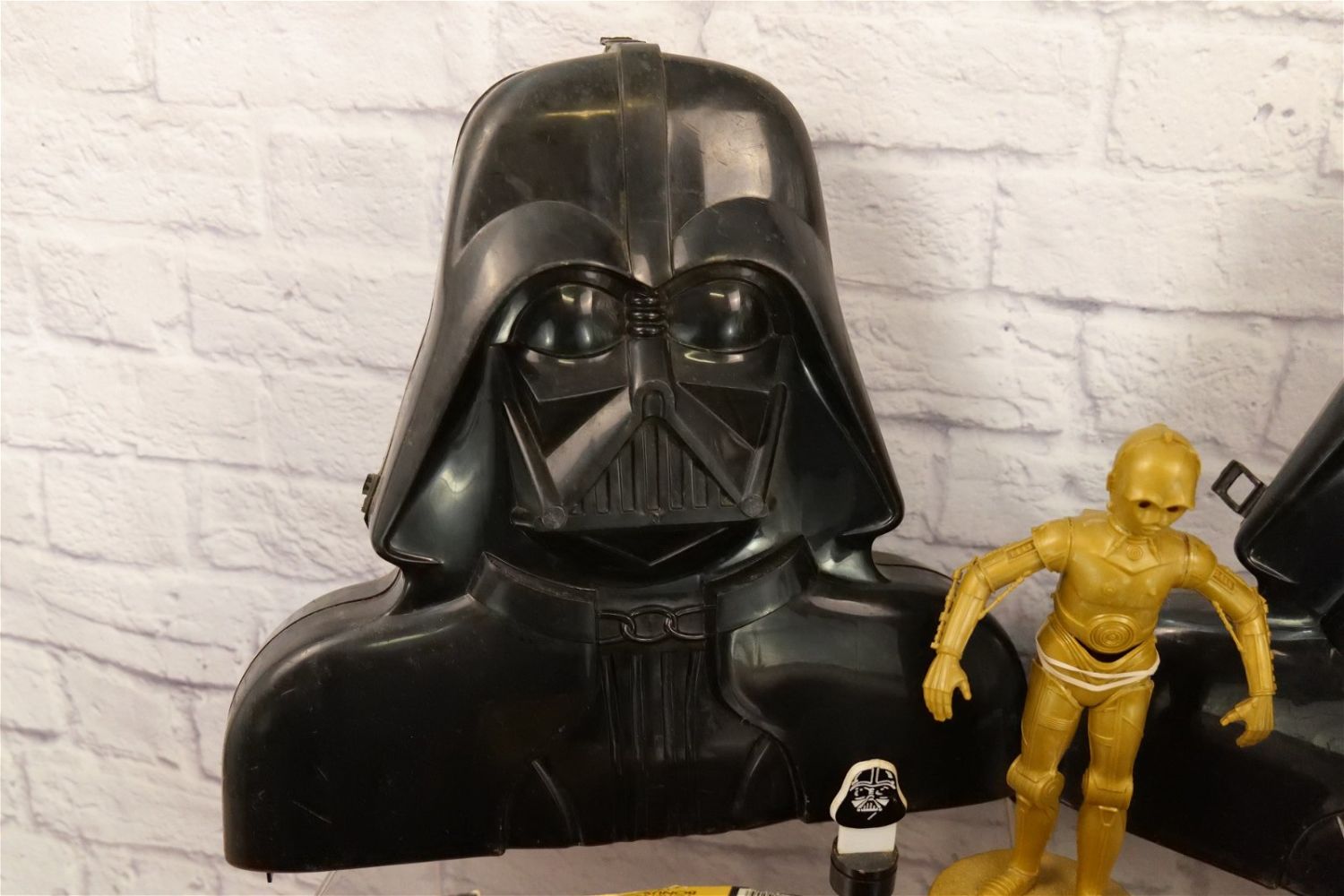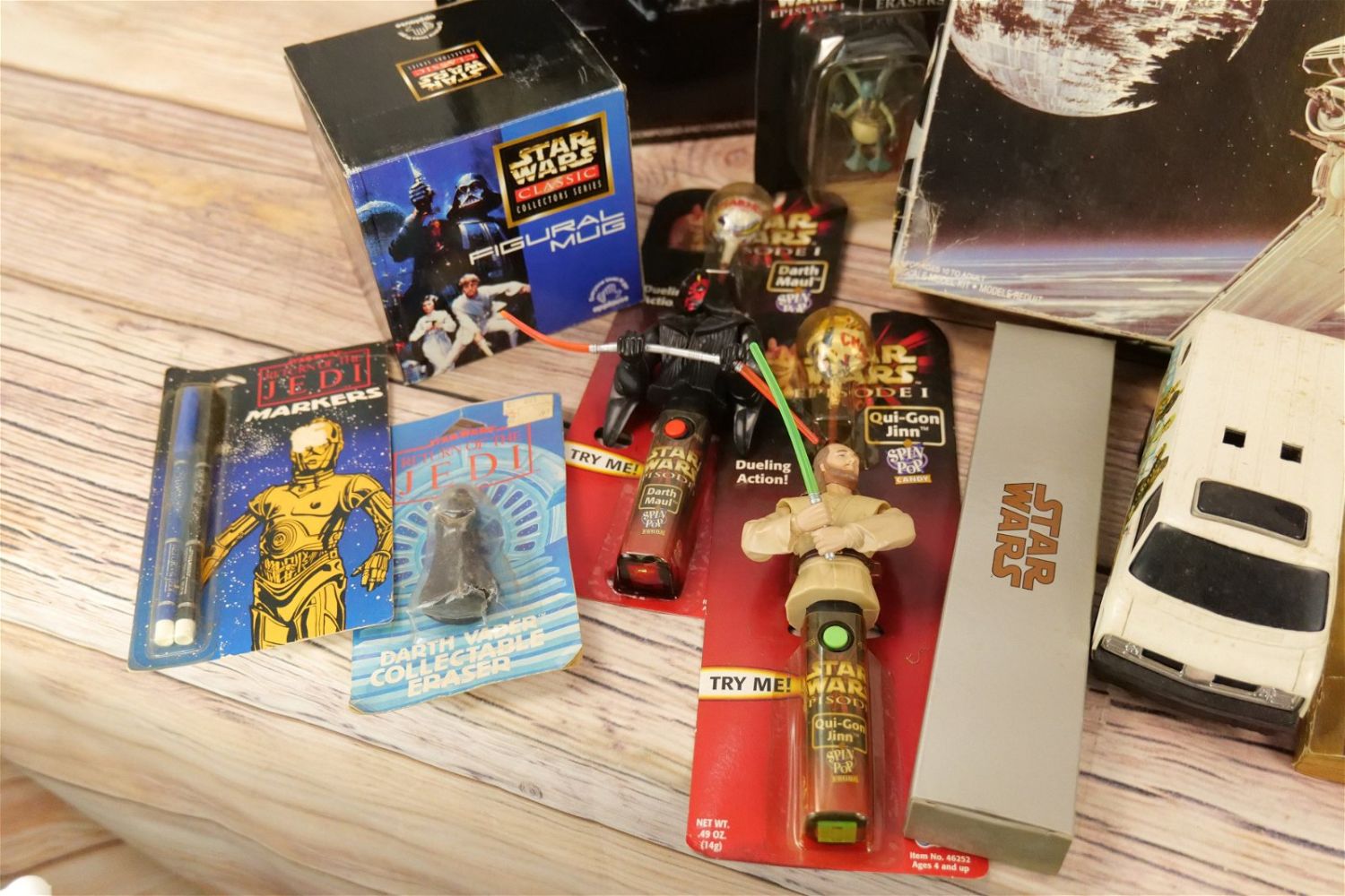 Lot of Mixed Star Wars Collectibles including (2) Darth Vader Action Figure Carrying Cases (One has Empire Strikes Back Stickers and Other has Return of the Jedi Stickers), Super Flyer Kite in Package, ROTJ Pen in Package, ROTJ Eraser on Card, ROTJ Shuttle Tydirium Model Kit by MPC with Box, Figural Mugs, Records, Books, and More. All invoices must be paid for within 24 hours. We offer multiple shipping options, please read the terms as they have changed. We also offer pick ups on Friday, Saturday and Monday immediately following the sale BY APPOINTMENT ONLY. PLEASE READ THE TERMS!!!