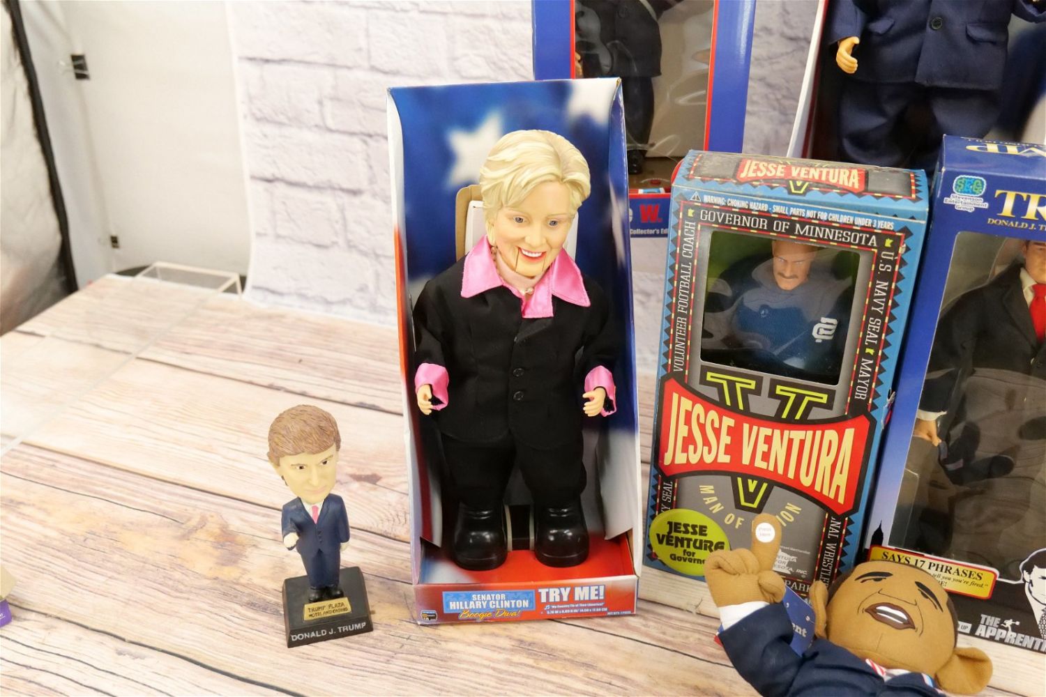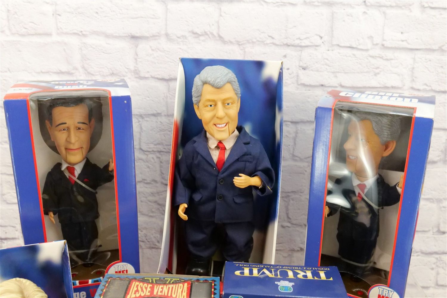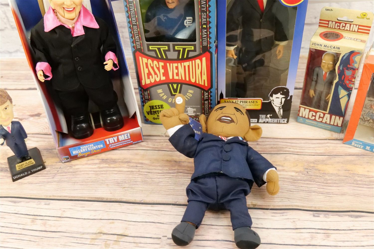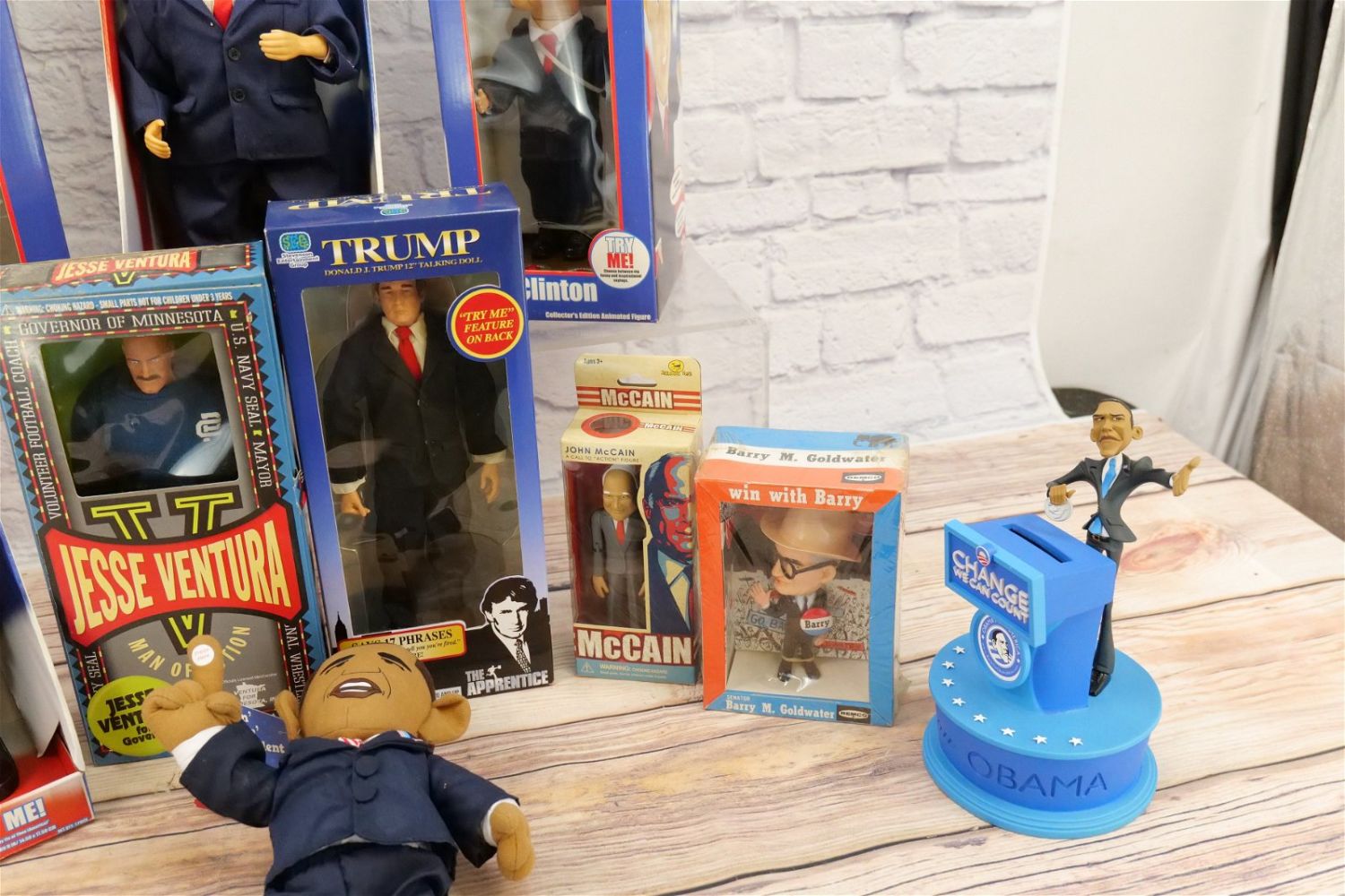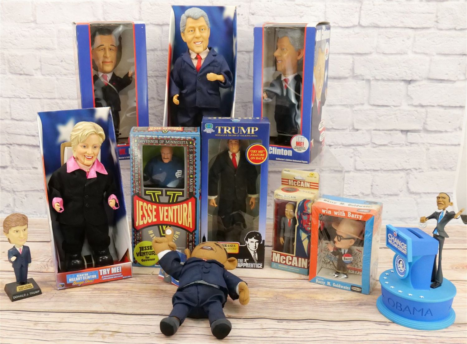 Lot of Collectible Political Figures including Remco Senator Barry M. Goldwater, Jesse Ventura for Governor, Senator Hillary Clinton Boogie Diva, John McCain Figure, Bill Clinton Animated Figure, Bill Clinton Dancin’ Machine, Trump Talking Doll, George Bush Animated Figure, Trump Bobblehead, Obama Plush, and Obama Bank. Some of the batteries in the animated figures have died. All invoices must be paid for within 24 hours. We offer multiple shipping options, please read the terms as they have changed. We also offer pick ups on Friday, Saturday and Monday immediately following the sale BY APPOINTMENT ONLY. PLEASE READ THE TERMS!!!