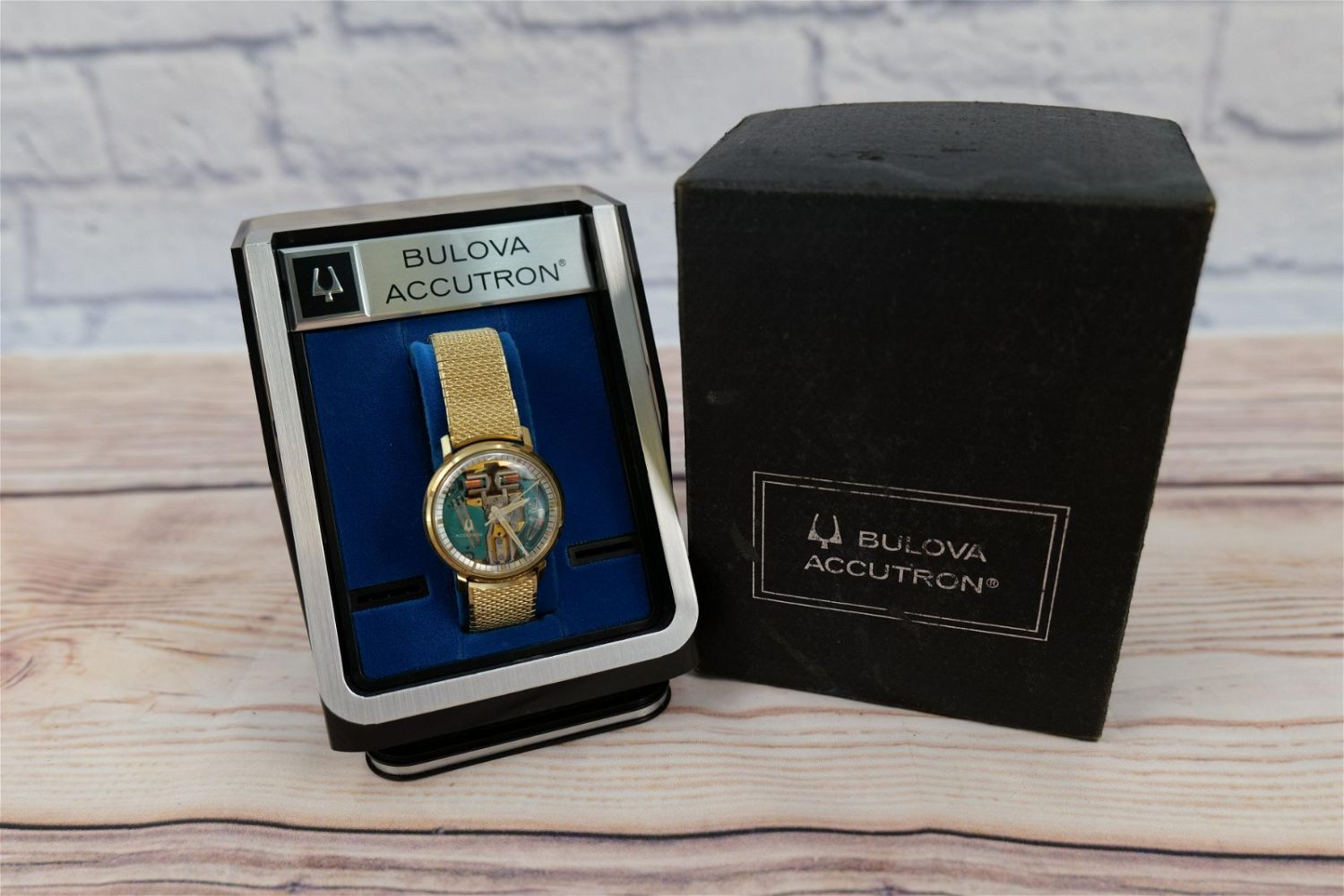 Bulova Accutron 214 Spaceview 10kt Gold Plated Tuning Fork Watch with Speidel Band. Serial No. E98013. In Original Box with original outer box. Not running – Needs battery. All invoices must be paid for within 24 hours. We offer multiple shipping options, please read the terms as they have changed. We also offer pick ups on Friday, Saturday and Monday immediately following the sale BY APPOINTMENT ONLY. PLEASE READ THE TERMS!!!