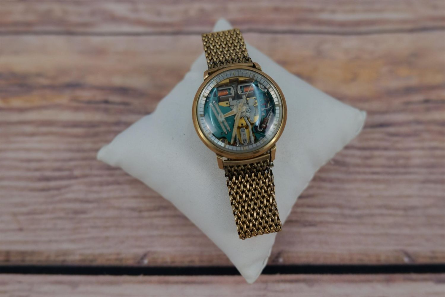 Bulova Accutron 214 Spaceview Tuning Fork Watch with 10kt Gold Filled Bezel and Stainless Back with Gold Filled Band. Serial No. H27425. Not running – Needs battery. Measures approx. 7" on the inside. All invoices must be paid for within 24 hours. We offer multiple shipping options, please read the terms as they have changed. We also offer pick ups on Friday, Saturday and Monday immediately following the sale BY APPOINTMENT ONLY. PLEASE READ THE TERMS!!!