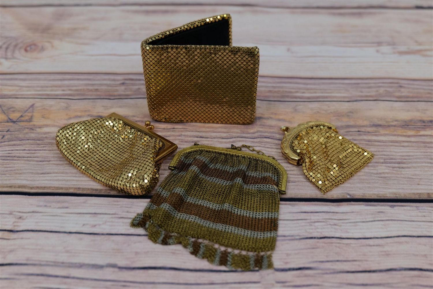 Lot of 4 Coin Purses/Wallets. One coin purse and one wallet are signed Whiting & Davis and 1 is Art Deco Style Tri-Colored Coin Purse. Measures between 3.5" and 5" long. All invoices must be paid for within 24 hours. We offer multiple shipping options, please read the terms as they have changed. We also offer pick ups on Friday, Saturday and Monday immediately following the sale BY APPOINTMENT ONLY. PLEASE READ THE TERMS!!!