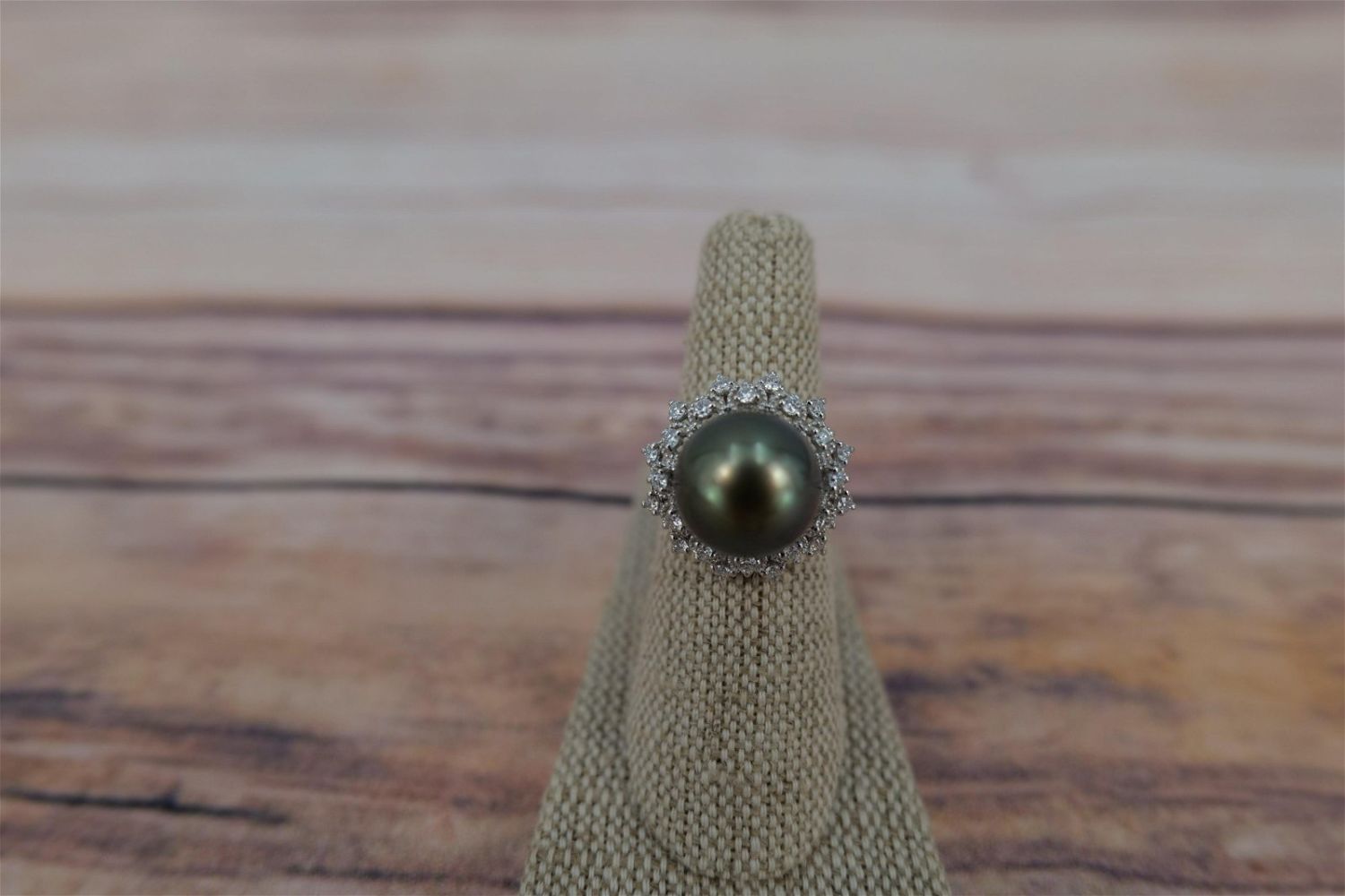 Platinum Tahitian Pearl and Diamond Ring. Has a 13mm cultured Tahitian Pearl and 24 natural round brilliant cut diamonds. Has one spot on the face of pearl. Ring size 7. Comes with AIGL Report. All invoices must be paid for within 24 hours. We offer multiple shipping options, please read the terms as they have changed. We also offer pick ups on Friday, Saturday and Monday immediately following the sale BY APPOINTMENT ONLY. PLEASE READ THE TERMS!!!