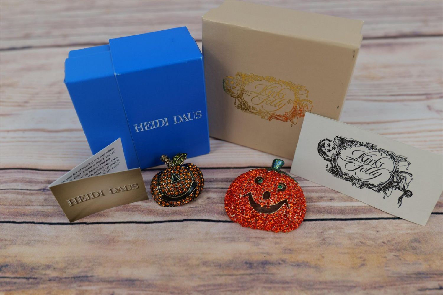 Pair of designer pumpkin pins including a Kirk’s Folly pumpkin pin with orange and green crystals throughout. Measures approx. 2" across and a Heidi Daus pumpkin pin with brown, green and orange crystals throughout. Measures approx. 1 1/2" across. Both come in the original box. All invoices must be paid for within 24 hours. We offer multiple shipping options, please read the terms as they have changed. We also offer pick ups on Friday, Saturday and Monday immediately following the sale BY APPOINTMENT ONLY. PLEASE READ THE TERMS!!!