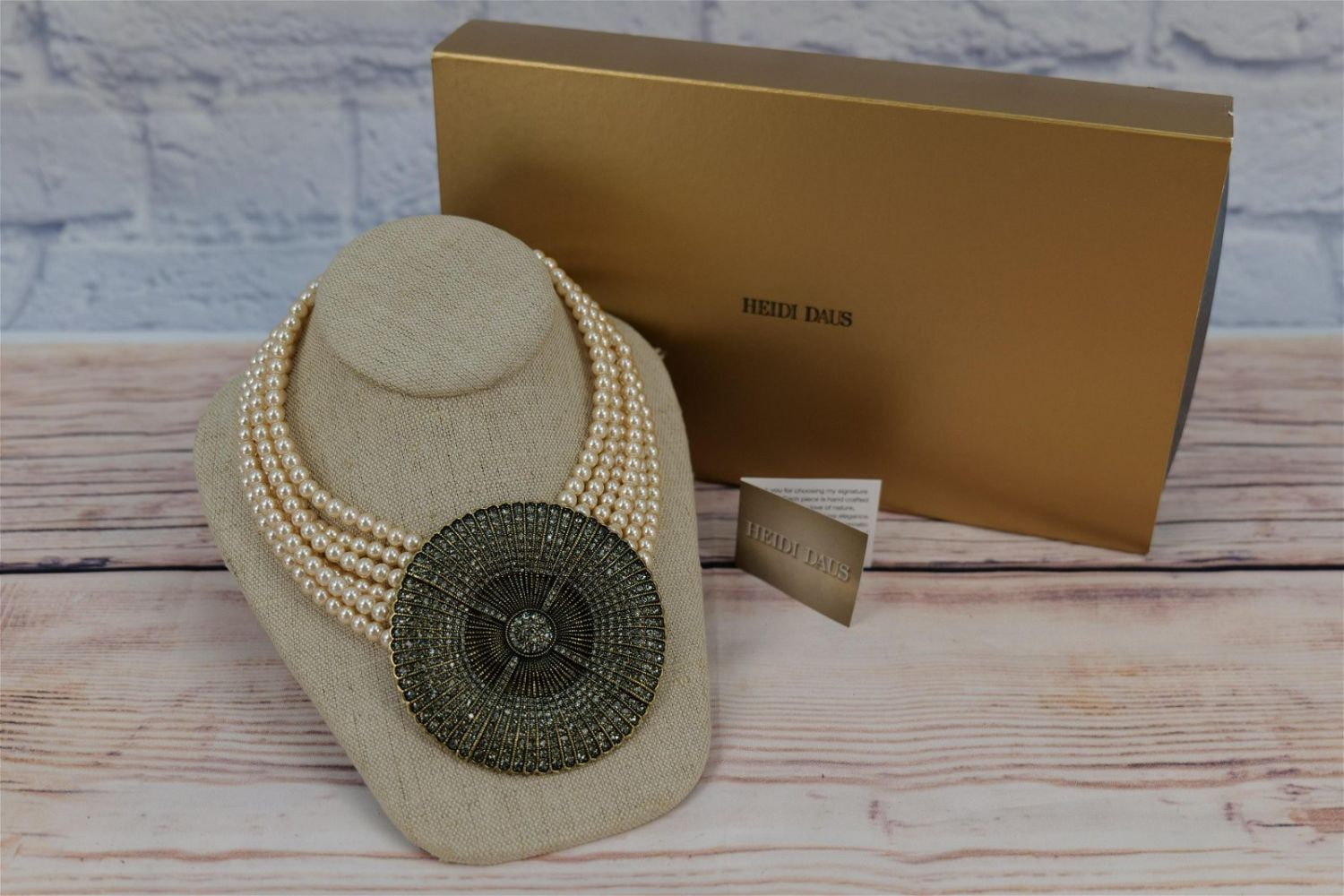 Heidi Daus oversized faux pearl and crystal necklace. Has 6 strands of faux pearls attached at the top by a gold tone band with crystals and a large circular gold/brass tone pendant with clear round cut crystals. Is a truly impressive piece! Measures approx. 18". Has the original box, paperwork and outer sleeve. All invoices must be paid for within 24 hours. We offer multiple shipping options, please read the terms as they have changed. We also offer pick ups on Friday, Saturday and Monday immediately following the sale BY APPOINTMENT ONLY. PLEASE READ THE TERMS!!!