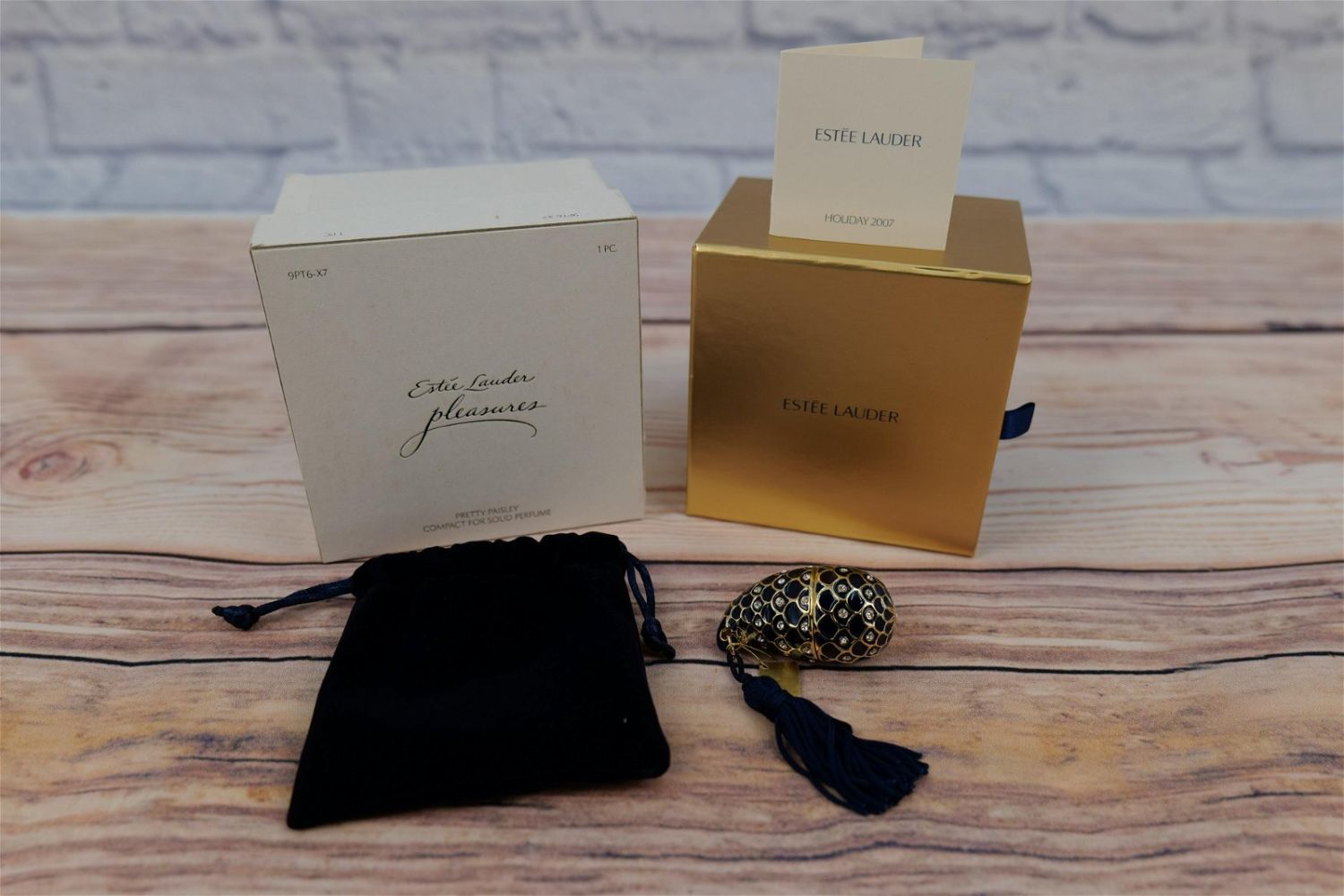Estee Lauder Pretty Paisley perfume compact from the 2007 Holiday Collection. Hand crafted by artisans, this piece is done in a gold tone with blue enamel and clear crystals. Hass never been used and comes in the original box with the bag, paperwork, original tag attached and outer box. Measures approx. 2" long. All invoices must be paid for within 24 hours. We offer multiple shipping options, please read the terms as they have changed. We also offer pick ups on Friday, Saturday and Monday immediately following the sale BY APPOINTMENT ONLY. PLEASE READ THE TERMS!!!