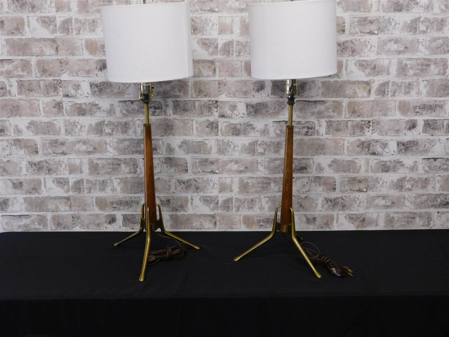 Pair of mid century modern table lamps. In the manor of Gerald Thurston. Measures approx. 31" t x 10" diameter on the shade. All invoices must be paid for within 24 hours. We offer multiple shipping options, please read the terms as they have changed. We also offer pick ups on Friday, Saturday and Monday immediately following the sale BY APPOINTMENT ONLY. PLEASE READ THE TERMS!!!